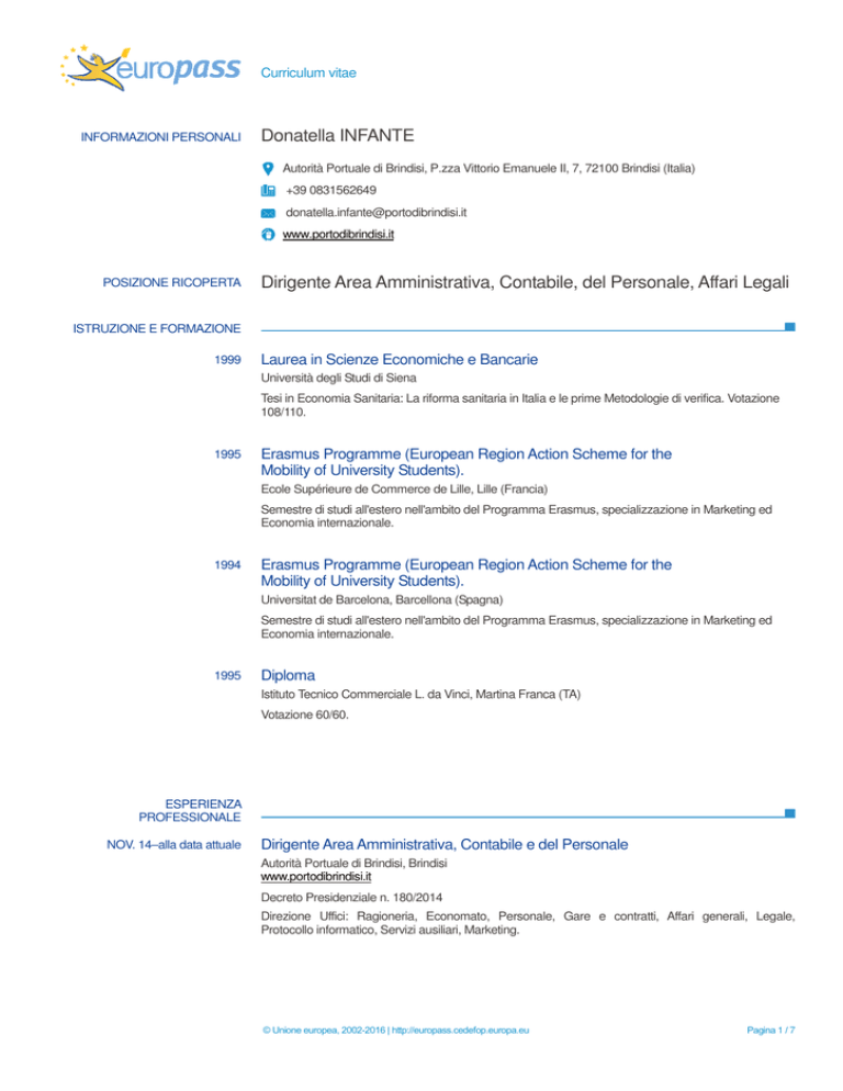 Curriculum vitae INFORMAZIONI PERSONALI Donatella INFANTE Autorità Portuale di Brindisi, P.zza Vittorio Emanuele II, 7, 72100 Brindisi (Italia) +39 0831562649 [email protected] www.portodibrindisi.it POSIZIONE RICOPERTA Dirigente Area Amministrativa, Contabile, del Personale, Affari Legali ISTRUZIONE E FORMAZIONE 1999 Laurea in Scienze Economiche e Bancarie Università degli Studi di Siena Tesi in Economia Sanitaria: La riforma sanitaria in Italia e le prime Metodologie di verifica. Votazione 108/110. 1995 Erasmus Programme (European Region Action Scheme for the Mobility of University Students). Ecole Supérieure de Commerce de Lille, Lille (Francia) Semestre di studi all'estero nell'ambito del Programma Erasmus, specializzazione in Marketing ed Economia internazionale. 1994 Erasmus Programme (European Region Action Scheme for the Mobility of University Students). Universitat de Barcelona, Barcellona (Spagna) Semestre di studi all'estero nell'ambito del Programma Erasmus, specializzazione in Marketing ed Economia internazionale. 1995 Diploma Istituto Tecnico Commerciale L. da Vinci, Martina Franca (TA) Votazione 60/60. ESPERIENZA PROFESSIONALE NOV. 14–alla data attuale Dirigente Area Amministrativa, Contabile e del Personale Autorità Portuale di Brindisi, Brindisi www.portodibrindisi.it Decreto Presidenziale n. 180/2014 Direzione Uffici: Ragioneria, Economato, Personale, Gare e contratti, Affari generali, Legale, Protocollo informatico, Servizi ausiliari, Marketing. © Unione europea, 2002-2016 | http://europass.cedefop.europa.eu Pagina 1 / 7 AGO. 14–NOV. 14 Consulente Autorità Portuale di Brindisi, Brindisi www.portodibrindisi.it Decreto Presidenziale n. 115/2014. Supporto alla stesura della contrattazione decentrata di II livello 2013-2016; Supporto all'Area amministrativa e contabile; Implementazione PCC (Piattaforma certificazione crediti); Supporto area personale; Analisi procedure interne; Supporto implementazione nuova procedura informatica COELDA; attività propedeutiche all'assestamento del bilancio di previsione 2014; attività propedeutiche al bilancio di previsione 2015 e relativi allegati. AGO. 11–AGO. 14 Consulente aziendale Libero professionista Stesura bilancio civilistico/fiscale annuale; Contabilità fornitori, clienti, co.ge, banche; Recupero crediti, invio F24; Espletamento pratiche Co.fidi e di affido bancario; Formazione clienti su procedure informatiche di contabilità; Rilevazione criticità di sistema e di processi aziendali e delle procedure informatiche; Implementazione procedure di controllo e monitoraggio del sistema contabileamministrativo; Contabilità di magazzino; Analisi gestione commesse. NOV. 10–SET. 11 Responsabile Contabile-Amministrativo Fantasia S.r.l., Martina Franca (TA) Stesura bilancio civilistico/fiscale annuale; Contabilità fornitori, clienti, co.ge, banche; Studi di settore; Recupero crediti, invio F24; Attività di marketing commerciale e fidelizzazione clienti; Espletamento pratiche di affido bancario; Gestione dei rapporti con il personale; Gestione dei rapporti dei 4 punti vendita: Taranto, Martina Franca; Potenza e Bari; Formazione del personale su gestionale ad hoc Zucchetti modulo magazzino, contabilità e glamour (fidelizzazione clienti e tessere sconto); Formazione del personale su gestionale Team System, modulo contabilità. NOV. 07–GEN. 10 Consulente IACP, Taranto Provvedimento del Commissario Straordinario n. 107/2007, n. 88/2008, n. 124/2008, n. 5/2009, n. 73/2009). Predisposizione ed elaborazione dei Rendiconti Finanziari anni 2201, 2202, 2003, 2004, 2005, 2006, 2007, 2008. Rilevazione criticità di sistema e di processi; Analisi delle procedure e delle contabilità settoriali; Analisi e riprogettazione dei processi aziendali e delle procedure informatiche; Implementazione delle procedure di controllo e monitoraggio del sistema contabile-amministrativo; Verifica preliminare degli archivi informatici attraverso l'elaborazione di uno specifico programma finalizzato al reperimento delle anomalie; Riaccertamento dei residui attivi e passivi per gli esercizi dal 2001 al 2008 e successiva predisposizione di note contabili inviate ai responsabili di servizio; Supporto nella predisposizione delle relazioni tecnico-amministrativo e del Commissario Straordinario; Supporto al Collegio dei Revisori e all'Ufficio Controllo di Gestione; Creazione dei supporti informatici per la elaborazione dei rendiconti finanziari e per la predisposizione dei conti economici; Ricostruzione degli archivi contabili dal 2001 al 2008; Formazione del personale du gestionale GCS Modulo Gelim e Gefin. Analisi e ricognizione dei residui attivi e passivi anni dal 1982 al 2008. Estrazione dalla procedura dei residui attivi e passivi anni 1982-2008; Elaborazione e riclassificazione degli stessi per anno di formazione, per cliente/fornitore, per significatività; Predisposizione di uno specifico programma di valutazione della sussistenza dei residui; Supporto ai responsabili dei servizi ai fini del mantenimento o meno in contabilità dei residui stessi in base alla verifica di applicabilità degli istituti giuridici della perenzione e prescrizione. NOV. 08–DIC. 09 Dirigente Contabile-Amministrativo Speziale S.r.l. Azienda tessile di produzione e commercializzazione di abbigliamento uomo con vendita all'ingrosso e © Unione europea, 2002-2016 | http://europass.cedefop.europa.eu Pagina 2 / 7 Curriculum vitae al dettaglio tramite propri punti vendita. Stesura bilancio civilistico/fiscale annuale; Contabilità fornitori, clienti, co.ge, banche; Recupero crediti, invio F24; Attività di fidelizzazione clienti (fidelity card); Gestione dei rapporti commerciali e finanziari con i fornitori esteri (Cina ed Albania): predisposizione lettere di credito, procedure di sdoganamento containers; Espletamento pratiche di affido bancario; Gestione del personale; Gestione delle unità locali di vendita presenti in Italia, n. 10 punti vendita: Bassano del Grappa, Mantova
