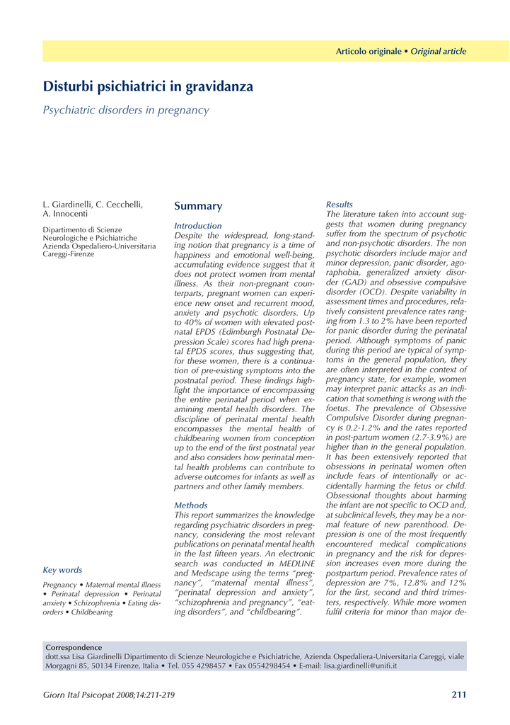 Articolo originale • Original article Disturbi psichiatrici in gravidanza Psychiatric disorders in pregnancy L. Giardinelli, C. Cecchelli, A. Innocenti Dipartimento di Scienze Neurologiche e Psichiatriche Azienda Ospedaliero-Universitaria Careggi-Firenze Key words Pregnancy • Maternal mental illness • Perinatal depression • Perinatal anxiety • Schizophrenia • Eating disorders • Childbearing Summary Introduction Despite the widespread, long-standing notion that pregnancy is a time of happiness and emotional well-being, accumulating evidence suggest that it does not protect women from mental illness. As their non-pregnant counterparts, pregnant women can experience new onset and recurrent mood, anxiety and psychotic disorders. Up to 40% of women with elevated postnatal EPDS (Edimburgh Postnatal Depression Scale) scores had high prenatal EPDS scores, thus suggesting that, for these women, there is a continuation of pre-existing symptoms into the postnatal period. These findings highlight the importance of encompassing the entire perinatal period when examining mental health disorders. The discipline of perinatal mental health encompasses the mental health of childbearing women from conception up to the end of the first postnatal year and also considers how perinatal mental health problems can contribute to adverse outcomes for infants as well as partners and other family members. Methods This report summarizes the knowledge regarding psychiatric disorders in pregnancy, considering the most relevant publications on perinatal mental health in the last fifteen years. An electronic search was conducted in MEDLINE and Medscape using the terms “pregnancy”, “maternal mental illness”, “perinatal depression and anxiety”, “schizophrenia and pregnancy”, “eating disorders”, and “childbearing”. Results The literature taken into account suggests that women during pregnancy suffer from the spectrum of psychotic and non-psychotic disorders. The non psychotic disorders include major and minor depression, panic disorder, agoraphobia, generalized anxiety disorder (GAD) and obsessive compulsive disorder (OCD). Despite variability in assessment times and procedures, relatively consistent prevalence rates ranging from 1.3 to 2% have been reported for panic disorder during the perinatal period. Although symptoms of panic during this period are typical of symptoms in the general population, they are often interpreted in the context of pregnancy state, for example, women may interpret panic attacks as an indication that something is wrong with the foetus. The prevalence of Obsessive Compulsive Disorder during pregnancy is 0.2-1.2% and the rates reported in post-partum women (2.7-3.9%) are higher than in the general population. It has been extensively reported that obsessions in perinatal women often include fears of intentionally or accidentally harming the fetus or child. Obsessional thoughts about harming the infant are not specific to OCD and, at subclinical levels, they may be a normal feature of new parenthood. Depression is one of the most frequently encountered medical complications in pregnancy and the risk for depression increases even more during the postpartum period. Prevalence rates of depression are 7%, 12.8% and 12% for the first, second and third trimesters, respectively. While more women fulfil criteria for minor than major de- Correspondence dott.ssa Lisa Giardinelli Dipartimento di Scienze Neurologiche e Psichiatriche, Azienda Ospedaliera-Universitaria Careggi, viale Morgagni 85, 50134 Firenze, Italia • Tel. 055 4298457 • Fax 0554298454 • E-mail: [email protected] Giorn Ital Psicopat 2008;14:211-219 211 L. Giardinelli, et al. pression at this time, minor depression is associated with significant disability because it can be associated with other disorders. Like major depressive disorder, bipolar disorder (BD) affects pregnant women and poses substantial risk to the mother and foetus. Both schizophrenic and affective disorder patients have increased risk for symptom exacerbation during the immediate postpartum period. Individuals with any form of previous or current eating disorder who become pregnant represent a complex challenge for the clinician. The personality of the individual with an eating disorder may hamper mater- Introduzione I recenti sviluppi nello studio della salute mentale in gravidanza e nel puerperio hanno indotto uno shift dallo stretto concetto di Psicopatologia del postpartum alla considerazione di uno spettro di disturbi depressivi e d’ansia insorgenti nel periodo perinatale. La disciplina della Salute Mentale Perinatale, in rapida evoluzione, si occupa infatti dei disturbi psicopatologici che possono insorgere nella donna dal momento del concepimento fino al primo anno dal parto e insieme del benessere psicofisico sia del bambino che dell’intera famiglia 1. In disaccordo con i primi influenti report 2 che descrivevano la gravidanza come un periodo di relativo benessere e quasi “immunità” dai disturbi psichici, attualmente risulta sempre più rilevante in letteratura la testimonianza di patologia psichiatrica in tale periodo. Circa il 40% delle donne che soffrono di depressione postpartum e che hanno mostrato un elevato punteggio alla Edimburgh Postnatal Depression Scale (EPDS) 3 in epoca postnatale, hanno ottenuto un analogo valore riferito al periodo gravidico 4. Se spostiamo quindi il nostro punto di osservazione e dal focus sulla depressione postnatale ci allarghiamo ad esaminare lo spettro dei disturbi ansiosi e depressivi nel periodo perinatale, saremo in grado di operare più efficacemente sia in termini di screening precoce del rischio clinico, che di strategie di interventi mirati sui disturbi della donna e sulle conseguenze che la patologia può arrecare sul piano della relazione madre/bambino 5 . Un altro importante aspetto che viene sempre più considerato è l’impatto negativo che un disturbo mentale in gravi