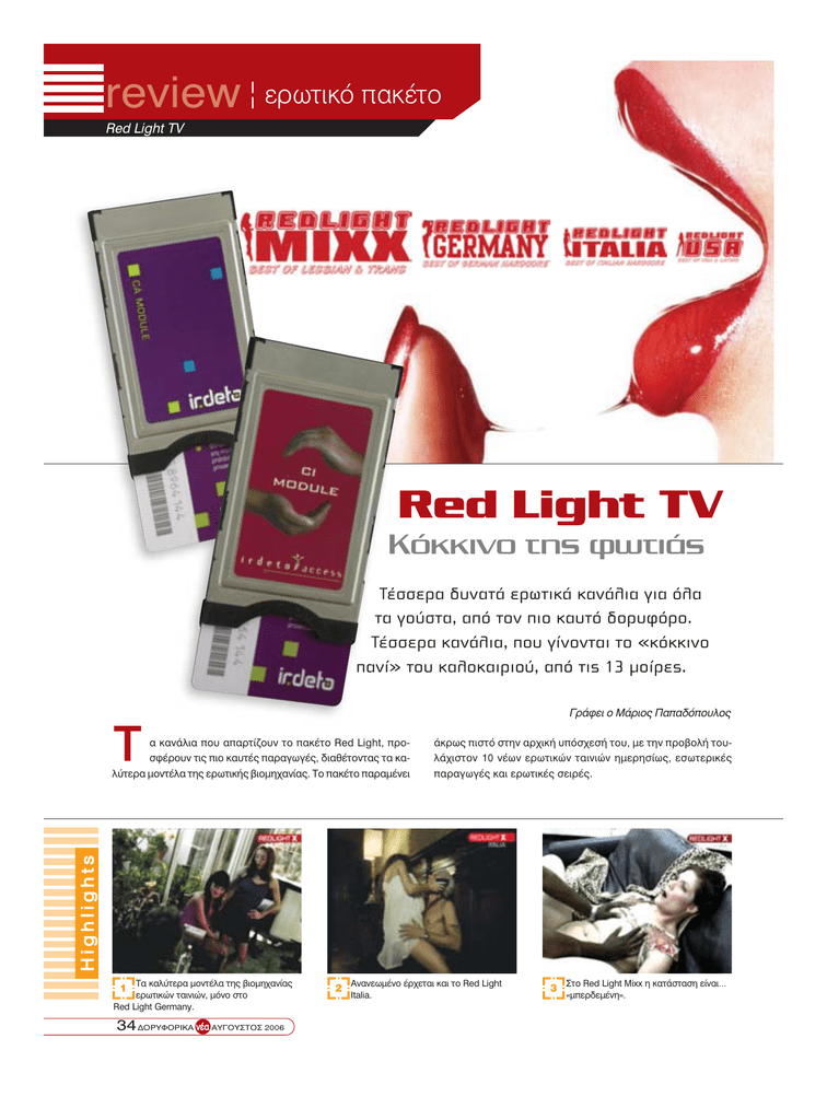review | ÂÚˆÙÈÎfi ·Î¤ÙÔ Red Light TV Red Light TV ∫fiÎÎÈÓÔ Ù˘ ʈÙÈ¿˜ ∆¤ÛÛÂÚ· ‰˘Ó·Ù¿ ÂÚˆÙÈο ηӿÏÈ· ÁÈ· fiÏ· Ù· ÁÔ‡ÛÙ·, ·fi ÙÔÓ ÈÔ Î·˘Ùfi ‰ÔÚ˘ÊfiÚÔ. ∆¤ÛÛÂÚ· ηӿÏÈ·, Ô˘ Á›ÓÔÓÙ·È ÙÔ «ÎfiÎÎÈÓÔ ·Ó›» ÙÔ˘ ηÏÔηÈÚÈÔ‡, ·fi ÙȘ 13 ÌÔ›Ú˜. °Ú¿ÊÂÈ Ô M¿ÚÈÔ˜ ¶··‰fiÔ˘ÏÔ˜ ∆ ¿ÎÚˆ˜ ÈÛÙfi ÛÙËÓ ·Ú¯È΋ ˘fiÛ¯ÂÛ‹ ÙÔ˘, Ì ÙËÓ ÚÔ‚ÔÏ‹ ÙÔ˘Ï¿¯ÈÛÙÔÓ 10 Ó¤ˆÓ ÂÚˆÙÈÎÒÓ Ù·ÈÓÈÒÓ ËÌÂÚËÛ›ˆ˜, ÂÛˆÙÂÚÈΤ˜ ·Ú·ÁˆÁ¤˜ Î·È ÂÚˆÙÈΤ˜ ÛÂÈÚ¤˜. ∏ighlights · ηӿÏÈ· Ô˘ ··ÚÙ›˙Ô˘Ó ÙÔ ·Î¤ÙÔ Red Light, ÚÔÛʤÚÔ˘Ó ÙȘ ÈÔ Î·˘Ù¤˜ ·Ú·ÁˆÁ¤˜, ‰È·ı¤ÙÔÓÙ·˜ Ù· ηχÙÂÚ· ÌÔÓ٤Ϸ Ù˘ ÂÚˆÙÈ΋˜ ‚ÈÔÌ˯·Ó›·˜. ∆Ô ·Î¤ÙÔ ·Ú·Ì¤ÓÂÈ 1 ∆· ηχÙÂÚ· ÌÔÓ٤Ϸ Ù˘ ‚ÈÔÌ˯·Ó›·˜ ÂÚˆÙÈÎÒÓ Ù·ÈÓÈÒÓ, ÌfiÓÔ ÛÙÔ Red Light Germany. 34 ¢√ƒÀº√ƒπ∫∞ Ó¤· ∞À°√À™∆√™ 2006 2 ∞Ó·Óˆ̤ÓÔ ¤Ú¯ÂÙ·È Î·È ÙÔ Red Light Italia. 3 ™ÙÔ Red Light Mixx Ë Î·Ù¿ÛÙ·ÛË Â›Ó·È… «ÌÂÚ‰Â̤ÓË». ªÂ Ì›· Ì·ÙÈ¿ ∆· ‚·ÛÈο straight ηӿÏÈ·, ÚÔÛʤÚÔ˘Ó ÛÙÔ˘˜ Û˘Ó‰ÚÔÌËÙ¤˜ ÙÔ˘˜ ˘ÂÚ·Ú·ÁˆÁ¤˜ ·fi ÙÔ ÈÙ·ÏÈÎfi, ÙÔ ÁÂÚÌ·ÓÈÎfi, ·ÏÏ¿ Î·È ÙÔ ·ÌÂÚÈοÓÈÎÔ ÂÚˆÙÈÎfi ÛÙÂÚ¤ˆÌ·, ÂÓÒ ‰ÂÓ Ï›ÂÈ ·fi ÙË «Û˘ÏÏÔÁ‹» Î·È ¤Ó· ηӿÏÈ ·ÏÏÈÒÙÈÎÔ ·fi Ù· ¿ÏÏ·, ÙÔ ÔÔ›Ô ¤Ú¯ÂÙ·È Ó· ηχ„ÂÈ ÙȘ ÂÈı˘Ì›Â˜, ·ÎfiÌ· Î·È ÙÔ˘ ÈÔ ··ÈÙËÙÈÎÔ‡ ÙËÏÂı·ً. ™˘ÁÎÂÎÚÈ̤ӷ, ÌÈϿ̠ÁÈ· Ù· straight Red Light Italia, Red Light Germany, Red Light USA Î·È ÙÔ ‘‰È·ÊÔÚÂÙÈÎfi’ Red Light ªixx, Ì Á‡ÛË ·fi Trans, Gay, Lesbian Î.¿. ™ÙÔ Red Light USA, ÔÈ Û˘Ó‰ÚÔÌËÙ¤˜ ı· ÌÔÚ¤ÛÔ˘Ó Ó· ¿ÚÔ˘Ó Î·È «Special» Á‡ÛÂȘ, ·fi ÂÚˆÙÈÎfi Latin ÂÚȯfiÌÂÓÔ. ¢ÔÚ˘ÊfiÚÔ˜: Hot µird 13E TP: 12.092∏ ¶fiψÛË: √ÚÈ˙fiÓÙÈ· ∫ˆ‰ÈÎÔÔ›ËÛË: Irdeto 2, Viaccess 2.5, ∆¯ÓÈο Conax ∏ smart card Ô˘ ¯ÚËÛÈÌÔÔÈ‹ıËΠÁÈ· ÙË ‰ÔÎÈÌ‹, ‹Ù·Ó ÌÈ· Irdeto 2 Epsilon Card, Ë ÔÔ›· ‰ÂÓ ÏÂÈÙÔ‡ÚÁËÛ ԇÙ Û Irdeto Cam, Blue Euro CI Ô‡Ù Û ÂÓۈ̷و̤ÓÔ UCAS. °È· ÙË ‰ÔÎÈÌ‹, ¯ÚËÛÈÌÔÔÈ‹ıËΠÂÎÙfi˜ ÙÔ˘ Irdeto CAM Î·È ¤Ó·˜ ‰¤ÎÙ˘ Humax 5400, Ì ÂÓۈ̷و̤ÓÔ UCAS (Tuning on Humax). ∞˘Ùfi Ô˘ ‰È·ÈÛÙÒÛ·ÌÂ Â›Ó·È fiÙÈ Ë Epsilon Card Â›Ó·È ÌË ·Ó·ÁÓˆÚ›ÛÈÌË ·fi ÙÔÓ ·Ú·¿Óˆ ÂÍÔÏÈÛÌfi, ηıÒ˜, Û οı ÂÚ›ÙˆÛË, ÙÔ Ì‹Ó˘Ì· Ô˘ ·›ÚÓ·Ì ·fi ÙÔ ‰¤ÎÙË ‹Ù·Ó «Invalid Card». ™ÙË Û˘Ó¤¯ÂÈ· ÛÙڷʋηÌ ÛÙ· Ó¤· Irdeto CAMs Î·È Û˘ÁÎÂÎÚÈ̤ӷ ÛÙÔ ÔÏÔη›ÓÔ˘ÚÈÔ ªÔ‚, ·ÏÏ¿ Î·È ÛÙÔ ÎfiÎÎÈÓÔ. ∆Ô ÎfiÎÎÈÓÔ, ÂÓÂÚÁÔÔ›ËÛ ¿ÌÂÛ· ÙËÓ Î¿ÚÙ·, fiˆ˜ ›Û˘ Î·È ÙÔ ÌÔ‚ CAM. ∂›Û˘ ‰ÔÎÈ̿۷Ì ÙËÓ Î¿ÚÙ· Î·È ÛÙÔ ÂÓۈ̷و̤ÓÔ Irdeto ÙˆÓ ‰ÂÎÙÒÓ Manhattan Î·È Ù· ·ÔÙÂϤÛÌ·Ù· ‹Ù·Ó ·Ó¿ÏÔÁ·. ∏ ÔÈfiÙËÙ· Ù˘ ÂÈÎfiÓ·˜ ÙÔ˘ ÌԢΤÙÔ˘ ‚Ú›ÛÎÂÙ·È ÛÙÔ Â›Â‰Ô ÙÔ˘ SVCD, ·ÊÔ‡ fiÏ· Ù· ηӿÏÈ· ÂΤÌÔ˘Ó Û ·Ó¿Ï˘ÛË 480x576 Î·È bitrate 2ªbps. ¶ÚÔÛÔ¯‹! ∏ ·Ó¿Ï˘ÛË 480x576 ‰ÂÓ Â›Ó·È Û˘Ì‚·Ù‹ Ì DVD Î·È Èı·ÓfiÓ Î¿ÔÈ· ÚÔÁÚ¿ÌÌ·Ù· (.¯. TMPGEnc DVD Author) Ó· ÙËÓ ·ÔÚÚ›„Ô˘Ó. ™Â οı ÂÚ›ÙˆÛË ¿ÓÙˆ˜, Ë ·Ó¿Ï˘ÛË ·˘Ù‹ ¯ÚÂÈ¿˙ÂÙ·È ÌÂÙ·ÙÚÔ‹ ÁÈ· Ó· Á›ÓÂÈ DVD. ∫·Ó¿ÏÈ·: Red Light Italia, Red Light ∞ÓÙ› ÂÈÏfiÁÔ˘ ™ÙÔ ·ÚÂÏıfiÓ Â›¯·Ì ͷӷ·ÚÔ˘ÛÈ¿ÛÂÈ ÙËÓ Î¿ÚÙ· Red Light, Ì ٷ ·Ï·ÈfiÙÂÚ· ÚÔÁÚ¿ÌÌ·Ù·. ™˘ÁÎÚ›ÓÔÓÙ·˜ ÙË ÛËÌÂÚÈÓ‹ ÌÔÚÊ‹ ÙÔ˘ ·Î¤ÙÔ˘, Ì ·˘Ù‹ Ô˘ ›¯·Ì ‰ÂÈ ÛÙÔ ·ÚÂÏıfiÓ, ‚Ï¤Ô˘Ì fiÙÈ Ë ÔÈfiÙËÙ· ÂÈÎfiÓ·˜ Â›Ó·È ÂÌÊ·ÓÒ˜ ¯ÂÈÚfiÙÂÚË, ·ÏÏ¿ ÙÔ ÂÚȯfiÌÂÓÔ ÙˆÓ Î·Ó·ÏÈÒÓ Â›Ó·È Û·ÊÒ˜ ηχÙÂÚÔ. ªÂ ‰Â‰Ô̤ÓÔ fiÙÈ Ô‰ËÁԇ̷ÛÙ Û ÌÈ· High Definition ÂÔ¯‹, ÛÙËÓ ÔÔ›· Ë ‚ÈÔÌ˯·Ó›· ÙÔ˘ ÂÚˆÙÈÎÔ‡ ÎÈÓËÌ·ÙÔÁÚ¿ÊÔ˘ ÚˆÙ·ÁˆÓÈÛÙ›, ÈÛÙ‡ԢÌ fiÙÈ ÙfiÛÔ ÙÔ ·Î¤ÙÔ Red Light, fiÛÔ Î·È Ù· ˘fiÏÔÈ· ÂÚˆÙÈο ηӿÏÈ·, Ú¤ÂÈ Ó· ‚ÂÏÙÈÒÛÔ˘Ó ·ÈÛıËÙ¿ ÙËÓ ÔÈfiÙËÙ· ÂÈÎfiÓ·˜ ÙÔ˘˜. 4 To Red Light USA ÂΤÌÂÈ Î·È promo. 5 To ·Î¤ÙÔ Â›Ó·È Îˆ‰ÈÎÔÔÈË̤ÓÔ Û Irdeto, Conax Î·È Viaccess. Germany, Red Light USA, Red Light ªixx ∞Ó¿Ï˘ÛË: 480x576 ªÂÙ¿‰ÔÛË: ∫·ıËÌÂÚÈÓ¿, 24 ÒÚ˜ ÙÔ 24ˆÚÔ ™˘Ó‰ÚÔÌ‹: ∂Ù‹ÛÈ· ∆ÈÌ‹: 100€ ∏ ÁÓÒÌË Ì·˜: £· ϤÁ·Ì fiÙÈ ÙÔ Red Light Â›Ó·È ¤Ó· ÚÔÛÈÙfi Î·È ·ÍÈfiÈÛÙÔ (·fi ÏÂ˘Ú¿˜ ıÂÌ·ÙÈÎÔ‡ ÂÚȯÔ̤ÓÔ˘) ·Î¤ÙÔ, ÙÔ ÔÔ›Ô Û¤‚ÂÙ·È ÙÔ˘˜ Û˘Ó‰ÚÔÌËÙ¤˜ ÙÔ˘, ÚÔÛʤÚÔÓÙ·˜ ÂÁÁ˘Ë̤ÓË ÔÈfiÙËÙ· ÛÙÔ ÚfiÁÚ·ÌÌ· Ô˘ ÌÂÙ·‰›‰ÂÈ. ¶§∏ƒ√º√ƒπ∂™ æ∏ºπ∞∫∏ ∆∂á√§√°π∞ °È·ÏÔ‡ÚÔ˘ 9, 113 63 ¡¤· ∫˘„¤ÏË, ÙËÏ.: 210- 8835300, fax: 210- 8259297, e-mail: [email protected] 6 H οÚÙ· epsilon ÙÔ˘ Red Light, ·Ó‹ÎÂÈ ÛÙË Ó¤· ηÙËÁÔÚ›· ηÚÙÒÓ Irdeto, version 5. 35