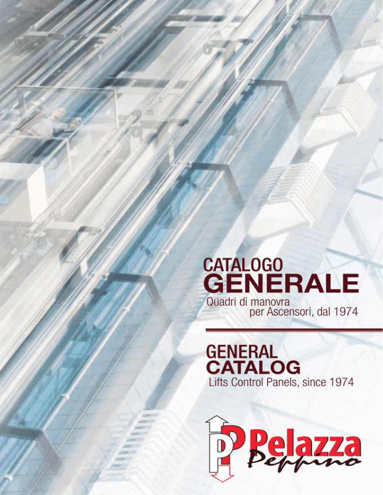 CATALOGO GENERALE Quadri di manovra per Ascensori, dal 1974 GENERAL CATALOG Lifts Control Panels, since 1974 L’AZIENDA THE COMPANY La PELAZZA PEPPINO Srl, fondata nel 1974 dal Sig. Pelazza Peppino, é un’azienda di proprietà e di gestione familiare, leader nel settore ascensoristico per la fabbricazione di quadri di manovra controllati da logica a MICROPROCESSORE o PLC. L’azienda si contraddistingue, oltre che per la notevole competenza acquisita, anche per la qualità da sempre perseguita impiegando solo materiali delle migliori marche. Durante tutti questi anni il mercato a cui la PELAZZA PEPPINO Srl si è rivolta si è notevolmente esteso, prima in Italia, poi in numerosi paesi europei e, quindi, in tutto il mondo. PELAZZA PEPPINO Srl, founded in 1974 by Mr. Pelazza Peppino, is a family owned and managed company; leader in the lift industry for the production of PLC or MICROPROCESSOR controlled control panels. The company utilizes MITSUBISHI PLC, for which it is the exclusive user for the whole Italian lift market. Besides its acquired competence, PELAZZA PEPPINO Srl distinguishes itself for its quality which it has always pursued using raw materials of the best brands, only. During all these years its business has progressively extended beyond Italy to other European countries and all over the world. ANDAMENTO ANNUALE DELLA PRODUZIONE Annual trend production QUADRI DI MANOVRA PRODOTTI Control panels production 2800 2600 2400 2200 2000 1800 1600 1400 1200 1000 800 600 400 200 0 1974 1980 1985 1990 1995 1997 2003 2005 2007 2009 2011 2013 2015 ANNO / Year NUOVA SCHEDA A MICROPROCESSORE DI ULTIMA GENERAZIONE NEW MICROPROCESSOR CONTROL BOARD OF LATEST GENERATION CPU 100P SPECIFICHE TECNICHE • Conformità alle normative UNI EN81-1/2 e certificazione per Emendamento A3. • Conformità all’Emendamento A3 per impianti idraulici e/o elettrici nelle seguenti modalità: • monitoraggio doppie valvole di discesa • controllo valvola di blocco discesa • controllo centraline idrauliche speciali NGV (GMV) e KMI (MORIS) • controllo doppi freni di sicurezza • controllo freno su albero lento • controllo limitatori di velocità con blocco antideriva • Flessibilità di utilizzo su impianti MRL grazie alle ridotte dimensioni (240x130mm). • Display alfanumerico di visualizzazione e programmazione dati con 4 righe da 20 caratteri a matrice di punti. • Orientamento del display di programmazione per montaggio scheda verticale o orizzontale. • Collegamento elettrico completo via morsettiere estraibili. • Alimentazione singola a 18Vac raddrizzata +/- 10% con caricabatteria 12Vdc integrato. • Programmazione della lingua di visualizzazione sul display alfanumerico. • Capacità impianti fino a 32 fermate con manovra universale e prenotazione discesa o completa. • Funzionalità multiplex fino a 4 cabine con collegamento in parallelo delle schede via cavo RS485. • Connettività diretta con computer locale via interfacce USB e/o RS232. • Firmware generico configurabile per impianti idraulici o elettrici con qualsiasi tipo di manovra. • Firmware aggiornabile via modulo SD Memory Card direttamente inseribile nell’apposito slot della scheda, o via computer locale o remoto. • Telegestione remota via modulo MODEM o GSM opzionale, collegabile esternamente alla scheda, tramite interfaccia RS232. • Programmazione parametri e funzioni tramite menù e sottomenù in chiaro visualizzati sul display alfanumerico, o via computer locale o remoto. • Storico allarmi permanente degli ultimi 30 eventi di guasto. • Orologio real time integrato per archiviazione data e ora di ogni evento di guasto nello storico allarmi. • Visualizzazione in chiaro del significato di ogni guasto nello storico allarmi consultabile via display alfanumerico, o via computer locale o remoto. • Visualizzazione continua sul display alfanumerico delle seguenti informazioni: • Stato e/o fase di funzionamento dell’impianto • Stato dei sensori magnetici di posizionamento cabina • Stato della linea delle sicurezze • Posizione cabina attuale, senso di marcia cabina, e posizione prevista di arrivo • Ultima segnalazione di guasto in corso • Data/ora e revisione firmware • Matricola impianto (programmabile fino a 8 caratteri) • Comando diretto di azionamenti VVVF interfacciabili via CANBUS o RS485. • Gestione impianti veloci fino a tre velocità intermedie oltre alla velocità nominale. • Gestione posizionamento cabina con tre modalità selezionabili: • Sensori magnetici tradizionali • Interfacciamento diretto via RS485 con il sistema encoder assoluto USP30-100 (SCHMERSAL) • Rilevazione impulsi da encoder incrementale sull’albero motore o sul limitatore di velocità (l’encoder sull’albero motore è lo stesso utilizzabile per la regolazione in anello chiuso dell’azionamento VVVF) • Autoapprendimento delle quote di piano e degli spazi di rallentamento per ciascuna velocità attivabile, con modalità di posizionamento cabina via encoder assoluto o incrementale. • Collegamento bottoniere di piano e cabina in seriale via 4 fili non schermati o con cablaggio tradizionale (sono realizzabili anche impianti misti: seriali cabina e tradizionali piano, o tradizionali cabina e seriali piano). • Collegamento bottoniere seriali di cabina in CANBUS, con raccolta pulsanti e segnalazioni via display cabina multifunzione. • Collegamento bottoniere seriali di piano in RS485, con raccolta di 2 pulsanti e 2 segnalazioni via display di piano multifunzione o, in assenza di display, via modulo interfaccia dedicato ad ogni piano. • Disponibilità di un modulo di interfaccia seriale CANBUS, da posizionare sul tetto cabina, per collegamento seriale di bottoniere cabina con cablaggio tradizionale. TECHNICAL SPECIFICATIONS • Conformity to UNI EN81-1/2 rules and certification for A3 Emendament. • Conformity to A3 Emendament of hydraulic and/or electric lifts for the following modes: • self mo