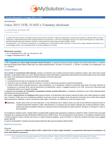 Circolare Monografica 12 maggio 2015, n. 2158 DICHIARAZIONI Unico 2015: IVIE, IVAFE e Voluntary disclosure La compilazione del Quadro RW di Armando Urbano Il quadro RW deve essere compilato dalle persone fisiche residenti in Italia che detengono investimenti all’estero e attività estere di natura finanziaria, indipendentemente dalle modalità della loro acquisizione, ai fini del monitoraggio fiscale e del calcolo dell’imposta sul valore delle attività finanziarie detenute all’estero (IVAFE) e dell’imposta sul valore degli immobili all’estero (IVIE). Si analizzano, con il presente contributo, le modalità per la liquidazione delle imposte e l’esecuzione degli obblighi dichiarativi e di monitoraggio fiscale, con esemplificazioni di diverse fattispecie concrete. Riferimenti normativi: D.L. 6 dicembre 2011 n. 201, art. 19 commi 13 -23 ; Legge 15 dicembre 2014 n. 186 . IVIE L’IVIE è l’imposta sul valore degli immobili situati all’estero, di proprietà di persone fisiche residenti nel territorio dello Stato o in relazioni alle quali le stesse siano titolari di diritti reali, ed è stata introdotta dall’art. 19 commi 13-23 del D.L. n. 201/2011 convertito, con modificazioni, con L. n. 214/2011. SOGGETTI PASSIVI Sono tenuti al versamento dell’imposta, sempre a condizione che si tratti di persone fisiche residenti in Italia e che i beni siano situati all’estero, a prescindere dall’uso cui sono destinati (rientrano quindi nell’ambito di applicazione dell’imposta anche gli immobili ad uso strumentale per natura o per destinazione destinati ad attività d’impresa o di lavoro autonomo): i proprietari; i concessionari (nel caso di concessione di aree demaniali); i locatari (in caso di immobili, anche da costruire o in corso di costruzione concessi in locazione finanziaria); i titolari di diritti reali di usufrutto (escluso il nudo proprietario), uso o abitazione, enfiteusi e superficie sugli stessi. Per poter verificare la sussistenza di eventuali diritti reali ed identificare correttamente, quindi, il soggetto passivo ai fini IVIE, occorre far riferimento agli ordinamenti esteri in cui è ubicato l’immobile. L’imposta è dovuta anche se l’immobile è posseduto tramite società fiduciarie o è intestato a fondazioni, trust o altre entità giuridiche riconducibili ad una persona fisica. Allo scopo di determinare la residenza delle persone fisiche, si fa riferimento alla nozione indicata nel testo unico delle imposte sui redditi (art. 2 comma 2 TUIR), per cui si considerano residenti “le persone che per la maggior parte del periodo di imposta sono iscritte nelle anagrafi della popolazione residente o hanno nel territorio dello Stato il domicilio o la residenza ai sensi del codice civile”. Attenzione Questi criteri sono tra di loro alternativi, è cioè sufficiente che si realizzi anche uno solo di essi affinché la persona fisica si consideri fiscalmente residente in Italia. Naturalmente è un requisito che può essere verificato solo al termine dell’anno solare, poiché solo allora è possibile verificare se il periodo minimo di permanenza è stato di almeno 183 giorni (o 184 giorni in caso di anno bisestile). Si considerano residenti anche i cittadini italiani cancellati dalle anagrafi della popolazione residente e trasferiti in Stati o territori diversi da quelli individuati da un apposito decreto del Ministero dell’Economia e delle Finanze. Fino all’emanazione di tale decreto, si considerano residenti anche i cittadini emigrati in Stati o territori che hanno un regime fiscale privilegiato, ossia nei Paesi c.d. black list, pertanto anch’essi sono soggetti passivi dell’IVIE. In caso di comproprietà, l’imposta è dovuta proporzionalmente alla quota di possesso dell’immobile. MODALITÀ DI CALCOLO Aliquote L’IVIE si calcola applicando l’aliquota dello 0,76% o dello 0,4% al valore degli immobili, in proporzione alla quota di possesso e ai mesi dell’effettivo possesso. www.mysolution.it è una testata registrata al Tribunale di Milano - Reg. N. 82 del 22/02/2010. Direttore responsabile: Elio Cipriani ©Copyright 2013 CESI Multimedia S.r.l. - Via Vittoria Colonna, 7 - 20149 Milano, telefono 02.36165.200 - e-mail: [email protected] -1- Il versamento non è dovuto se l’importo dell’imposta non supera Euro 200,00 (a prescindere da quota e periodo di possesso e senza tener conto delle detrazioni previste per i crediti d’imposta): in tal caso l’obbligo di compilazione del quadro RW sussiste solo ai fini del monitoraggio fiscale. L’aliquota ridotta allo 0,4% si applica agli immobili adibiti ad abitazione principale e relative pertinenze. Dall’ammontare dell’imposta è possibile detrarre l’importo massimo di Euro 200,00 (fino a concorrenza del suo ammontare), rapportati al periodo dell’anno in cui l’immobile è adibito ad abitazione principale. L’aliquota ridotta prevista per la prima casa si applica anche alle abitazioni possedute dai soggetti che prestano lavoro all’estero per lo Stato italiano la cui residenza fiscale rimane in Italia e permane per tutto il periodo in cui il lavoratore presta la propria attività all’estero. Nel momento in cui, al termine dell’attività lavorativa svolta all’estero, il lavoratore rientrerà in Italia, l’aliquota che dovrà essere applicata all’immobile all’estero sarà lo 0,76%. Lo stesso contribuente può detrarre l’imposta IVIE fino ad un massimo di Euro 200,00: in questo caso non si applica la soglia di esenzione di cui sopra. Base imponibile Per calcolare l’IVIE, occorre far riferimento al valore dell’immobile detenuto all’estero da residenti italiani. Secondo quanto previsto dalla Circolare n. 28/E del 2 luglio 2012 dell’Agenzia delle Entrate, la base imponibile sulla quale calcolare l’imposta varia a seconda dello Stato in cui è situato l’immobile: - per i Paesi appartenenti all’Unione Europea o aderenti allo Spazio Economico Europeo (SEE) come Norvegia e 