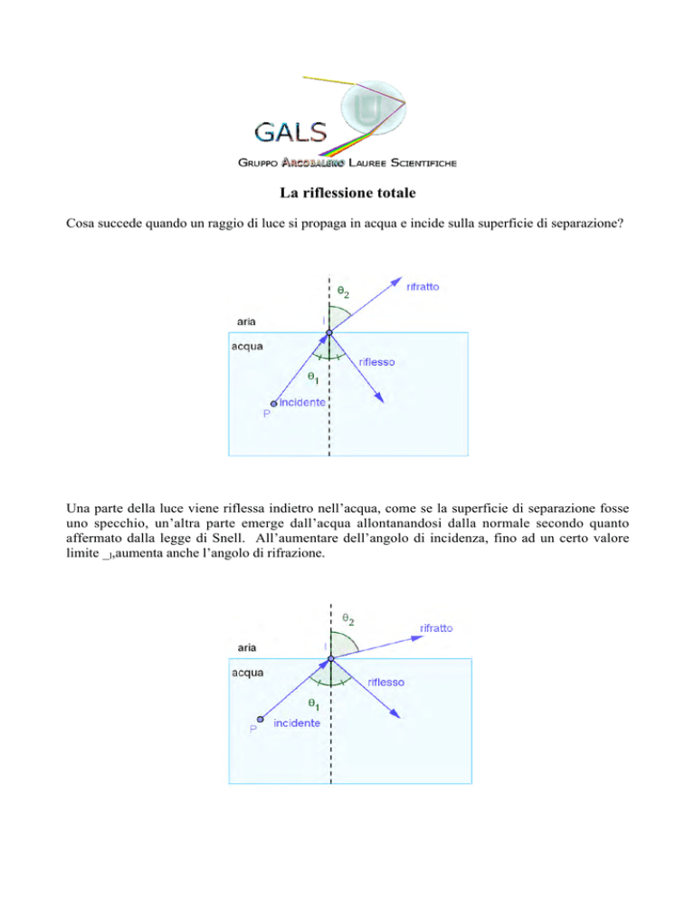 La riflessione totale Cosa succede quando un raggio di luce si propaga in acqua e incide sulla superficie di separazione? Una parte della luce viene riflessa indietro nell’acqua, come se la superficie di separazione fosse uno specchio, un’altra parte emerge dall’acqua allontanandosi dalla normale secondo quanto affermato dalla legge di Snell. All’aumentare dell’angolo di incidenza, fino ad un certo valore limite _l,aumenta anche l’angolo di rifrazione. Quando l’angolo di incidenza raggiunge il valore limite _l il raggio rifratto non passa più nell’aria ma è diretto parallelamente alla superficie di separazione dei due mezzi. In questo caso l’angolo di rifrazione è di 90°. Per angoli di incidenza maggiori dell’angolo limite _L tutta la luce viene riflessa nell’acqua. Questo fenomeno è chiamato riflessione totale. Per trovare l’angolo limite della riflessione totale si pone _2 = 90° nella legge di Snell n1 senϑl = n2 sen90° n2 che ammette soluzione solo se n1 > n2 n1 La riflessione totale si ottiene solo quando la velocità della luce nel secondo mezzo è maggiore che nel primo mezzo. da cui si ricava senθ l = animazione