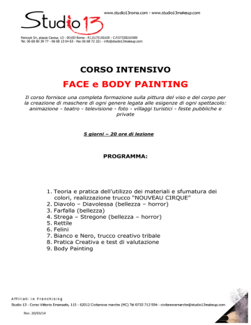 CORSO INTENSIVO FACE e BODY PAINTING Il corso fornisce una completa formazione sulla pittura del viso e del corpo per la creazione di maschere di ogni genere legata alle esigenze di ogni spettacolo: animazione - teatro - televisione - foto - villaggi turistici - feste pubbliche e private 5 giorni – 20 ore di lezione PROGRAMMA: 1. Teoria e pratica dell’utilizzo dei materiali e sfumatura dei colori, realizzazione trucco “NOUVEAU CIRQUE” 2. Diavolo – Diavolessa (bellezza – horror) 3. Farfalla (bellezza) 4. Strega – Stregone (bellezza – horror) 5. Rettile 6. Felini 7. Bianco e Nero, trucco creativo tribale 8. Pratica Creativa e test di valutazione 9. Body Painting Rev. 20/03/14 INFORMAZIONI CORSO FACE e BODY PAINTING RETTA SCOLASTICA a) La quota del corso è di € 1000,00 + iva. b) Da versare al momento dell’iscrizione. LIBRI E MATERIALE DIDATTICO a) Il corso non prevede l’acquisto di libri. Vari volumi verranno presentati durante le lezioni e potranno essere acquistati dall’allievo solo a sua discrezione. b) c) L’allievo dovrà fornirsi di un'attrezzatura personale: pennelli, pinzette, forbicine, etc. L’allievo porterà i suoi prodotti make-up. Per gli allievi che ne saranno sprovvisti, la scuola provvederà a fornirli per le esercitazioni a scuola. d) L’allievo deve considerare che per una buona riuscita del corso dovrà spesso esercitarsi a truccare anche a casa. Sarà consentito fotografare durante le lezioni. SOGGETTI/MODELLE E SERVIZI FOTOGRAFICI a) Ogni allievo dovrà portare una modella/soggetto per ogni lezione. b) Per la realizzazione dei servizi fotografici agli allievi verrà consigliato di portare una modella/amica. c) I servizi fotografici saranno realizzati da un fotografo professionista. Le foto realizzate non sono comprese nella quota del corso. d) e) Le foto contribuiranno a realizzare il book fotografico dell’allievo che attesterà le capacità alle future clienti. Sia agli allievi che alle eventuali modelle verrà richiesto da parte della scuola di firmare una liberatoria per l’utilizzo delle immagini. FREQUENZA DELLE LEZIONI E LEZIONI DI RECUPERO f) La frequenza delle lezioni è obbligatoria. Se l’allievo supera il 10% di ore di assenza la direzione della scuola può riservarsi di non rilasciare l’attestato di partecipazione. g) La scuola organizza lezioni di recupero o di sostegno per gli allievi che mancano a lezioni per gravi motivi, o per allievi che pur essendo sempre presenti hanno bisogno di lezioni di supporto. ESAMI FINALI E RILASCIO ATTESTATO PRIVATO a) Non è previsto alcun esame. b) La scuola rilascerà un attestato di partecipazione. c) Alla fine del corso riempirà un questionario sul risultato raggiunto e dirà se appagato dall'insieme offertogli. CALENDARIO E ORARIO DELLE LEZIONI a) Le date e gli orari del corso saranno concordati in base alla disponibilità dell’allievo e della scuola. NUMERO DEI PARTECIPANTI b) Ogni corso sarà formato da un minimo di 1 allievo ad un massimo di 6/8 allievi. Rev. 20/03/14