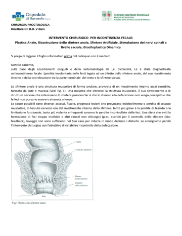 CHIRURGIA PROCTOLOGICA Direttore Dr. R.D. Villani INTERVENTO CHIRURGICO PER INCONTINENZA FECALE: Plastica Anale, Ricostruzione dello sfintere anale, Sfintere Artificiale, Stimolazione dei nervi spinali a livello sacrale, Graciloplastica Dinamica Si prega di leggere il foglio informativo prima del colloquio con il medico! Gentile paziente, sulla base degli accertamenti eseguiti e della sintomatologia da Lei dichiarata, Le è stata diagnosticata un’incontinenza fecale (perdita involontaria delle feci) legata ad un difetto dello sfintere anale, del suo rivestimento interno o della coordinazione tra la parte terminale del retto e lo sfintere stesso. Lo sfintere anale è una struttura muscolare di forma anulare, provvista di un rivestimento interno assai sensibile, formato da cute e mucosa (vedi fig. 1). Una malattia che interessi la struttura muscolare, il suo rivestimento o le strutture nervose che interessano lo sfintere possono far sì che lo stimolo alla defecazione non venga percepito o che le feci non possano essere trattenute a lungo. Le cause possibili sono diverse: ascessi, fistole, pregresse lesioni che provocano indebolimento o perdita di tessuto muscolare, di tessuto nervoso e/o del rivestimento interno dello sfintere. Tanto più grave è la perdita di tessuto o la limitazione funzionale, tanto più violente e frequenti saranno le perdite incontrollate delle feci. Una dieta che eviti la formazione di feci troppo morbide e altri rimedi non chirurgici (p.es. esercizi per il controllo dello sfintere (biofeedback), lavaggi) non sono sufficienti nel Suo caso per ridurre in modo decisivo i disturbi. Le consigliamo perciò l’intervento chirurgico con l’obiettivo di ristabilire il controllo della defecazione. L’INTERVENTO L’intervento viene condotto in anestesia generale o loco-regionale. Il tipo di intervento viene deciso in base al tipo e all’entità della perdita di tessuto muscolare, del danno della mucosa e della limitazione funzionale che vengono valutati prima dell’intervento per mezzo di endoscopia e/o ecografie dello sfintere ed eventualmente attraverso la misurazione della pressione (manometria) dello sfintere stesso. Danni ai nervi possono essere valutati per mezzo della misurazione della reattività nervosa (elettromiografia) o della velocità di conduzione nervosa. L’intervento che Le proponiamo è indicato con una crocetta. □ PLASTICA ANALE Un difetto del rivestimento interno all’ano viene risolto attraverso la trasposizione di tessuto sano e sensibile da zone vicine in modo da consentire nuovamente la tempestiva percezione dello stimolo alla defecazione. □ RICOSTRUZIONE DELLO SFINTERE I margini del muscolo sezionato vengono isolati e sovrapposti, dopo l’incisione cutanea e la separazione del tessuto adiposo, e suturati tra di loro. Nel caso in cui non sia individuabile una perdita netta del tessuto muscolare, ma solo un assottigliamento che provoca una chiusura imperfetta dell’ano, attraverso delle suture appropriate, praticate in prossimità dell’orifizio anale, è possibile ottenerne un adeguato restringimento. □ STIMOLAZIONE DEI NERVI SPINALI A LIVELLO SACRALE I nervi sacrali, che provvedono all’innervazione dello sfintere anale e del perineo vengono stimolati con degli elettrodi. Dopo aver praticato un’incisione cutanea a livello dell’osso sacro, si inserisce un elettrodo che arriva in prossimità dei nervi sacrali. Lo stimolatore esterno si porta alla cintura. Se si ottiene un evidente miglioramento della funzione dello sfintere anale, lo stimolatore viene posizionato con un'incisione cutanea a livello del tessuto adiposo dell’addome o della regione glutea. Lo stimolatore può essere programmato dall’esterno ed al momento della defecazione può essere inattivato per mezzo di un magnete. POSSIBILI MODIFICHE ED ESTENSIONI DELL’INTERVENTO Complicanze impreviste (p.es. fistole dopo l’intervento) o particolarità anatomiche del paziente possono richiedere un’estensione dell’intervento. La preghiamo di dare fin d’ora il Suo consenso a modifiche e/o estensioni dell’intervento che dovessero essere necessarie ed opportune. In tal modo si eviterà di doverLa sottoporre ad un eventuale secondo intervento chirurgico. POSSIBILI COMPLICANZE ED EFFETTI COLLATERALI L’intervento comporta generalmente pochi rischi. Complicanze gravi (p.es. emorragie) a seguito di lesione di organi vicini o vasi sanguigni che possono richiedere un nuovo intervento chirurgico, sono rare. Una ritenzione temporanea di urina potrebbe richiedere l’inserimento di un catetere vescicale. Danni derivanti dal posizionamento sul tavolo operatorio (compressione di nervi o parti molli con disturbi della sensibilità o, raramente, paralisi degli arti e disturbi circolatori) così come lesioni della cute e dei tessuti dovute a correnti elettriche, calore (p.es. materassini riscaldabili) e/o disinfettanti, si risolvono in genere spontaneamente e, sebbene possibile, non comportano solitamente gravi sequele. In alcuni casi tuttavia queste lesioni possono richiedere un trattamento prolungato, comportare una parziale e duratura alterazione della funzionalità dei nervi, portare a cicatrici talora permanenti. Siccome l’intervento viene eseguito in prossimità dei nervi che controllano la funzione dello sfintere anale può accadere che questi, nonostante venga adottata ogni cautela, vengano irritati o lesionati in modo permanente. In questi casi anche se si è provveduto ad un accurato ripristino dello sfintere, può accadere che questo non sia del tutto efficace e non si avverta per tempo lo stimolo della defecazione . L’incontinenza può permanere o addirittura peggiorare. L’irritazione dei nervi dovuta alla stimolazione elettrica è solitamente temporanea e si risolve spontaneamente. Danni duraturi dei nervi dovuti all’elettrostimolazione sono molto rari. In caso di uno sforzo eccessivo dello sfintere dopo un intervento di ricostruzione (p.es. a causa di feci