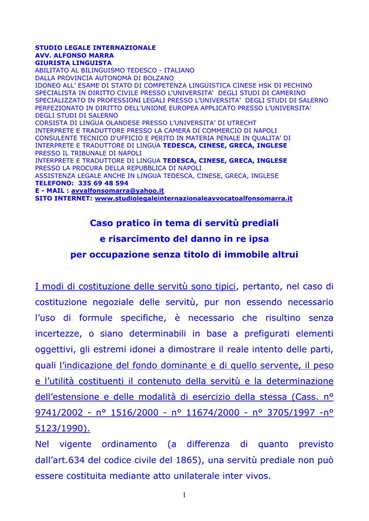 STUDIO LEGALE INTERNAZIONALE AVV. ALFONSO MARRA GIURISTA LINGUISTA ABILITATO AL BILINGUISMO TEDESCO - ITALIANO DALLA PROVINCIA AUTONOMA DI BOLZANO IDONEO ALL’ ESAME DI STATO DI COMPETENZA LINGUISTICA CINESE HSK DI PECHINO SPECIALISTA IN DIRITTO CIVILE PRESSO L'UNIVERSITA' DEGLI STUDI DI CAMERINO SPECIALIZZATO IN PROFESSIONI LEGALI PRESSO L’UNIVERSITA’ DEGLI STUDI DI SALERNO PERFEZIONATO IN DIRITTO DELL’UNIONE EUROPEA APPLICATO PRESSO L’UNIVERSITA’ DEGLI STUDI DI SALERNO CORSISTA DI LINGUA OLANDESE PRESSO L’UNIVERSITA’ DI UTRECHT INTERPRETE E TRADUTTORE PRESSO LA CAMERA DI COMMERCIO DI NAPOLI CONSULENTE TECNICO D'UFFICIO E PERITO IN MATERIA PENALE IN QUALITA' DI INTERPRETE E TRADUTTORE DI LINGUA TEDESCA, CINESE, GRECA, INGLESE PRESSO IL TRIBUNALE DI NAPOLI INTERPRETE E TRADUTTORE DI LINGUA TEDESCA, CINESE, GRECA, INGLESE PRESSO LA PROCURA DELLA REPUBBLICA DI NAPOLI ASSISTENZA LEGALE ANCHE IN LINGUA TEDESCA, CINESE, GRECA, INGLESE TELEFONO: 335 69 48 594 E - MAIL : [email protected] SITO INTERNET: www.studiolegaleinternazionaleavvocatoalfonsomarra.it Caso pratico in tema di servitù prediali e risarcimento del danno in re ipsa per occupazione senza titolo di immobile altrui I modi di costituzione delle servitù sono tipici, pertanto, nel caso di costituzione negoziale delle servitù, pur non essendo necessario l’uso di formule specifiche, è necessario che risultino senza incertezze, o siano determinabili in base a prefigurati elementi oggettivi, gli estremi idonei a dimostrare il reale intento delle parti, quali l’indicazione del fondo dominante e di quello servente, il peso e l’utilità costituenti il contenuto della servitù e la determinazione dell’estensione e delle modalità di esercizio della stessa (Cass. n° 9741/2002 - n° 1516/2000 - n° 11674/2000 - n° 3705/1997 -n° 5123/1990). Nel vigente ordinamento (a differenza di quanto previsto dall’art.634 del codice civile del 1865), una servitù prediale non può essere costituita mediante atto unilaterale inter vivos. 1 Dunque, la clausola notarile cui fa riferimento controparte “da via Arenula tramite servitù su proprietà aliena” deve ritenersi una clausola di stile,assolutamente inutile ed irrilevante ai fini del presente giudizio: l’atto di divisioni e donazioni per notar Romolo Romani di Roma non poteva dar luogo alla costituzione di una servitù sul fondo di un terzo e, quindi, costituisce “res inter alios acta quae neque prodest neque nocet “. Nè controparte ha dato prova di altro valido atto costitutivo di servitù ex art.1058 c.c. nè è stato fatto richiamo nel suddetto rogito notarile al contratto originario istitutivo della servitù medesima, atteso che, ai fini della costituzione contrattuale di una servitù di passaggio, non è richiesto l’uso di formule sacramentali, ma è sufficiente che dalla relativa clausola siano determinabili con certezza il fondo dominante, il fondo servente e l’oggetto, rappresentato dall’assoggettamento dell’uno all’utilità dell’altro (Cass. n° 12766/2008). Nel caso di costituzione negoziale di una servitù prediale l’esistenza ed il contenuto del diritto devono essere specificamente indicati nel titolo con cui viene costituita a carico del fondo servente la relativa servitù (Cass. n° 1328/2004). Ancora, ai fini della costituzione convenzionale di una servitù prediale, se è vero che non è richiesto l’uso di formule sacramentali, è pur vero che occorre che dalla clausola contrattuale siano determinabili con certezza,oltre che il fondo servente e il fondo dominante, l’oggetto in cui consiste l’assoggettamento di quello all’utilità dell’altro; sono a tal fine inefficaci quelle clausole che facciano generico riferimento a stati di fatto preesistenti (Cass. n° 11674/2000, conforme Cass. n° 8885/2000). 2 Poichè i modi di costituzione delle servitù sono tipici, nel caso di costituzione negoziale delle servitù, pur non essendo necessario l’uso di formule specifiche, è necessario che risultino senza incertezze o siano determinabili, in base a prefigurati elementi oggettivi, gli estremi idonei a dimostrare il reale intento delle parti, quale l’indicazione del fondo dominante e di quello servente, il peso e l’utilità costituenti il contenuto della servitù e la determinazione dell’estensione e delle modalità di esercizio della stessa (Cass. n° 9741/2002). Dunque, tutto ciò per dire che controparte non ha provato l’esistenza della servitù di passaggio costituita coattivamente o volontariamente ex artt. 1031, 1032, 1058 c.c. . Quanto, poi, alla ipotetica costituzione della servitù di passaggio per usucapione, si fa presente che controparte non ha provato in maniera rigorosa gli elementi costitutivi del diritto stesso ex artt.1158 c.c. ,1062 c.c. e 2697 c.c. . A differenza di quanto afferma controparte, il “viale-cortile” non è “ictu oculi un‟opera ben visibile e permanente“ ai fini dell’acquisto della servitù di passaggio per usucapione. Anzi, l’affermazione di controparte è una piena confessione dell’inesistenza della servitù presuntivamente ritenuta acquistata per usucapione. Infatti, come ha giustamente affermato la S.C. di Cassazione con la sentenza n° 2994 del 17/02/2004, << il requisito dell‟apparenza della servitù ,necessario ai fini del relativo acquisto per usucapione o per destinazione del padre di famiglia (art. 1061 c.c.) si configura come presenza di segni visibili di opere permanenti obiettivamente destinate al suo esercizio e rilevanti in modo non equivoco 3 l‟esistenza del peso gravante sul fondo servente, in modo da rendere manifesto che non si tratta di attività compiuta in via precaria, bensì di preciso onere a carattere stabile. Ne consegue che non è al riguardo pertanto sufficiente l‟esistenza di una strada o di un percorso idonei allo scopo, essenziale, viceversa, essendo che essi mostrino di essere stati posti in essere al preciso fine di dare accesso attravers