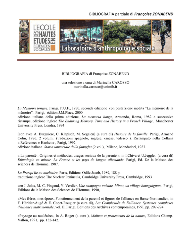 BIBLIOGRAFIA parziale di Françoise ZONABEND BIBLIOGRAFIA di Françoise ZONABEND una selezione a cura di Marinella CAROSSO [email protected] La Mémoire longue, Parigi, P.U.F., 1980, seconda edizione con postafzione inedita ”La mémoire de la mémoire”, Parigi, édition J.M.Place, 2000 edizione italiana della prima edizione, La memoria lunga, Armando, Roma, 1982 e successive ristampe, edizione inglese The Enduring Memory. Time and History in a French Village, Manchester University Press, Londra, 1994 [con avec A. Burguière, C. Klapisch, M. Segalen] (a cura di) Histoire de la famille. Parigi, Armand Colin, 1986, 2 volumi. (traduzioni spagnolo, inglese, cinese, tedesco ). Ristampato nella Collana « Références » Hachette-, Parigi, 1992 edizione italiana Storia universale della famiglia (2 vol.), Milano, Mondadori, 1987. « La parenté : Origines et méthodes, usages sociaux de la parenté ». in I.Chiva et U.Jeggle, (a cura di) Ethnologie en miroir. La France et les pays de langue allemande. Parigi, Ed. De la Maison des sciences de l'homme, 1987. La Presqu'île au nucléaire, Paris, Editions Odile Jacob, 1989, 188 p. traduzione inglese The Nuclear Peninsula, Cambridge University Press, Cambridge, 1993 con J. Jolas, M.-C. Pingaud, Y. Verdier, Une campagne voisine. Minot, un village bourguignon, Parigi, Editions de la Maison des Sciences de l'Homme, 1990, «Mes frères, mes époux. Fonctionnement de la parenté et figures de l'alliance en Basse-Normandie», in F. Héritier-Augé & E. Copet-Rougier (a cura di), Les Complexités de l'alliance. Systèmes complexes d'alliance matrimoniale, vol. II, Parigi, Editions des Archives contemporaines, 199I, pp. 207-224 «Paysage au nucléaire», in A. Roger (a cura ), Maîtres et protecteurs de la nature, Editions ChampVallon, 1991, pp. 132-142. BIBLIOGRAFIA parziale di Françoise ZONABEND « The monography in european ethnology » Current sociology, 1992, Vol. 49, n° 1. “Gestion de la parenté, gestion du troupeau” in F. Héritier et E. Copet-Rougier (a cura di ) , Les complexités de l’alliance, IV, Economie, politique et fondements symboliques, Parigi, ed. Archives contemporaines, 1994. (Coll. Ordres sociaux) «La famille, territoires de mémoire», Informations sociales, 1994, n° 30. ”Le nom, temps et contretemps”, Autrement, 1994, n° 147. ” De l’objet et de sa restitution en anthropologie” Gradhiva, 1994, n° 16. ”Le nucléaire au quotidien”, Autrement, série “Mémoires” 1995, n° 39. “Nouville après Nouville” presentazione della ristampa di L. Bernot et R. Blancart, Nouville, un village français, Paris, EAC, 1995. “Naître en marge” ( a cura di) .Gradhiva, 1996, n° 19. ”Les mal-morts” in R.Frydman et M. Flis-Trèves (a cura di), Mourir avant de n’être, Parigi, ed. O.Jacob, 1997. “De l’avènement de la mémoire orale” in Jean-Yves Boursier (ed.), Résistants, résistance, Parigi, l’Harmattan, 1997, pp. 159-172. “La mort : le chagrin, le deuil” in Catherine Le Grand-Sébille, Marie-France Morel et Françoise Zonabend (a cura), Le foetus, le nourrisson la mort, Parigi, l’Harmattan, 1998, pp.27-38. con C. Le Grand-Sébille e M.-F. Morel, Le foetus, le nourrisson et la mort, Parigi, l’Harmattan, 1998, 234 p. con P. Centlivres e D. Fabre, La fabrique des héros, Parigi, Ed. de la Maison des Sciences de l’Homme, 1999, “L’innommable et l’innommé” in Jean-Claude Beaune (a cura), Le déchet, le rebus, le rien, Seyssel, Ed. Champ Vallon, 1999, pp.90-98. BIBLIOGRAFIA parziale di Françoise ZONABEND « Le « dit » et le « su » de l’inceste » in J.L.Jamard, E.Terray et M.Xanthakou (a cura) En substances. Textes pour Françoise Héritier, Parigi, Fayard, 2000. « Les maître de parenté. Une femme de mémoire en Basse-Normandie » L’Homme, 2000, 154-155, pp. 505-524. con J. Jamin/, « Archivari »,Gradhiva, 2001-2002, N°30-31. con J. Jamin, « Vaines archives » Gradhiva, 2001-2002, N°30-31 « La mise en manuels. Les outils pédagogiques de la parenté » Gradhiva, 2002, n°32 Moeurs normandes. Ethnologie du roman de Raoul Gain « A Chacun sa volupté » Parigi, Christian Bourgois, 2003 « Familles et parenté en Basse Normandie » Les cahiers Goubervilliens, 2003, n°7. con C. Le Grand Sébille, « Héberger les morts » in A. Montandon (ed.) Le livre de l’Hospitalité. Accueil de l’étranger dans l’histoire et les cultures. Parigi, Bayard Presse, 2004, pp. 961-992. « L’archive dans tous ses états » Sociétés et représentations, 2005, n° 7. Numéro spécial « Lieux d’archives » « Adopter des soeurs. Construction de la parenté et mémoire des origines » L'Homme,2007, 183, juil.sept. «Minot : du terrain aux textes » et « Restitution et construction de l'objet en ethnologie du proche » in B. Paillard, J.-F. Simon et L.Le Gall (eds), En France rurale. Les enquêtes interdisciplinaires depuis les années 1960. Rennes, Presses universitaires de Rennes, 2010. « Chers parents. Les mots de la parenté en Basse Normandie » in HYPERLINK "http://biblas.collegede-france.fr/cgi-bin/koha/opac-detail.pl?biblionumber=51063"Le corps, la famille et l'État : hommage à André Burguière. Cottias, Myriam; Downs, Laura; Klapisch-Zuber, Christiane ; Jorland, Gérard; (a cura di); Rennes : Presses Universitaires de Rennes, 2010.
