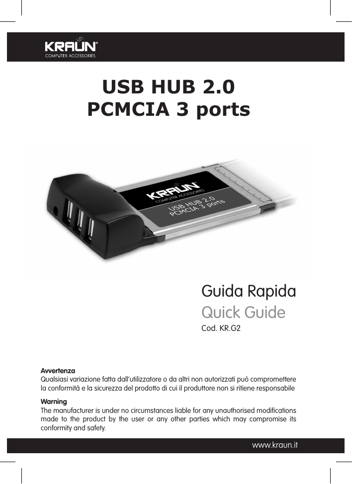 USB HUB 2.0 PCMCIA 3 ports Guida Rapida Quick Guide Cod. KR.G2 Avvertenza Qualsiasi variazione fatta dall’utilizzatore o da altri non autorizzati può compromettere la conformità e la sicurezza del prodotto di cui il produttore non si ritiene responsabile Warning The manufacturer is under no circumstances liable for any unauthorised modifications made to the product by the user or any other parties which may compromise its conformity and safety. www.kraun.it Quick Guide 1. Introduction Add a USB device to your PC ☞ Instantly add USB peripherals to your PC or Notebook. Never open your computer case again after you have your USB Port (PCI/PCMCIA) card installed and say good-bye to confusing cables. ☞ The USB Port (Universal Serial Bus) allows you to instantly connect USB devices to your computer. ☞ You never have to worry about running out of slots in your computer or those confusing IRQ’s again. You can also “Hot Swap” your USB devices. What does this mean? You never have to power down your PC to install hardware again. Gamers can switch joysticks on the fly. Welcome to the USB Revolution. USB Port Features This is a true 32-bit PCI-Bus USB card. The Card Bus is the trade name for an advanced PC Card (also known as PCMCIA card) specification. It fits in a slot like a conventional PC card and 32-bit path is used for data transfer. It supports the following I/O features: • 3 USB ports (root hub and two/three/four down stream function ports) • Auto detect speeds and connections of devices • Support High Speed Data Transfer Rates of up to 480 Mbps • Integrated physical layer transceivers • Normal and low power operating modes • Fully Plug and Play compatible • OHCI (Open Host Controller Interface) specification V1.0 register compatible • USB specification V.1.0 compatible • AC-DC Adapter: 120V ➞ INPUT 60Hz 10.1w, OUTPUT 5V DC 1A 230V ➞ INPUT 50Hz 100mA, OUTPUT 5V DC 1A Note If you use PCMCIA USB card. At normal time, you don’t need to use AC-DC adapter that you connect to USB devices. Only in one case that system request more power and please use our AC-DC adapter. 2 www.kraun.it Quick Guide System Requirements This setup program will install the driver for NEC USB 2.0 Host Controller. Before you start to run the setup program, please make sure your computer is an IBM PCcompatible system. This driver can be used either the following operating systems: • Windows 2000. • Windows XP. • Windows VISTA Driver Limitations Current limitations of the driver are: Composite devices and Hi-Speed Isochronous Transfers are currently not supported. 2.Driver Installation 1. Please make sure this PCI/PCMCIA card has been installed on your system correctly. 2. Insert the Driver CD to your CD-ROM and find the path = “\USB\USB2.0-NEC\ PC Driver\”. Click the Setup.exe File to install. After copy files to your system, it will show the information to ask you restart computer. Select the “Yes, I want to restart my computer now.” to restart. www.kraun.it 3 Quick Guide 3. After restarting your system, please check if your device works. [My Computer][Properties][Hardware][Device Manager] Note. If there is a yellow exclamation mark on “NEC PCI to USB 2.0 Enhanced Host Controller” or “USB 2.0 Root Hub Device”, please remove this item from the “Device Manager” by clicking the “Uninstall” button and click “Refresh” to re-install this driver again. 4 www.kraun.it Guida Rapida 1. Introduzione Aggiungi dispositivi USB al tuo computer ☞Aggiungi istantaneamente periferiche USB al tuo PC or Notebook. Non avrai più bisogno di aprire il case del tuo computer o usare cavi confusi, dopo aver installato una scheda (PCI/PCMCIA) con porte USB. ☞La porta USB (Universal Serial Bus) ti permette di collegare istantaneamente dispositivi USB al tuo computer. ☞Non dovrai più preoccuparti della mancanza di slot sul computer o di quei complicati cavi di connessione. Il dispositivo USB supporta la funzione “Hot Swap”, così non dovrai spegnere il computer per installare l’hardware. I giocatori potranno scambiare i joystick al volo. Benvenuti nella rivoluzione USB. Caratteristiche Porta USB Questa è una scheda 32-bit PCI-Bus USB. Card Bus è il nome commerciale delle specifiche avanzate di PC Card (conosciute come PCMCIA). La scheda si inserisce in uno slot come una PC Card, con un trasferimento dati a 32-bit. Supporta le seguenti caratteristiche: • 3 porte USB (hub principale e 3 porte con funzione di trasmissione) • Identifica automaticamente la velocità e la connessine dei dispositivi • Supporta trasferimento dati ad alta velocità fino a 480 Mbps • Ricetrasmetitori con strato fisico integrati • Modalità operative normale o basso consumo • Plug and Play • OHCI (Interfaccia Open Host Controller) compatibile con le specifiche di registro V1.0 • Compatibile con le specifiche USB1.0 • Adattatore AC-DC: 120V ➞ INPUT 60Hz 10.1w, OUTPUT 5V DC 1A 230V ➞ INPUT 50Hz 100mA, OUTPUT 5V DC 1A Nota. Per la scheda PCMCIA USB non è necessario usare un adattatore AC-DC da collegare ai dispositivi USB. L’adattatore è necessario nell’unico caso in cui il sistema richieda maggiore energia di alimentazione. www.kraun.it 5 Guida Rapida Requisiti di sistema Il programma di installazione installerà I driver per il dispositivo. Prima di iniziare ad avviare il programma di installazione, accertare che sul cmputer sia un sistema IBM PC compatibile. Il driver può essere usato con i seguenti sistemi operativi: • Windows 2000. • Windows XP. • Windows VISTA Limitazioni Driver Limitazioni del driver: Dispositivi compositi e trasferimenti isocrono ad alta velocità non sono attualmente supportati. 2. Installazione Driver 1. Assicurarsi di aver installato correttamente la PCMCIA sul sistema. 2. Inserire il CD Driver nel lettore CD-ROM e cerca il percorso “\USB\USB2.0-NEC\PC Driver\”. Clicca il file Setup.exe per avviare l’istallazione. Una volta co
