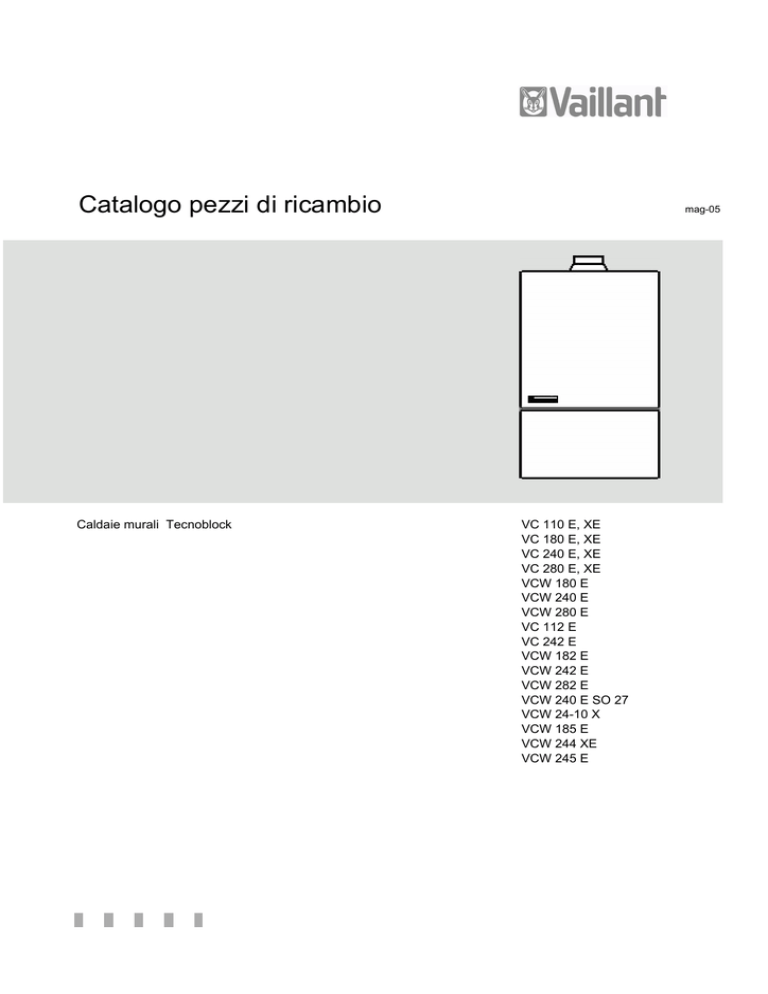 Catalogo pezzi di ricambio Caldaie murali Tecnoblock mag-05 VC 110 E, XE VC 180 E, XE VC 240 E, XE VC 280 E, XE VCW 180 E VCW 240 E VCW 280 E VC 112 E VC 242 E VCW 182 E VCW 242 E VCW 282 E VCW 240 E SO 27 VCW 24-10 X VCW 185 E VCW 244 XE VCW 245 E Indice Panoramica gruppo di costruzione 01 Gruppo acqua (fino a 01/89) 01a Gruppo acqua (da 01/89) VC 110 E, XE VC 112 E VC-VCW 180 ,240,280 E, XE VCW 244 XE VC-VCW 182,242,282 E VCW 185,245 E VCW 240 E SO 27 Pagina 4 Pagina 5 Pagina 6 VCW 24-10 X Pagina 8 VCW 180,240,280 E, XE VCW 182,242,282 E VCW 180,240,280 E, XE VCW 182,242,282 E VCW 240 E SO 27 VCW 24-10 X VCW 185,245 E VCW 244 XE Pagina 9 Pagina 7 Pagina 13 01b Gruppo acqua (da 05/95) VCW 180,240,280 E, XE VCW 182,242,282 E VCW 240 E S0 27 VCW 24-10 X VCW 185,245 E VCW 244 XE Pagina 15 01c Gruppo acqua (valvola 3 vie) VCW 180,240,280 E, XE VCW 182,242,282 E VCW 240 E S0 27 VCW 24-10 X VCW 185,245 E VCW 244 XE Pagina 17 04 Bruciatore VC 110 E, XE VC 112 E VC-VCW 180,240,280 E, XE VC-VCW 182,242,282 E VCW 240 E S0 27 Pagina 19 VCW 185,245 E VCW 244 XE VCW 24-10 X Pagina 23 05 Gruppo gas 06 Scambiatore 06a Scambiatore secondario a piastre Pagina 21 Pagina 25 VC 110 E, XE VC 112 E VC-VCW 180,240,280 E, XE VC-VCW 182,242,282 E VCW 240 E SO 27 Pagina 27 VCW 185,245 E VCW 24-10 X VC 110 E, XE VC 112 E VC-VCW 180,240,280 E, XE VC-VCW 182,242,282 E VCW 24-10 X Pagina 29 Pagina 31 Pagina 33 VCW 240 E SO 27 Pagina 35 VCW 185,245 E VCW 244 XE VCW 180,240,280 E, XE VCW 182,242,282 E VCW 240 E SO 27 VCW 24-10 X VCW 185,245 E VCW 244 XE Pagina 37 Pagina 39 L'eventuale riparazione dei prodotti dovrà essere effettuata solamente da personale professionalmente qualificato, utilizzando esclusivamente ricambi originali. Il mancato rispetto di quanto sopra può compromettere la sicurezza e la funzionalita dell'apparecchio. In caso di manomissione o di utilizzo di componenti non originali, è esclusa ogni responsabilità del costruttore. Inoltre, in tal caso, la certificazione di prodotto non può essere ritenuta valida, conformemente a quanto previsto dalla normativa nazionale ed europea. 1 Indice 07 Rivestimento, cappa antivento 07a accessori scarico fumi 07b1 Accessori scarico fumi 07b2 Accessori scarico fumi VC 110 E, XE VC 112 E VC-VCW 180 ,240,280 E, XE VCW 244 XE VCW 240 E SO 27 Pagina 41 VCW 24-10 X Pagina 47 VC-VCW 182 ,242,282 E VCW 185,245 E VC 122 E VC-VCW 182,242,282 E VCW 185,245 E Pagina 49 Pagina 43 Pagina 45 Pagina 51 VCW 240 E SO 27 Pagina 53 VC 122 E VC-VCW 182,242,282 E VC 122 E VC-VCW 182,242,282 E VCW 185,245 E Pagina 55 Pagina 57 VC 110 E, XE VC 112 E VC-VCW 180,240,280 E, XE VC-VCW 182,242,282 E VCW 240 E SO 27 VCW 24-10 X VCW 185,245 E VCW 244 XE Pagina 59 VC 110 E, XE VC 112 E VCW 180,240,280 E, XE VC 242 E Pagina 65 VCW 180,240,280 E, XE VCW 182,242,282 E VCW 240 E SO 27 VCW 244 XE Pagina 67 VCW 185,245 E Pagina 69 VCW 24-10 X Pagina 71 08b Parte idraulica (assieme accessori) VC 110 E, XE VC 112 E VC-VCW 180,240,280 E, XE VC-VCW 182,242,282 E VCW 240 E SO 27 VCW 24-10 X VCW 185,245 E VCW 244 XE Pagina 73 08c Parte idraulica (acc.-no. 9294/97) VC 110 E, XE VC 112 E VC-VCW 180,240,280 E, XE VC-VCW 182,242,282 E VCW 240 E S0 27 VCW 24-10 X VCW 185,245 E VCW 244 XE Pagina 75 08 Parte idraulica 08a Parte idraulica (serie tubetti) Pagina 61 L'eventuale riparazione dei prodotti dovrà essere effettuata solamente da personale professionalmente qualificato, utilizzando esclusivamente ricambi originali. Il mancato rispetto di quanto sopra può compromettere la sicurezza e la funzionalita dell'apparecchio. In caso di manomissione o di utilizzo di componenti non originali, è esclusa ogni responsabilità del costruttore. Inoltre, in tal caso, la certificazione di prodotto non può essere ritenuta valida, conformemente a quanto previsto dalla normativa nazionale ed europea. 2 Indice 08d Parte idraulica (carico impianto) VCW 180,240,280 E, XE VCW 182,242,282 E VCW 240 E S0 27 VCW 24-10 X VCW 185,245 E VCW 244 XE Pagina 77 12 Scatola comandi VC 110 E, XE VC 112 E VC-VCW 180,240,280 E, XE VC-VCW 182,242,282 E VCW 240 E SO 27 VCW 185,245 E VCW 244 XE Pagina 79 VCW 24-10 X VC 110 E, XE VC-VCW 180,240,280 E, XE VCW 244 XE VCW 24-10 X Pagina 83 Pagina 85 16 Pompa VC 110 E, XE VC 112 E VC-VCW 180,240,280 E, XE VC-VCW 182,242,282 E VCW 240 E S0 27 VCW 185,245 E VCW 244 XE Pagina 87 18 Vaso di espansione VC 110 E, XE VC 112 E VC-VCW 180,240,280 E, XE VC-VCW 182,242,282 E VCW 240 E SO 27 VCW 185,245 E VCW 244 XE Pagina 89 12a Scatola comandi (sensore fumi) Note Pagina 91 Pagina 93 L'eventuale riparazione dei prodotti dovrà essere effettuata solamente da personale professionalmente qualificato, utilizzando esclusivamente ricambi originali. Il mancato rispetto di quanto sopra può compromettere la sicurezza e la funzionalita dell'ap 3 Panoramica gruppo di costruzione VC 110 E, XE 4 Panoramica gruppo di costruzione VC 112 E 5 Panoramica gruppo di costruzione VC-VCW 180 E, XE VC-VCW 240 E, XE VC-VCW 280 E, XE VCW 244 XE 6 Panoramica gruppo di costruzione VCW 182 E VC-VCW 242 E VCW 282 E 7 VCW 185 E VCW 245 E VCW 240 E SO 27 Panoramica gruppo di costruzione VCW 24-10 X 8 01 Gruppo acqua (fino a 01/89) VCW 180 E, XE VCW 240 E, XE VCW 280 E, XE 9 VCW 182 E VCW 242 E VCW 282 E 01 Gruppo acqua (fino a 01/89) VCW 180 E, XE VCW 240 E, XE VCW 280 E, XE VCW 182 E VCW 242 E VCW 282 E Pos. Codice Descrizione 02-01-011 Note 01 - - non fornibile, vedi Gruppo di costruzione 01 Gruppo acqua (esecuzione da 05/95) 01b - - non fornibile, vedi Gruppo di costruzione 01 Gruppo acqua (esecuzione da 05/95) 02 03 013014 981147 coperchio gruppo acqua guarnizione (set 10 pezzi) con pezzi no. 03, 04 04 012156 premistoppa acqua 05 981147 guarnizione (set 10 pezzi) 06 010050 tappo a vite gruppo acqua 07 010003 vite gruppo acqua universale 08 104263 molla 09 010007 piattello membrana 10 010375 membrana (set 5 pezzi) 11 012944 regolatore acqua, cpl. solo per gruppo acqua con indice "+" sulla parte inferiore 12 104267 molla regolatore acqu
