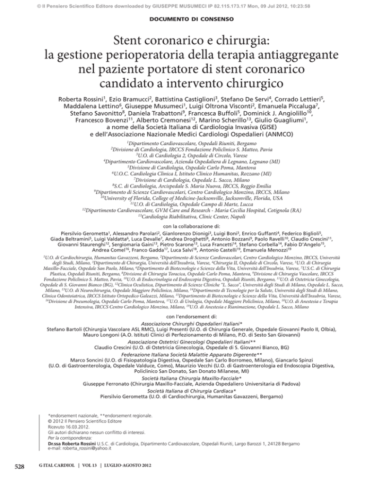 © Il Pensiero Scientifico Editore downloaded by GIUSEPPE MUSUMECI IP 82.115.173.17 Mon, 09 Jul 2012, 10:23:58 DOCUMENTO DI CONSENSO Stent coronarico e chirurgia: la gestione perioperatoria della terapia antiaggregante nel paziente portatore di stent coronarico candidato a intervento chirurgico Roberta Rossini1, Ezio Bramucci2, Battistina Castiglioni3, Stefano De Servi4, Corrado Lettieri5, Maddalena Lettino6, Giuseppe Musumeci1, Luigi Oltrona Visconti2, Emanuela Piccaluga7, Stefano Savonitto8, Daniela Trabattoni9, Francesca Buffoli5, Dominick J. Angiolillo10, Francesco Bovenzi11, Alberto Cremonesi12, Marino Scherillo13, Giulio Guagliumi1, a nome della Società Italiana di Cardiologia Invasiva (GISE) e dell’Associazione Nazionale Medici Cardiologi Ospedalieri (ANMCO) 1 Dipartimento Cardiovascolare, Ospedali Riuniti, Bergamo Divisione di Cardiologia, IRCCS Fondazione Policlinico S. Matteo, Pavia 3 U.O. di Cardiologia 2, Ospedale di Circolo, Varese 4 Dipartimento Cardiovascolare, Azienda Ospedaliera di Legnano, Legnano (MI) 5 Divisione di Cardiologia, Ospedale Carlo Poma, Mantova 6 U.O.C. Cardiologia Clinica I, Istituto Clinico Humanitas, Rozzano (MI) 7 Divisione di Cardiologia, Ospedale L. Sacco, Milano 8 S.C. di Cardiologia, Arcispedale S. Maria Nuova, IRCCS, Reggio Emilia 9 Dipartimento di Scienze Cardiovascolari, Centro Cardiologico Monzino, IRCCS, Milano 10 University of Florida, College of Medicine-Jacksonville, Jacksonville, Florida, USA 11 U.O. di Cardiologia, Ospedale Campo di Marte, Lucca 12 Dipartimento Cardiovascolare, GVM Care and Research - Maria Cecilia Hospital, Cotignola (RA) 13 Cardiologia Riabilitativa, Clinic Center, Napoli 2 con la collaborazione di: Piersilvio Gerometta1, Alessandro Parolari2, Gianlorenzo Dionigi3, Luigi Boni3, Enrico Guffanti4, Federico Biglioli5, Giada Beltramini5, Luigi Valdatta6, Luca Devalle7, Andrea Droghetti8, Antonio Bozzani9, Paolo Ravelli10, Claudio Crescini11, Giovanni Staurenghi12, Sergiomaria Gaini13, Pietro Scarone13, Luca Francetti14, Stefano Corbella14, Fabio D’Angelo15, Andrea Comel16, Franco Gadda17, Luca Salvi18, Antonio Castelli19, Emanuela Menozzi19 1 U.O. di Cardiochirurgia, Humanitas Gavazzeni, Bergamo, 2Dipartimento di Scienze Cardiovascolari, Centro Cardiologico Monzino, IRCCS, Università degli Studi, Milano, 3Dipartimento di Chirurgia, Università dell’Insubria, Varese, 4Chirurgia II, Ospedale di Circolo, Varese, 5U.O. di Chirurgia Maxillo-Facciale, Ospedale San Paolo, Milano, 6Dipartimento di Biotecnologie e Scienze della Vita, Università dell’Insubria, Varese, 7U.S.C. di Chirurgia Plastica, Ospedali Riuniti, Bergamo, 8Divisione di Chirurgia Toracica, Ospedale Carlo Poma, Mantova, 9Divisione di Chirurgia Vascolare, IRCCS Fondazione Policlinico S. Matteo, Pavia, 10U.O. di Endocrinologia ed Endoscopia Digestiva, Ospedali Riuniti, Bergamo, 11U.O. di Ostetricia Ginecologia, Ospedale di S. Giovanni Bianco (BG), 12Clinica Oculistica, Dipartimento di Scienze Cliniche “L. Sacco”, Università degli Studi di Milano, Ospedale L. Sacco, Milano, 13U.O. di Neurochirurgia, Ospedale Maggiore Policlinico, Milano, 14Dipartimento di Tecnologie per la Salute, Università degli Studi di Milano, Clinica Odontoiatrica, IRCCS Istituto Ortopedico Galeazzi, Milano, 15Dipartimento di Biotecnologie e Scienze della Vita, Università dell’Insubria, Varese, 16Divisione di Pneumologia, Ospedale Carlo Poma, Mantova, 17U.O. di Urologia, Ospedale Maggiore Policlinico, Milano, 18U.O. di Anestesia e Terapia Intensiva, IRCCS Centro Cardiologico Monzino, Milano, 19U.O. di Anestesia e Rianimazione, Ospedale L. Sacco, Milano con l’endorsement di: Associazione Chirurghi Ospedalieri Italiani* Stefano Bartoli (Chirurgia Vascolare ASL RMC), Luigi Presenti (U.O. di Chirurgia Generale, Ospedale Giovanni Paolo II, Olbia), Mauro Longoni (A.O. Istituti Clinici di Perfezionamento di Milano, P.O. di Sesto San Giovanni) Associazione Ostetrici Ginecologi Ospedalieri Italiani** Claudio Crescini (U.O. di Ostetricia Ginecologia, Ospedale di S. Giovanni Bianco, BG) Federazione Italiana Società Malattie Apparato Digerente** Marco Soncini (U.O. di Fisiopatologia Digestiva, Ospedale San Carlo Borromeo, Milano), Giancarlo Spinzi (U.O. di Gastroenterologia, Ospedale Valduce, Como), Maurizio Vecchi (U.O. di Gastroenterologia ed Endoscopia Digestiva, Policlinico San Donato, San Donato Milanese, MI) Società Italiana Chirurgia Maxillo-Facciale* Giuseppe Ferronato (Chirurgia Maxillo-Facciale, Azienda Ospedaliero Universitaria di Padova) Società Italiana di Chirurgia Cardiaca* Piersilvio Gerometta (U.O. di Cardiochirurgia, Humanitas Gavazzeni, Bergamo) *endorsement nazionale, **endorsement regionale. © 2012 Il Pensiero Scientifico Editore Ricevuto 16.03.2012. Gli autori dichiarano nessun conflitto di interessi. Per la corrispondenza: Dr.ssa Roberta Rossini U.S.C. di Cardiologia, Dipartimento Cardiovascolare, Ospedali Riuniti, Largo Barozzi 1, 24128 Bergamo e-mail: [email protected] 528 G ITAL CARDIOL | VOL 13 | LUGLIO-AGOSTO 2012 © Il Pensiero Scientifico Editore downloaded by GIUSEPPE MUSUMECI IP 82.115.173.17 Mon, 09 Jul 2012, 10:23:58 STENT CORONARICO E CHIRURGIA Società Italiana di Chirurgia Plastica ed Estetica* Enrico Robotti (U.S.C. di Chirurgia Plastica, Ospedali Riuniti, Bergamo) Società Italiana di Chirurgia Toracica* Davide Dell’Amore (U.O. di Chirurgia Toracica “Antonio Vio”, Ospedale G.B. Morgagni-L. Pierantoni, Forlì) Società Italiana di Chirurgia Vascolare ed Endovascolare* Carlo Setacci (Dipartimento di Chirurgia Vascolare ed Endovascolare, Università degli Studi, Siena) Società Italiana di Chirurgia* Gianluigi Melotti (Chirurgia Generale, Ospedale di Baggiovara-NOCSAE, USL Modena) Società Italiana di Ortopedia e Traumatologia* Paolo Cherubino (Dipartimento di Biotecnologie e Scienze della Vita, Università dell’Insubria, Varese) Società Italiana di Parodontologia* Luca Francetti (Dipartimento di Tecnologie per la Salute, Università degli