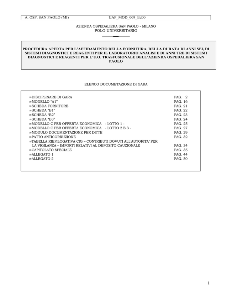 A. OSP. SAN PAOLO (MI) UAP_MOD_009_Ed00 AZIENDA OSPEDALIERA SAN PAOLO - MILANO POLO UNIVERSITARIO PROCEDURA APERTA PER L’AFFIDAMENTO DELLA FORNITURA, DELLA DURATA DI ANNI SEI, DI SISTEMI DIAGNOSTICI E REAGENTI PER IL LABORATORIO ANALISI E DI ANNI TRE DI SISTEMI DIAGNOSTICI E REAGENTI PER L’U.O. TRASFUSIONALE DELL’AZIENDA OSPEDALIERA SAN PAOLO ELENCO DOCUMETAZIONE DI GARA • DISCIPLINARE DI GARA • MODELLO “A1” • SCHEDA FORNITORE • SCHEDA “B1” • SCHEDA “B2” • SCHEDA “B3” • MODELLO C PER OFFERTA ECONOMICA - LOTTO 1 • MODELLO C PER OFFERTA ECONOMICA - LOTTO 2 E 3 • MODULO DOCUMENTAZIONE PER DITTE • PATTO ANTICORRUZIONE • TABELLA RIEPILOGATIVA CIG – CONTRIBUTI DOVUTI ALL’AUTORITA’ PER LA VIGILANZA – IMPORTI RELATIVI AL DEPOSITO CAUZIONALE • CAPITOLATO SPECIALE • ALLEGATO 1 • ALLEGATO 2 PAG. 2 PAG. 16 PAG. 21 PAG. 22 PAG. 23 PAG. 24 PAG. 25 PAG. 27 PAG. 29 PAG. 32 PAG. 34 PAG. 35 PAG. 44 PAG. 50 1 A. OSP. SAN PAOLO (MI) UAP_MOD_009_Ed00 AZIENDA OSPEDALIERA SAN PAOLO - MILANO POLO UNIVERSITARIO PROCEDURA APERTA PER L’AFFIDAMENTO DELLA FORNITURA DI SISTEMI DIAGNOSTICI E REAGENTI PER IL LABORATORIO ANALISI E L’U.O. TRASFUSIONALE DELL’AZIENDA OSPEDALIERA SAN PAOLO DISCIPLINARE DI GARA ART. 1 - PROCEDURA DI GARA L’Azienda Ospedaliera San Paolo indice gara comunitaria a procedura aperta ai sensi dell’art. 3 – comma 37 - del D. Leg.vo 163/2006, per l’affidamento della fornitura, per la durata di anni sei, di sistemi diagnostici e reagenti per il Laboratorio Analisi e per la durata di anni tre di sistemi diagnostici e reagenti per l’U.O. Trasfusionale dell’Azienda Ospedaliera San Paolo di Milano. La fornitura è suddivisa nei seguenti lotti per gli importi di spesa netta annua presunta Iva esclusa posta a base d’asta a fianco indicata: Lotto 1. Lotto 2. Lotto 3. Sistema diagnostico di chimica clinica, immunologia e virologia per Laboratorio Analisi Sistema diagnostico d’immunoematologia (routine-urgenza); per l’U.O. Trasfusionale Sistema diagnostico per coagulazione, emostasi e fibrinolisi; per l’U.O. Trasfusionale Euro 900.000,00 Euro 185.000,00 Euro 150.000,00 I concorrenti che intendono partecipare alla procedura aperta per la fornitura di che trattasi dovranno osservare le disposizioni contenute nel bando di gara, nonché le condizioni generali e particolari precisate nel seguente disciplinare di gara e relativi allegati. I contenuti quantitativi e qualitativi delle forniture da eseguire, suddivise nei lotti sopra elencati, nonché le condizioni contrattuali, sono descritti nel capitolato speciale e nell’Allegato n. 1. ART. 2 - TERMINI E MODALITA’ DI VERSAMENTO DELLA CONTRIBUZIONE I concorrenti che intendono partecipare alla presente procedura aperta, condizione di ammissibilità alla procedura di selezione del concorrente, sono tenuti a versare il contributo dovuto per ogni singolo lotto per il quale presentano offerta, in ragione del relativo importo, nella misura prevista dall’art. 2 dalla deliberazione 15/02/2010 dell’Autorità di Vigilanza sui contratti pubblici di lavori, servizi e forniture in materia di “Attuazione dell’art. 1, comma 65 e 67 della Legge 23 dicembre 2005, n. 266 per l’anno 2010” Con riferimento al codice identificativo della gara – CIG – di ogni singolo lotto -, il pagamento della contribuzione deve avvenire con le seguenti modalità: 1.mediante versamento on line, mediante carta di credito dei circuiti Visa, MasterCard, Diners, American Express, collegandosi al portale web “Sistema di riscossione” all’indirizzo http://riscossione.avlp.it seguendo le istruzioni disponibili sul portale; 2.in contanti presso la rete dei tabaccai lottisti abilitati al pagamento di bollettini, con il modello rilasciato dal servizio di riscossione. All’indirizzo http://www.lottomaticaservizi.it è disponibile la funzione “Cerca il punto vendita più vicino a te”. Lo scontrino rilasciato dal punto vendita dovrà essere allegato in originale all’offerta; Nel caso di RTI costituita il versamento è unico ed effettuato dalla capogruppo. Anche nel caso di RTI non ancora costituita il versamento è unico in quanto l’offerta è unica, sottoscritta da tutte le imprese che costituiscono il raggruppamento; l’offerta contiene l’impegno che, in caso di aggiudicazione, le imprese conferiranno mandato ad una di esse, qualificata come capogruppo: il pagamento è eseguito da quest’ultima. Gli importi corrispondenti al contributo con riferimento ai singoli lotti e relativi CIG, sono riportati nella tabella allegata al presente disciplinare. 2 A. OSP. SAN PAOLO (MI) UAP_MOD_009_Ed00 ART. 3 – REQUISITI DI AMMISSIONE ALLA GARA I requisiti di ammissione, oltre a quelli generali di seguito riportati, sono indicati nell’art. 4 del presente disciplinare e nel Modello A1 “Fac-simile Autocertificazione”, allegato al presente disciplinare, che la Società dovrà compilare, sottoscrivere ed inserire nella busta “A”, e che si intendono a tutti gli effetti di seguito riportati. Sono ammessi alla presente procedura di affidamento: a) Gli imprenditori individuali, le società commerciali, le società cooperative; b) I consorzi fra Società cooperative di produzione e di lavoro costituiti a norma della Legge 25.06.1909 n. 422 e successive modificazioni, i consorzi tra imprese artigiane di cui alla Legge 08.08.1985, n. 443; c) I consorzi stabili, costituiti anche in forma di Società consortili ai sensi dell’art. 2616 – ter del Codice Civile, tra imprenditori individuali, anche artigiani, società commerciali, società cooperative di produzione di lavoro, secondo le disposizioni di cui all’art. 36 del D.Lgs 163/2006, che si intendono a tutti gli effetti di seguito integralmente riportate; d) I raggruppamenti temporanei di concorrenti, costituiti da soggetti di cui alle lettere a), b) e c), i quali, prima della presentazione dell’offerta, abbiano conferito mandato collettivo speciale con