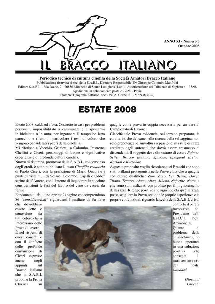 il Bracco italiano • Ottobre 2008 - n. 3 ANNO XI - Numero 3 Ottobre 2008 IL BRACCO ITALIANO Periodico tecnico di cultura cinofila della Società Amatori Bracco Italiano Pubblicazione riservata ai soci della S.A.B.I., Direttore Responsabile: Dr Giuseppe Colombo Manfroni Editore S.A.B.I. - Via Dosso, 7 - 26856 Mirabello di Senna Lodigiana (Lodi) - Autorizzazione del Tribunale di Voghera n. 135/98 Spedizione in abbonamento postale - 70% - Pavia Stampa: Tipografia Zaffaroni snc - Via Al Corbè, 21 - Mozzate (CO) ESTATE 2008 Estate 2008: calda ed afosa. Costretto in casa per problemi personali, impossibilitato a camminare e a spostarmi in bicicletta o in auto, per ingannare il tempo ho letto parecchio e riletto in particolare i testi di coloro che vengono considerati i padri della cinofilia. Mi riferisco a Vecchio, Griziotti, a Colombo, Pastrone, Chellini e Ciceri, personaggi di buone e significative esperienze e di profonda cultura cinofila. Nuovo di ristampa, promosso dalla S.A.B.I., col consenso degli eredi, è stato pubblicato il testo Cinofilia venatoria di Paolo Ciceri, con la prefazione di Mario Quadri e i punti di vista “…. di Solaro, Colombo, Cajelli e Oddo” scritto dall’ Autore, con l’ intento di inquadrare in succinte considerazioni le fasi del lavoro del cane da caccia da ferma. Fondamentali risultano le prime 24 pagine, che comprendono 86 “considerazioni” riguardanti l’ausiliare da ferma e che dovrebbero essere lette e conosciute da tutti coloro che si interessano delle Prove di lavoro. È nel rispetto di questi concetti e con il conforto delle profonde convinzioni di Ciceri espresse anche negli appunti sul Bracco Italiano che la S.A.B.I. propone la Prova Classica su quaglie come prova in coppia necessaria per arrivare al Campionato di Lavoro. Giacchè tale Prova evidenzia, sul terreno preparato, le caratteristiche del cane nella ricerca della selvaggina: non solo prepotenza, disinvoltura o passione, ma stile di razza ereditato dagli antenati che dovrà essere trasmesso ai discendenti. Il soggetto deve dimostrare di essere Pointer, Setter, Bracco Italiano, Spinone, Epagneul Breton, Kortaal e Kurzahar. A questo proposito voglio ricordare quei Bracchi che sono stati brillanti protagonisti nelle Prove classiche a quaglie con ottime qualifiche: Zum, Zago, Fer, Beirut, Dover, Titano, Tenores, Aiace, Altea, Athena, Nefertite, Nereo e che sono stati utilizzati con profitto per il miglioramento della razza. Ritengo positivo che ogni Società specializzata possa scegliere la Prova secondo le proprie esperienze e le proprie convinzioni, riguardo la scelta della S.A.B.I. ci è di conforto il parere favorevole del Presidente dell’ E.N.C.I. Dott. Attimonelli. Quanto al problema della caudectomia, ho buone speranze in una soluzione positiva che consenta il mantenimento dei nostri standard. Giovanni Grecchi il Bracco italiano • Ottobre 2008 - n. 3 ADDIO A RENATO TOSI Il 21 settembre 2008 è morto il geom. Renato Tosi, agricoltore e cacciatore con la passione per il Bracco Italiano, Sindaco del Consiglio S.A.B.I. Aveva 72 anni e un male l’ha rapidamente stroncato. Come braccofilo ha saputo scegliere buoni soggetti di buone linee di sangue, che non solo sono diventati campioni assoluti ma sono stati anche buoni riproduttori e hanno contribuito al miglioramento della razza. Puntuale, ad ogni inizio dell’ anno sociale, si presentava in Sede a Mirabello per rinnovare la tessera e controllare il cartaceo economico della Società. Uomo di grande equilibrio, riusciva ad esprimere anche il proprio disaccordo senza mai scontrarsi con il prossimo, ricercando comunque il bene della razza e della Società. Insieme alla S.A.B.I. lo ringrazio di cuore e lo saluto. Giovanni Grecchi 21 settembre apertura della caccia, sono le nove del mattino e squil- Dopo arrivò Giorgia, figlia di Marco, straordinaria femmina di una la il mio cellulare, è mia moglie che mi dice con voce sommessa intelligenza venatoria unica, fu madre di Linus, detto “Piso” Ch It. “ha appena chiamato Gilda, la figlia di Tosi, Renato Tosi ci ha la- di lavoro e di Blanca madre poi di Zorro. Con Linus Renato aveva sciato”. un feeling particolare anche se non era un cane da grandi prestazioni Rimango un attimo in silenzio, poi lego i miei cani, do spiegazioni ma fermatore straordinario e cacciatore di furbe intuizioni. Quasi agli amici e mi avvio al furgone, durante il tragitto tutto mi scorre contemporaneamente a Linus Renato acquistò da me Chiara bellisnella mente molto veloce, la storia di 30 anni di amicizia con quel- sima ed elegante femmina che raggiunse il Campionato Assoluto l’uomo che non è più tra noi. e che accoppiata con Olmo diede i natali al famoso Basco, cane Conobbi Renato Tosi nel lontano 1978 ero alle prime armi alla corte che Reato Tosi ebbe nel cuore più di ogni altro, perché esprimeva di Rino Vigo, una mattina arrivarono due persone: una era Renato, in pieno tutto quello che lui pretendeva da un soggetto da caccia e l’altro era il grande Luciano Tansini, li conobbi entrambi quel gior- da prove. Basco divenne Campione Assoluto Italiano ed Internaziono e fu subito ammirazione e simpatia specialmente per quell’omo- nale nonchè Campione sociale per due volte e vincitore di diversi ne di Tansini, scherzoso e sempre sorridente. Trofei tra cui Canossa, Ciceri, Amaldi, vincitore della Settimana Dalla macchina scesero due bracchi: una femmina di nome Lina ed sarda 2000, ecc. ecc. Fu anche padre di Amelia dell’Oltrepò Ch It un maschio bellissimo di nome Alan di Zerbio, un roano vigoroso di Bellezza e madre di Zulù dell’Oltrepò che Renato non potrà più godere. nipote del famoso Burt di Zerbio e lì iniziò la nostra avventura. Renato era appena uscito da una brutta avventura cinofila , era pro- Renato è stato per me un compagno di avventure cinofile inimitaprietario di una cagna straordinaria di nome Vira di Montepetrano bile, di una competenza in materia che solo pochi hanno, con 