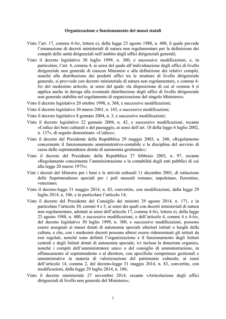 Organizzazione e funzionamento dei musei statali Visto l’art. 17, comma 4-bis, lettera e), della legge 23 agosto 1988, n. 400, il quale prevede l’emanazione di decreti ministeriali di natura non regolamentare per la definizione dei compiti delle unità dirigenziali nell’ambito degli uffici dirigenziali generali; Visto il decreto legislativo 30 luglio 1999, n. 300, e successive modificazioni, e, in particolare, l’art. 4, comma 4, ai sensi del quale all’individuazione degli uffici di livello dirigenziale non generale di ciascun Ministero e alla definizione dei relativi compiti, nonché alla distribuzione dei predetti uffici tra le strutture di livello dirigenziale generale, si provvede con decreto ministeriale di natura non regolamentare, e comma 4bis del medesimo articolo, ai sensi del quale «la disposizione di cui al comma 4 si applica anche in deroga alla eventuale distribuzione degli uffici di livello dirigenziale non generale stabilita nel regolamento di organizzazione del singolo Ministero»; Visto il decreto legislativo 20 ottobre 1998, n. 368, e successive modificazioni; Visto il decreto legislativo 30 marzo 2001, n. 165, e successive modificazioni; Visto il decreto legislativo 8 gennaio 2004, n. 3, e successive modificazioni; Visto il decreto legislativo 22 gennaio 2004, n. 42, e successive modificazioni, recante «Codice dei beni culturali e del paesaggio, ai sensi dell’art. 10 della legge 6 luglio 2002, n. 137», di seguito denominato: «Codice»; Visto il decreto del Presidente della Repubblica 29 maggio 2003, n. 240, «Regolamento concernente il funzionamento amministrativo-contabile e la disciplina del servizio di cassa delle soprintendenze dotate di autonomia gestionale»; Visto il decreto del Presidente della Repubblica 27 febbraio 2003, n. 97, recante «Regolamento concernente l’amministrazione e la contabilità degli enti pubblici di cui alla legge 20 marzo 1975»; Visti i decreti del Ministro per i beni e le attività culturali 11 dicembre 2001, di istituzione delle Soprintendenze speciali per i poli museali romano, napoletano, fiorentino, veneziano; Visto il decreto-legge 31 maggio 2014, n. 83, convertito, con modificazioni, dalla legge 29 luglio 2014, n. 106, e in particolare l’articolo 14; Visto il decreto del Presidente del Consiglio dei ministri 29 agosto 2014, n. 171, e in particolare l’articolo 30, commi 4 e 5, ai sensi dei quali con decreti ministeriali di natura non regolamentare, adottati ai sensi dell’articolo 17, comma 4-bis, lettera e), della legge 23 agosto 1988, n. 400, e successive modificazioni, e dell’articolo 4, commi 4 e 4-bis, del decreto legislativo 30 luglio 1999, n. 300, e successive modificazioni, possono essere assegnati ai musei dotati di autonomia speciale ulteriori istituti o luoghi della cultura, e che, con i medesimi decreti possono altresì essere ridenominati gli istituti da essi regolati, nonché sono definiti l’organizzazione e il funzionamento degli Istituti centrali e degli Istituti dotati di autonomia speciale, ivi inclusa la dotazione organica, nonché i compiti dell’amministratore unico o del consiglio di amministrazione, in affiancamento al soprintendente o al direttore, con specifiche competenze gestionali e amministrative in materia di valorizzazione del patrimonio culturale, ai sensi dell’articolo 14, comma 2, del decreto-legge 31 maggio 2014, n. 83, convertito, con modificazioni, dalla legge 29 luglio 2014, n. 106; Visto il decreto ministeriale 27 novembre 2014, recante «Articolazione degli uffici dirigenziali di livello non generale del Ministero»; 1 Visto il decreto ministeriale 27 novembre 2014, recante «Disciplina dei criteri e delle procedure per il conferimento degli incarichi dirigenziali»; Tenuto conto dell’«Atto di indirizzo sui criteri tecnico-scientifici e sugli standard di funzionamento e sviluppo dei musei» di cui al decreto ministeriale 10 maggio 2001; Rilevata l’esigenza di definire l’organizzazione e il funzionamento degli istituti e musei di rilevante interesse nazionale di cui all’articolo 30, comma 3 del citato decreto del Presidente del Consiglio dei ministri 29 agosto 2014, n. 171; Rilevata altresì la necessità, al fine di assicurare l’attivazione dei Poli museali regionali e di garantire lo svolgimento delle funzioni di valorizzazione del patrimonio culturale ad essi attribuite, di procedere a una prima assegnazione di istituti e luoghi della cultura e/o immobili e complessi ai Poli regionali medesimi; Ritenuto di poter procedere, a séguito di una ulteriore ricognizione delle condizioni di stato e diritto dei luoghi della cultura di interesse archeologico, nonché della verifica della sostenibilità amministrativa e operativa dei Poli museali regionali, a eventuali riassegnazioni o nuove assegnazioni delle aree e dei parchi archeologici; Sentite le organizzazioni sindacali nella riunione del 16 dicembre 2014; Decreta: Capo I Disposizioni generali sui musei statali Articolo 1 (Definizione e missione del museo) 1. Il museo è una istituzione permanente, senza scopo di lucro, al servizio della società e del suo sviluppo. È aperto al pubblico e compie ricerche che riguardano le testimonianze materiali e immateriali dell’umanità e del suo ambiente; le acquisisce, le conserva, le comunica e le espone a fini di studio, educazione e diletto, promuovendone la conoscenza presso il pubblico e la comunità scientifica. 2. In attuazione dell’articolo 9 della Costituzione, l’attività dei musei statali è diretta alla tutela del patrimonio culturale e alla promozione dello sviluppo della cultura e della ricerca scientifica e tecnica. Essa è ispirata ai principi di imparzialità, buon andamento, trasparenza, pubblicità e responsabilità di rendiconto (accountability). Ai sensi dell’articolo 101, comma 3, del Codice, i musei statali espletano un servizio pubblico. 3. I musei statali sono dotati di autonomia tecnico-scientifica e svolgono funzioni di tutela e va