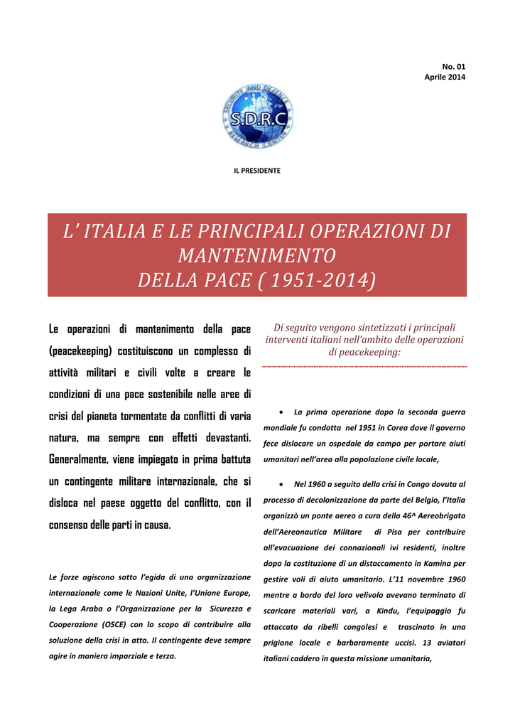 No. 01 Aprile 2014 IL PRESIDENTE L’ ITALIA E LE PRINCIPALI OPERAZIONI DI MANTENIMENTO DELLA PACE ( 1951-2014) Le operazioni di mantenimento della pace (peacekeeping) costituiscono un complesso di Di seguito vengono sintetizzati i principali interventi italiani nell’ambito delle operazioni di peacekeeping: attività militari e civili volte a creare le condizioni di una pace sostenibile nelle aree di crisi del pianeta tormentate da conflitti di varia natura, ma sempre con effetti devastanti. Generalmente, viene impiegato in prima battuta un contingente militare internazionale, che si disloca nel paese oggetto del conflitto, con il consenso delle parti in causa. La prima operazione dopo la seconda guerra mondiale fu condotta nel 1951 in Corea dove il governo fece dislocare un ospedale da campo per portare aiuti umanitari nell’area alla popolazione civile locale, Nel 1960 a seguito della crisi in Congo dovuta al processo di decolonizzazione da parte del Belgio, l’Italia organizzò un ponte aereo a cura della 46^ Aereobrigata dell’Aereonautica Militare di Pisa per contribuire all’evacuazione dei connazionali ivi residenti, inoltre dopo la costituzione di un distaccamento in Kamina per Le forze agiscono sotto l’egida di una organizzazione gestire voli di aiuto umanitario. L’11 novembre 1960 internazionale come le Nazioni Unite, l’Unione Europe, mentre a bordo del loro velivolo avevano terminato di la Lega Araba o l’Organizzazione per la Sicurezza e scaricare materiali vari, a Kindu, l’equipaggio fu Cooperazione (OSCE) con lo scopo di contribuire alla attaccato da ribelli congolesi e soluzione della crisi in atto. Il contingente deve sempre prigione locale e barbaramente uccisi. 13 aviatori agire in maniera imparziale e terza. italiani caddero in questa missione umanitaria, trascinato in una Nel 1979 a seguito di risoluzione ONU, fu deliberata la costituzione di un contingente di “caschi blu” denominta (UNIFIL), a cavaliere del confine tra Libano e Israele. Nel 1979 fu dislocato a Naquora uno squadrone dell’Esercito con sei elicotteri italiani prima AB 204 e nel 1984 AB 205. Lo sqd. aveva il compito di trasporto, collegamento, evacuazione sanitaria di Golfo Persico, 1989 l’ONU inviò una Forza Militare Multinazionale a seguito della rivolta armata tra Angola e Namibia. L’Italia partecipò con assetti elicotteristici dell’Esercito con compiti logistici e di trasporto sanitario di emergenza (MEDEVAC), militari e civili, alle operazioni di bonifica da mine nel Mar Rosso e del Nel 1982 a seguito dell’ops. lanciata da Israele “ Pace in Galilea”, che comportava la distruzione e l’attacco di basi palestinesi ubicate all’interno della città (Beirut Est), al fine di evitare spargimenti di sangue tra i civili, dopo una lunga trattativa internazionale tra le parti in causa, vennero disarmati e sgomberati fuori Beirut , con la protezione dei bersaglieri del battaglione “Governolo, giunti a bordo di nave “Caorle” nel porto di Beirut il 12 settembre 1982. Furono sgomberati 3.000 1991 a seguito dell’invasione del Kuwait da parte delle truppe di Saddam Hussein, la comunità internazionale organizzò una risposta armata con in testa gli Stati Uniti che condussero l’ops. “Desert Shild”. L’Italia partecipò con sei F-104 dislocati in Turchia e il 21° Gruppo Navale nel Golfo Persico, successivamente furono inviati dieci Tornado quale contributo nazionale all’ops. “Desert Storm” per la liberazione del Kuwait, 1991 a seguito della costante e durissima siriani e 6.000 palestinesi. A seguito di in attacco ordito repressione verso la popolazione curda dell’Iraq da da guerriglieri maroniti che portò alla morte, si dice tra parte di Saddam Hussein, la NATO decise di intervenire 8.00 e 2.000 palestinesi nei campi di Sabra e Chatila, la in soccorso della popolazione dislocata al confine con la comunità internazionale si mobilitò ed inviò a Beirut Turchia, una Gran successivamente con l’invio di un contingente terrestre. Bretagna e Stati Uniti). Il contingente italiano forte di La “Folgore” con i suoi reparti partecipò alla missione circa 1.200 militari di leva ricevette il compito do fornire umanitaria che prese il nome di “Airone” Al comando sicurezza alla popolazione civile palestinese nei campi della missione si alternarono il generale Buscemi e il profughi di Sabra e Chatila e di Bourni el Barascni. Al generale Monticone, Forza Multinazionale (Italia, Francia, prima con un aviolancio di soccorsi e termine della missione, che si concluse a febbraio 1984, molto complicata, caratterizzata da continui attacchi, bombardamenti di artiglieria e azioni di cecchinaggio, il contingente lasciò sul campo un caduto, il marò Filippo Montesi, mentre gli americani 276 caduti e i francesi 78 soldati a causa di due attentati con auto bomba simultanei avvenuti il 23 ottobre 1983, al comando nazionale si susseguirono il colonnello Tosetti e il generale Angioni, 1991 a seguito di una incontrollata e di estrema gravità crisi che sconvolse l’intera Albania, molta popolazione civile lasciò il paese delle aquile e sbarcò nelle vicine coste pugliesi, calabre e greche con ogni mezzo reso disponibile. Una marea umana di profughi si riversò nella nostre terre bisognosi di assistenza. Il governo preoccupato per l’escalation di profughi, organizzò un intervento di aiuto umanitario in Albania con un contingente, su base Esercito, che prese il nome 1984-1988 la Marina Militare italiana partecipò con propri assetti, una nave appoggio e tre cacciamine, di ops. “Pellicano”. Pellicano ebbe termine ad aprile 1992, 1992-1994 a seguito della disastrosa situazione prevalentemente da albanesi che chiedevano politico-militare in Somalia e dalle evidenti gravissime l’indipendenza, determinò una serie di combattimenti condizioni comunità violenti all’interno della regione, ma anche ai confini internazionale e l’ONU decisero di intervenire con un con la Cro