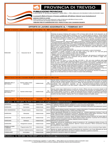CRESPANO DEL GRAPPA OFFERTE DI LAVORO AGGIORNATE AL 1 FEBBRAIO 2017 Richieste avviamento a selezione presentate ai sensi dell'art. 16 L. 56/87 e successive modificazioni RONCADE 1 Esecutore Cat. B Chiamata nel giorno 8 febbraio 2017 presso il CPI di Treviso dalle 8.30 alle 12.30. Esecutore cat. B presso Comune di Roncade Settore Finanziario; cat. B1; richiesta patente di guida B. Tempo parziale (33 ore settimanali) e determinato. Prova di selezione: attività amministrativo-contabile di base relativa ad adempimenti assegnati al settore (ad es. caricamento dati con utilizzo pc, archiviazione pratiche, ecc.). Gli interessati devono compilare il modello da ritirare presso lo sportello competente ovvero da scaricare dal sito www.provincia.treviso.it/index.php/modulistica? ricerca_frontend=&search_ufficio=&ricerca_tema_fe=&ricerca_sottotema_fe=&area_tematica=41&temi _modulistica=&chiavi_ricerca=&art_catid=150&cck=inserimento_modulistica&ricerca_libera=modello+a desione&boxchecked=0&search=ricerca_guest_tabella&task=search ed esibire un valido documento di riconoscimento al momento della presentazione. Ai fini della graduatoria, occorre dichiarare il valore ISEE in corso di validità rilasciato dai caaf o patronati; chi non dichiara il valore ISEE viene inserito in graduatoria con 300 punti in meno. Adesione avviamento a selezione via fax: Si informa che per la validità dell’adesione alla chiamata è necessario, a pena di esclusione: - trasmettere il modello compilato in ogni sua parte, entro e non oltre le ore 13.00 del giorno 08/02/2017, al Centro per l’Impiego di Treviso (fax 0422/656445) - allegare copia di un documento di identità in corso di validità; - dichiarazione, se espressamente richiesto nell'avviso di chiamata, del possesso di certificazioni (patenti, qualifiche professionali, ecc.) contenenti tutti gli elementi utili alle verifiche di legge (d.p.r. 445/2000): data, luogo ed ente di rilascio. REQUISITI RICHIESTI : Ai sensi dell'art. 38, commi 1 e 3 bis, del D.lgs. 30.3.2001 n. 165, così come modificato dalla legge 6.8.2013 n. 97, il requisito della cittadinanza italiana non è richiesto (fermi restando i requisiti del godimento dei diritti civili e politici anche negli Stati di appartenenza o provenienza, dell'adeguata conoscenza della lingua italiana e tutti gli altri requisiti previsti per i cittadini della Repubblica) per: - i cittadini di uno degli Stati membri dell'Unione Europea e i loro familiari, non aventi la cittadinanza di uno Stato membro, che siano titolari del diritto di soggiorno o del diritto di soggiorno permanente; - i cittadini di Paesi terzi che siano titolari del permesso di soggiorno UE per soggiornanti di lungo periodo o che siano titolari dello status di rifugiato ovvero dello status di protezione sussidiaria. Le persone avviate a selezione dovranno essere in possesso dei requisiti per l'accesso al pubblico impiego, tra cui l'idoneità fisica ed il titolo di studio di scuola media dell'obbligo. Determinato Offerte di lavoro riservate a lavoratori disabili per avviamenti numerici su ditte private NERVESA DELLA BATTAGLIA 1 Operaio settore metalmeccanico MORIAGO DELLA BATTAGLIA 1 Sede Lavorativa N. Profilo Professionale Operaio settore legno Indeterminato Operaio settore metalmeccanico (trattamento e rivestimento dei metalli). Offerta riservata ai lavoratori disabili iscritti alle categorie protette della provincia di Treviso con esclusione dei lavoratori con disabiliNU tà di tipo psichico ai sensi dell'art. 9 comma 4 L. 68/99. Gli interessati devono compilare la richiesta di 201702 inserimento nella graduatoria (reperibile nel sito http://www.trevisolavora.it/terzo_livello.aspx? IDLivello=30) e inviarla entro e non oltre martedì 7 febbraio 2017 con le modalità indicate nel modello stesso. Indeterminato Operaio settore legno (fabbricazione di mobili per arredo). Offerta riservata ai lavoratori disabili iscritti alle categorie protette della provincia di Treviso con esclusione dei lavoratori con disabilità di tipo psiNU chico ai sensi dell'art. 9 comma 4 L. 68/99. Gli interessati devono compilare la richiesta di inserimento 201701 nella graduatoria (reperibile nel sito http://www.trevisolavora.it/terzo_livello.aspx?IDLivello=30) e inviarla entro e non oltre martedì 7 febbraio 2017 con le modalità indicate nel modello stesso. Contratto Rif. Descrizione Conegliano - tel. 0438 22675 / fax 0438 411055 / e-mail [email protected] Cameriere per gelateria Germania, esperienza in servizio ai tavoli, preparazione coppe gelato, cappuccini, caffetteria. Richiesto diploma albeghiero e buona conocenza lingua inglese carrozziere, con esperienza in saldatora, carpenteria, verniciatura carrozzeria auto,allestimenti camion, 328431 furgoni programmatori software laureati o laureandi in materie informatiche. Si valutano profili senza esperien329330 za, conoscenza linguaggi java,php. Iniziale tempo determinato. operaio specializzato attrezzista cnc macchine utensili cnc . richiesta esperienza di almeno 3 anni nel 329357 campo delle lavorazioni meccaniche di precisione. Richiesto titolo di studio settore meccanica. ricerca rivolta a persona molto comptetente e dinamica, predisposta al lavoro di gruppo GERMANIA 2 Cameriere Determinato SUSEGANA 1 Carrozziere Indeterminato SAN VENDEMIANO 3 Programmatore Determinato SUSEGANA 1 Attrezzista Indeterminato SUSEGANA 1 Operaio qualificato Indeterminato SUSEGANA 1 Elettrauto Indeterminato 329703 elettrauto per riparazione camper SUSEGANA 1 Disegnatore autocad Indeterminato disegnatore autocad per progettazione utensili di precisione in 3d, compilazione distinte di lavoro. Ri330054 chiesta esperienza in analoga posizione, diploma o laurea meccanica. Ottima conoscenza autocad per progettazione, lingua inglese. GODEGA DI SANT'URBANO 1 Programmatore PLC Indeterminato 330071 programmatore plc con esperienza, in possesso di diploma inerente, buona conoscenza lingua inglese SUSEGANA 1 Operaio metalmeccanico Indeterminato 329791 CONEGLI