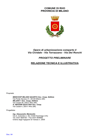 COMUNE DI RHO PROVINCIA DI MILANO Opere di urbanizzazione comparto 4 Via Cividale - Via Terrazzano - Via Dei Ronchi PROGETTO PRELIMINARE RELAZIONE TECNICA E ILLUSTRATIVA Proprietà: MIDICOOP MILANO QUARTA Soc. Coop. Edilizia Via Ponte Seveso 41, 20125 Milano (MI) MILANO 1 Soc. Coop. Edilizia Via Casati 29, 20017 Rho (MI) G. MAZZINI QUATTRO Soc. Coop. Via Casati 4, 20017 Rho (MI) Progettista: Ing. Alessandro Martarello Via A. Colombo n. 48, 21040 Sumirago (VA) Tel. 0331-909150 – Fax 0331-909682 Ordine degli Ingegneri di Varese n. 2505 Doc. 04 Ing. Martarello Alessandro, via A. Colombo n. 48, Sumirago (VA) 1. INTRODUZIONE L’intervento consiste nella realizzazione delle opere di urbanizzazione della lottizzazione del PA Comparto 4. Nello specifico le opere riguardano la realizzazione di una nuova strada, prevista dal PA che collegherà Via Cividale e Via Dei Ronchi, e la realizzazione di nuove aree parcheggio. Inoltre si provvederà alla realizzazione di un tratto ciclopedonale, che collega la pista ciclabile già esistente, da Via Cividale a Via Terrazzano, la piantumazione delle aree verdi e aiuole e infine la realizzazione di marciapiedi. Dal punto di vista esecutivo si prevedono le seguenti opere principali: 1) 2) 3) 4) 5) 6) 7) 8) 9) Demolizioni e rimozioni marciapiedi, pozzetti e pali di illuminazione; Scavo di sbancamento e realizzazione sottofondo stradale; Realizzazione rete elettrica, rete idrica, rete telefonica, rete gas, impianto di irrigazione e linee fognarie; Posa cordoli di calcestruzzo lisciato; Realizzazione marciapiedi e pista ciclabile; Realizzazione fondo stradale e manto di usura in materiale bituminoso; Realizzazione pavimentazione parcheggi con masselli autobloccanti; Sistemazione zone a verde, aiuole e piantumazione. Segnaletica stradale orizzontale e verticale. Non sono previsti espropri in quanto le aree oggetto del presente progetto sono di proprietà dei proponenti o direttamente del comune, per cui sono già nella disponibilità dei proponenti. Come previsto nella bozza di convenzione, il progetto esecutivo dovrà essere redatto entro 90gg. dal ricevimento della comunicazione scritta da parte del Comune dell'avvenuta approvazione del progetto definitivo e contestuale rilascio del permesso di costruire a titolo gratuito. In tale progetto esecutivo dovrà essere indicato il tempo massimo in cui le opere dovranno essere completate. Tale termine risulterà vincolante per il proponente. In ogni caso, le opere dovranno essere completate entro l’occupazione del primo fabbricato utile. Ai fini della definizione dei costi di approvvigionamento e smaltimento, la cava di riferimento è situata in Arluno (MI), Via per Pogliano n. 110, ed ha la disponibilità per la raccolta e fornitura dei materiali litoidi richiesti dal presente progetto. Per lo smaltimento dei materiali di demolizione si può fare riferimento all’impianto sito in Via pr. Treviso - Legnano (MI). La valutazione economica del progetto è stata suddivisa in due capitoli (“strade” e “parcheggio”) in quanto le opere in proge tto sono oggetto di scomputo oneri; le opere stradali rientrano nelle opere di urbanizzazione primaria mentre la realizzazione del parcheggio è definibile come opera di urbanizzazione secondaria. Tale suddivisione è anche esplicitata nella Tav. 21 - planimetria reti in cui si individua il perimetro definito a “parcheggio”. 2. AREE PER SPAZI PUBBLICI DI SOSTA E PARCHEGGIO L’intervento prevede la destinazione ad aree per spazi pubblici di sosta e parcheggio di una superficie pari a mq 1993 corrispondenti ad un numero totale di 85 parcheggi. Le aree parcheggio sono così suddivise: Area parcheggio su Via Cividale (su strada): mq 180, posti auto totali 14 (di cui n. 1 per disabili); Area parcheggio nuova Via di PA (su strada): lato sinistro mq 173, posti auto totali 13 (di cui n.1 per disabili); sul lato destro, in seguito all’attivazione di altra lottizzazione, potranno essere successivamente sviluppati altri 130 mq, per n. 10 posti auto (area tratteggiata su planimetria di progetto); Area parcheggio Via Dei Ronchi – Via Terrazzano: mq 1640, posti auto totali 58 (di cui n. 2 per disabili). Tale dotazione verifica lo standard urbanistico (Legge: aprile 1968 n. 1444) dei parcheggi pubblici di 3 mq/ab: mc (24000 :100)x 3 = mq 720 < 1.993. Lo spazio per un posto auto, all’interno del parcheggio, è pari a m. 2,60 x 5,00 comprensivo di cm. 35 a destra e cm. 45 a sinistra oltre la sagoma dell’autovettura media. Fra due automobili accostate si realizza un corridoio di cm 80, sufficiente per il passaggio di una persona. Doc. 04 Opere di urbanizzazione comparto 4 Via Cividale - Via Terrazzano - Via Dei Ronchi, Rho (MI) 2 500 Ing. Martarello Alessandro, via A. Colombo n. 48, Sumirago (VA) 35 45 260 Figura 1 Dimensioni degli stalli I posti auto su Via Cividale e lungo la nuova via di PA avranno dimensioni pari a m 2,50 x 5,00. 2.1 DIMENSIONAMENTO DEGLI SPAZI DI MANOVRA Per le aree parcheggio su strada l’area di manovra è la corsia della strada stessa. Fra tutte le soluzioni, la configurazione a pettine richiede, a parità di numero di posteggi, la minore superficie e offre quindi la migliore utilizzazione dello spazio. 500 130 500 600 500 MARCIAPIEDE variabile Figura 2 Dimensionamento degli spazi di manovra 2.2 ORGANIZZAZIONE DEGLI SPAZI DI CIRCOLAZIONE Lo spazio per la circolazione dei veicoli è stato dimensionato ed organizzato in modo adeguato, compatibilmente sia con la disposizione dei posteggi sia con l’estensione del piano di parcamento. Il senso di marcia, unico, è stato scelto secondo uno schema logico finalizzato a velocizzare la ricerca del posto libero ed a facilitarvi l’accesso; la disposizione è ripartita nel seguente schema: Doc. 04 Opere di urbanizzazione comparto 4 Via Cividale - Via Terrazzano - Via Dei Ronchi, Rho (MI) 3 Ing. Martarello Alessandro, via A. Colombo n. 48, Sumirago (VA) Figura 3 Schema parcheggio via Dei Ronchi La strada per la 