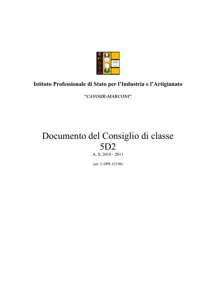 Istituto Professionale di Stato per l’Industria e l’Artigianato “CAVOUR-MARCONI” Documento del Consiglio di classe 5D2 A. S. 2010 - 2011 (art. 5, DPR 323/98) IPSIA “ Cavour-Marconi” Documento del consiglio della classe 5^D1 a.s.2010-2011 INDICE Modello di figura professionale Competenze professionali Obiettivi didattico - educativi Profilo della classe Griglia di valutazione Attività di recupero Attività extra – curriculari Schede delle singole discipline Alternanza scuola lavoro: stage in azienda Storia della classe Modalità di lavoro consiglio di classe Strumenti di verifica Prove scritte effettuate Il Consiglio di classe Griglie di valutazione delle prove scritte Griglia di valutazione del colloquio orale PROGRAMMI SINGOLE DISCIPLINE ITALIANO (Contenuti svolti) (Contenuti svolti) STORIA (Contenuti svolti) MATEMATICA (Contenuti svolti) SISTEMI (Contenuti svolti) ELETTRONICA (Contenuti svolti) RELIGIONE (Contenuti svolti) EDUCAZIONE FISICA (Contenuti svolti) Testi delle simulazioni svolte: - Simulazione I° prova, del 8/ 04/ 2010; - Simulazione II° prova, del 7/ 04/ 2010; - Simulazione III° prova, del 11/ 04/ 2010. Pag. “ 3 “ 4 “ 5 “ 6 “ 7 “ 8 “ 8 “ 9 “ 20 “ 21 “ 22 “ 22 “ 23 “ 24 “ “ “ 26 30 31 Vds.all. 1- 23 INGLESE 2 IPSIA “ Cavour-Marconi” Documento del consiglio della classe 5^D1 a.s.2010-2011 MODELLO DI FIGURA PROFESSIONALE TECNICO DELLE INDUSTRIE ELETTRONICHE Il tecnico delle industrie elettroniche sa svolgere un ruolo attivo e responsabile nella realizzazione di semplici progetti, esecuzione di compiti, coordinamento di personale, organizzazione di risorse e gestione di unità produttive nei campi dell'elettronica industriale e delle telecomunicazioni. Sia nel lavoro autonomo che in quello produttivo industriale, è in grado di progettare circuiti elettrici di comune applicazione nel campo dell'elettronica industriale e delle telecomunicazioni; sa utilizzare la documentazione tecnica relativa ai componenti e ai dispositivi elettronici; sa scegliere dispositivi e apparecchiature in base a criteri tecnici ed economici;sa installare e collaudare sistemi di controllo e telecomunicazione, intervenendo in fase di manutenzione di primo livello; sa utilizzare il Personal Computer e i programmi applicativi inerenti al Corso;sa gestire la conduzione (da titolare o da responsabile tecnico) di imprese installatrici di dispositivi elettronici e di sistemi di telecomunicazione. Sbocchi occupazionali Impiego nelle industrie del settore pubblico e privato. Aiutanti tecnici di laboratorio nelle Scuole Secondarie di 2° grado. Attività in proprio. Accesso all'università e a corsi di specializzazione. 3 IPSIA “ Cavour-Marconi” Documento del consiglio della classe 5^D1 a.s.2010-2011 COMPETENZE PROFESSIONALI IL TECNICO DELLE INDUSTRIE ELETTRONICHE è, inoltre, in possesso delle seguenti conoscenze, competenze, capacità: conosce le fondamentali tecniche di codifica ed elaborazione dell’ informazione attraverso dispositivi e circuiti elettronici; conosce le fondamentali soluzioni circuitali per il condizionamento e l’ elaborazione dei segnali sia in forma analogica che numerica; conosce le fondamentali problematiche e le soluzioni circuitali connesse alla trasmissione dell’ informazione, sia su mezzi trasmessivi cablati che nello spazio libero; conosce le tecniche di modulazione dei segnali con particolare riguardo alla trasmissione del suono, dell’ immagine, dei dati; conosce le architetture essenziali dei sistemi di acquisizione dati e controllo, nonché dei sistemi a logica programmabile, anche strutturati in reti; sa intervenire nella progettazione, realizzazione, collaudo e conduzione di semplici impianti elettrici, di controllo industriali e di telecomunicazioni; sa scegliere ed utilizzare apparecchi e dispositivi elettrici ed elettronici, anche programmabili, offerti dal mercato; sa descrivere e documentare il lavoro svolto; sa consultare manuali d’uso, fogli di specifiche, documenti tecnici vari e software applicativi nel campo elettronico; sa utilizzare almeno un linguaggio di programmazione ad alto livello nonché i più diffusi sistemi operativi per PC; sa orientarsi, sia in modo autonomo sia come componente di un gruppo di lavoro, nei diversificati e mutevoli contesti aziendali; è in grado di elaborare aspetti tecnici, applicativi e comunicativi richiesti dal contesto di lavoro; sa scegliere e gestire le informazioni individuandone la priorità nell’ ambito del processo produttivo; è in grado di aggiornarsi professionalmente e sa orientarsi nell’ acquisizione di nuove tecnologie. 4 IPSIA “ Cavour-Marconi” Documento del consiglio della classe 5^D1 a.s.2010-2011 OBIETTIVI DIDATTICO EDUCATIVI Generali del corso Saper percepire le innovazioni culturali con particolare riferimento alla dinamica aziendale ed al collegamento con il mondo del lavoro SAPER ESSERE Trasversali a tutte le discipline Autocontrollo Continuità nell’impegno e nell’attenzione senso di responsabilità nei confronti di sé e degli altri spirito di tolleranza , di dialogo e di collaborazione SAPER FARE Conoscenze Conoscere i contenuti delle varie discipline Possiede un metodo di lavoro Autonomo Capacità Possiede capacità di analisi e di sintesi sa rispettare tempi e consegne Comuni Possiede capacità critiche e di valutazione Conoscere i linguaggi relativi alle varie discipline Specifici Competenze Trasmette il proprio messaggio Possiede capacità di con chiarezza e con un collegamento delle varie linguaggio appropriato sia in tematiche disciplinari forma scritta che orale Gli obiettivi specifici sono riportati in allegato alle singole programmazioni 5 IPSIA “ Cavour-Marconi” Documento del consiglio della classe 5^D1 a.s.2010-2011 PROFILO DELLA CLASSE La classe è composta da 12 alunni, di cui due stranieri. Uno di essi risulta ripetente nel proprio percorso scolastico, il gruppo , proveniente dalla ex 4^D2, è rimasto per lo più i