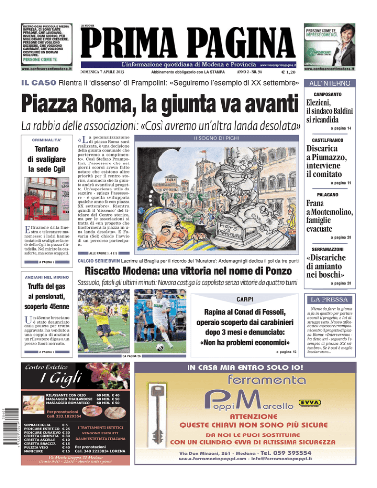 www.lanuovaprimapagina.it DOMENICA 7 APRILE 2013 ANNO 2 - NR. 94 Abbinamento obbligatorio con LA STAMPA € 1,20 IL CASO Rientra il ‘dissenso’ di Prampolini: «Seguiremo l’esempio di XX settembre» Piazza Roma, la giunta va avanti La rabbia delle associazioni: «Così avremo un’altra landa desolata» a pedonalizzazione di piazza Roma sarà realizzata, è una decisione della giunta comunale che porteremo a compimento». Così Stefano Prampolini, l’assessore che nei giorni scorsi aveva fatto notare che esistono altre priorità per il centro storico, annuncia che la giunta andrà avanti sul progetto. Un’esperienza utile da seguire - spiega l’assessore - è quella sviluppata qualche anno fa con piazza XX settembre». Rientra quindi il ‘dissenso’ del titolare del Centro storico, ma per le associazioni si tratta di «un progetto che trasformerà la piazza in una landa desolata». E Favarin (Sel) chiede l’avvio di un percorso partecipato. «L CRIMINALITA’ Tentano di svaligiare la sede Cgil ffrazione dalla finestra e telecamere manomesse: i ladri hanno tentato di svaligiare la sede della Cgil in piazza Cittadella. Nel mirino la cassaforte, ma sono scappati. E II SOGNO DI PIGHI Elezioni, il sindaco Baldini si ricandida a pagina 14 Discarica a Piumazzo, interviene il comitato a pagina 19 PALAGANO Frana a Montemolino, famiglie evacuate a pagina 20 SERRAMAZZONI .ALLE PAGINE 3, 4 E 5 Riscatto Modena: una vittoria nel nome di Ponzo ANZIANI NEL MIRINO Truffa del gas ai pensionati, scoperto 45enne CAMPOSANTO CASTELFRANCO CALCIO SERIE BWIN Lacrime al Braglia per il ricordo del 'Muratore': Ardemagni gli dedica il gol da tre punti .A PAGINA 7 ALL’INTERNO Sassuolo, fatali gli ultimi minuti: Novara castiga la capolista senza vittorie da quattro turni n 45enne bresciano è stato denunciato dalla polizia per truffa aggravata: ha venduto a una coppia di anziani un rilevatore di gas a un prezzo fuori mercato. U «Discariche di amianto nei boschi» a pagina 20 CARPI LA PRESSA Rapina al Conad di Fossoli, operaio scoperto dai carabinieri dopo 3 mesi e denunciato: «Non ha problemi economici» Niente da fare: la giunta si fa in quattro per portare avanti il progetto, e lui distrugge tutto. Nuovo affondo dell’assessore Prampolini contro il progetto di piazza Roma: «Interverremo ha detto ieri - seguendo l’esempio di piazza XX settembre». Se è così è meglio lasciar stare... a pagina 13 .A PAGINA 7 .DA PAGINA 26 Centro Estetico IN CASA MIA ENTRO SOLO IO! I Gigli ferramenta y(7HC2H9*RMMOLT( +@!"!&!z!/ RILASSANTE CON OLIO MASSAGGIO THAILANDESE MASSAGGIO ROMANTICO 17G/YTwSFFzAyQuyFosuFaf1klqGm5UxkZYSZvPZWc4= 60 MIN. € 40 60 MIN. € 50 60 MIN. € 50 Per prenotazioni Cell. 333.1829354 SOPRACCIGLIA PEDICURE ESTETICO PEDICURE CURATIVO CERETTA COMPLETA CERETTA ASCELLE CERETTA BRACCIA PULIZIA VISO MANICURE €5 € 25 € 30 € 30 € 10 € 15 € 40 € 15 I TRATTAMENTI ESTETICI VENGONO ESEGUITI DA UN'ESTETISTA ITALIANA Per prenotazioni Cell. 340 2223834 LORENA Via Monte Grappa, 70 Modena Orario 9:00 - 22:00 - Aperto tutti i giorni PM oppi arcello ATTENZIONE QUESTE CHIAVI NON SONO PIÙ SICURE DA NOI LE PUOI SOSTITUIRE CON UN CILINDRO EVVA DI ALTISSIMA SICUREZZA Via Don Minzoni, 261 - Modena - Tel. 059 393554 www.ferramentapoppi.com - [email protected] 2| | DOMENICA 7 APRILE 2013 PRENOTA LA TUA PIZZA 059.907272 Specialità: SALTIMBOCCA - PIZZA TONDA - PIZZA AL METRO - PIZZA AL TAGLIO CONSEGNA A DOMICILIO SERVIZIO SPECIALE PER LE DITTE: CONSEGNA GRATUITA A MEZZOGIORNO E ALLA SERA APERTO TUTTI I GIORNI (COMPRESO SABATO E DOMENICA) ANCHE A MEZZOGIORNO CHIUSO IL LUNEDÌ SORBARA (MO) - Via Ravarino - Carpi, 189 DOMENICA 7 APRILE 2013 | PRIMO PIANO | 3 BLITZ IN PIAZZA A sinistra e a destra, due momenti del sopralluogo in piazza Roma, venerdì pomeriggio, del sindaco Giorgio Pighi e dell’assessore al Centro storico Stefano Prampolini IL CASO Dopo la querelle sulle ‘priorità’ per il centro, la giunta si ricompatta: «Avanti con la pedonalizzazione» di LUCA GARDINALE agari l’esempio poteva essere più felice - il ‘modello’ indicato dall ’assessore è piazza XX settembre - ma il significato è chiarissimo: dissenso o no, il progetto di pedonalizzazione di piazza Roma va avanti. Dopo le perplessità avanzate in settimane dall’assessore al Centro storico Stefano Prampolini, che, pur appoggiando il progetto, ha fanno notare che ci sono altre priorità per la riqualificazione del centro - il completamento del progetto XX settembre, appunto, e i lavori per le chiese e gli edifici pubblici lesionati dal terremoto - la giunta si ricompatta e manda avanti proprio Prampolini per spiegare che con piazza Roma si va avanti. M «Decisione della giunta» «La pedonalizzazione di piazza Roma sarà realizzata - spiega l’assessore Prampolini in una nota del Comune - è una decisione della giunta comunale che porteremo a compimento. Il rapporto con la Soprintendenza per la definizione del Piazza Roma, rientra il ‘dissenso’di Prampolini L’assessore: «L’esperienza da seguire è quella di XX settembre» RESTYLING Il progetto dell’architetto Giovanni Cerfogli per la riqualificazione di piazza Roma progetto preliminare di intervento procede speditamente - spiega Prampolini - e una volta ottenuto l’ok definiremo i tempi di realizzazione insieme alle associazioni di categoria e ai commercianti della zona. Il percorso per la pedonalizzazione di piazza Roma, infatti, dovrà svilupparsi in un dialogo con i residenti e con chi in quell’area ha la propria attività. Ascolteremo tutte le problematicità che man mano emergeranno e cercheremo, insieme, di trovare le soluzioni. La piazza è tra le più belle d’Italia, e sono convinto aggiunge l’assessore che anche i commercian- ti arriveranno ad apprezzare il risultato del lavoro che faremo insieme». Tempi I tempi restano quindi quelli fissati dalla giunta: risolta la questione del via libera della Sop r i n t e n d e n z a c h e d ovrebbe arri