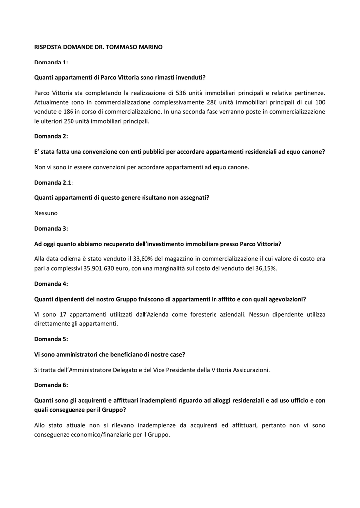 RISPOSTA DOMANDE DR. TOMMASO MARINO Domanda 1: Quanti appartamenti di Parco Vittoria sono rimasti invenduti? Parco Vittoria sta completando la realizzazione di 536 unità immobiliari principali e relative pertinenze. Attualmente sono in commercializzazione complessivamente 286 unità immobiliari principali di cui 100 vendute e 186 in corso di commercializzazione. In una seconda fase verranno poste in commercializzazione le ulteriori 250 unità immobiliari principali. Domanda 2: E’ stata fatta una convenzione con enti pubblici per accordare appartamenti residenziali ad equo canone? Non vi sono in essere convenzioni per accordare appartamenti ad equo canone. Domanda 2.1: Quanti appartamenti di questo genere risultano non assegnati? Nessuno Domanda 3: Ad oggi quanto abbiamo recuperato dell’investimento immobiliare presso Parco Vittoria? Alla data odierna è stato venduto il 33,80% del magazzino in commercializzazione il cui valore di costo era pari a complessivi 35.901.630 euro, con una marginalità sul costo del venduto del 36,15%. Domanda 4: Quanti dipendenti del nostro Gruppo fruiscono di appartamenti in affitto e con quali agevolazioni? Vi sono 17 appartamenti utilizzati dall’Azienda come foresterie aziendali. Nessun dipendente utilizza direttamente gli appartamenti. Domanda 5: Vi sono amministratori che beneficiano di nostre case? Si tratta dell’Amministratore Delegato e del Vice Presidente della Vittoria Assicurazioni. Domanda 6: Quanti sono gli acquirenti e affittuari inadempienti riguardo ad alloggi residenziali e ad uso ufficio e con quali conseguenze per il Gruppo? Allo stato attuale non si rilevano inadempienze da acquirenti ed affittuari, pertanto non vi sono conseguenze economico/finanziarie per il Gruppo. Domanda 7: Dato che ho provato a fare un raffronto del servizio assicurazioni auto che offrite con il servizio on line di altre assicurazioni, trovando che con Vittoria Assicurazioni pagherei un premio doppio, mi chiedo se siate certi di fare i prezzi migliori. I nostri premi sono adeguati rispetto ad obiettivi di utile e di sviluppo e non si esclude in certe fattispecie di essere più alti della concorrenza. Domanda 8: Di quale scontistica auto godono i dirigenti del gruppo per le assicurazioni auto? Non c’è differenza tra Dirigenti e Dipendenti: 30% di sconto sulla garanzia RCAuto 50% di sconto sulle rimanenti garanzie Domanda 9: Cosa c'è di vero in un proclama di un'agenzia di Vittoria Assicurazioni a Malpensa, che promette sconti fino al 50% (V. Allegato)? Si tratta di una convenzione applicata ai dipendenti ed ai loro famigliari dei Dipendenti di Malpensa gestita dalla nostra agenzia di Busto Arsizio che può arrivare per i clienti virtuosi, ad uno sconto del 50%. Domanda 10: Quali rilievi Consob abbiamo subito? Non abbiamo subito alcun rilievo Consob. Domanda 11: Di quali uffici stampa ci serviamo? Non ci avvaliamo di aziende specializzate, ma svolgiamo l’attività attraverso l’utilizzo di strutture interne. Domanda 12: Perché codesti gli uffici non hanno la cultura di far riconoscere chi firmi le lettere in uscita? Forse a motivo di privacy nei confronti dei clienti e dei soci (si veda lettera firmata allegata)? La responsabilità delle comunicazioni verso l’esterno ricade in capo al responsabile del singolo ufficio. Domanda 13: Abbiamo pagato prodotto nero? Non abbiamo pagato prodotti in nero. Domanda 14: Quanti sono le scoperture ex legge 68/1999 e quante le coperture? Le scoperture sono una mentre le coperture sono 29. Domanda 15: E' stato chiesto il contributo esonerativo ex art. 5, co. 3, legge 68/1999? E’ in corso la richiesta a seguito della denuncia al 31 12 2014. Domanda 15.1: In caso affermativo siamo in regola con i relativi contributi? E’ in corso la richiesta. Domanda 16: Sono stati adempiuti gli obblighi ex art. 7, legge predetta? Le assunzioni sono al 100% nominative; non sono state fatte convenzioni. Domanda 17: Quante sono state le inadempimenti ex art. 15, co. 1, legge 68/1999? Nessuna inadempienza. Domanda 18: Quante risoluzioni sono avvenute ex art. 10, legge anzidetta? Sono stati rispettati gli obblighi di cui co. 5 del medesimo articolo? Nessuna risoluzione. Domanda 19: Abbiamo assunto personale in regime di jobs act? Sono state assunte tre persone con contratto a tempo determinato, che scadranno nel corso del 2015; se verranno confermate usufruiremo delle agevolazioni Nel 2015 sono stati trasformati quattro contratti stipulati nel 2013/2014, per i quali usufruiremo delle agevolazioni previste dal Job Act. Domanda 20: Abbiamo affidato consulenze a dipendenti pubblici? Abbiamo affidato incarichi a dipendenti pubblici nel rispetto delle norme di legge vigenti. Domanda 21: Quali sono le principali banche con cui intratteniamo rapporti finanziari? Si tratta di principali Istituti Italiani: Intesa San Paolo, Unicredit, Cariparma, UBI Banca. Domanda 22: A cosa sono dovute le ingenti perdite delle seguenti nostre controllate al 100%: Vittoria Immobiliare, Immobiliare Bilancia, Immobiliare Bilancia Prima, Vaimm Sviluppo, VP Sviluppo? Vittoria Properties ed Interbilancia? Le perdite rilevate dalle società sono essenzialmente dovute al rallentamento delle vendite a causa dell’andamento del mercato immobiliare; nel caso in cui è presente debito finanziario dal costo del servizio del debito, dai costi di gestione delle iniziative non patrimonializzabili ad incremento delle rimanenze di magazzino e dalla fiscalità sui magazzini immobiliari invenduti. Al fine della razionalizzazione dei costi e dell’efficentamento del comparto, il Gruppo Vittoria, ha avviato un processo di ristrutturazione delle società immobiliari che ha previsto sia la riduzione dei veicoli ad uopo costituiti al fine della riduzione della catena partecipativa, sia l’intervento con capitale proprio al fine della riduzione del debito finanziario. Le operazioni poste in essere mostreranno i loro effetti economico finanziari a partire dall’esercizio 2015. Domand