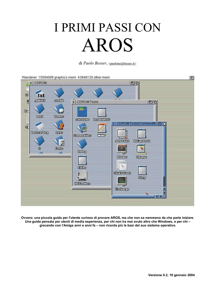 I PRIMI PASSI CON AROS di Paolo Besser, <[email protected]> Ovvero: una piccola guida per l'utente curioso di provare AROS, ma che non sa nemmeno da che parte iniziare. Una guida pensata per utenti di media esperienza, per chi non ha mai avuto altro che Windows, e per chi – giocando con l'Amiga anni e anni fa – non ricorda più le basi del suo sistema operativo. Versione 0.2, 18 gennaio 2004 INTRODUZIONE AROS è un sistema operativo open source molto interessante, soprattutto per i vecchi amighisti. Il suo scopo, infatti, è quello di essere compatibile con AmigaOS 3.1, almeno a livello di API e di codici sorgenti, su tutte le piattaforme per cui verrà effettuato un porting. Non solo: un'eventuale versione Amiga di AROS sarà compatibile anche a livello binario con tutti i programmi scritti per AmigaOS 3.1. Ciò che mi preme fare con questa guida veloce, tuttavia, è mettervi nelle condizioni di poter provare AROS anche sul vostro computer: mentre scrivo, infatti, il codice è ancora troppo acerbo per garantire una totale compatibilità con tutta la varietà di schede e configurazioni esistenti. Chiunque proverà AROS, quindi, sappia subito che un insuccesso è altamente probabile: poco male, prima o poi funzionerà. OCCORRENTE Per far girare AROS serve un PC (ovvio) con processore Pentium, 16 MB di RAM o anche di più, una scheda video qualsiasi AGP o PCI, purché dotata di almeno 2 MB di memoria video e sia perfettamente compatibile con lo standard VESA. Serve poi un drive per floppy disk da 1,44 MB e un lettore CD-ROM. La scheda madre dovrà preferibilmente effettuare il boot da CD-ROM. PRIMA DI TUTTO Colleghiamoci al sito www.aros.org, e scegliamo la pagina dei download dal menu a sinistra. Scarichiamo le seguenti componenti: – – i386-pc-boot-iso la versione su CD di AROS i386-pc-boot-floppy il floppy di avvio di AROS Per il momento non serve nient'altro. Ora andiamo alla pagina www.burn4free.com e scarichiamo il programma di masterizzazione gratuito Burn4free. Naturalmente va bene anche qualunque altro programma analogo. Consiglio questo semplicemente perché è gratuito e fa tutte le cose che intediamo fare in questo turorial. Andiamo alla pagina http://uranus.it.swin.edu.au/~jn/linux/rawwrite.htm e scarichiamo Rawrite per Windows. Andrà estratto in una cartella (per esempio C:\programmi\rawrite) e bisognerà ricordarsi che è lì, visto che non piazza icone sul desktop o nel menu avvio. Poco male, se siamo abbastanza in gamba, possiamo farlo noi, altrimenti consiglio vivamente di imparare a usare Windows prima di fare esperimenti con altri sistemi operativi! Infine, ultimo ma non meno importante, procuriamoci un programma di compressione che gestisca i file tar.bz2, il formato in cui vengono normalmente compresse le release di AROS. Il programma ideale è WinRAR, www.rarsoft.com. Installiamolo subito. CREIAMO IL FLOPPY E IL CD DI AVVIO Per cominciare, ci tocca estrarre dagli archivi scaricati da aros.org i file che ci interessano. Essi sono rispettivamente aros.iso (l'immagine del CD) e aros.bin (l'immagine del floppy). Per comodità, vi consiglio di piazzarli entrambi in una directory temporanea, per esempio C:\aros. Per farlo, possiamo usare WinRAR, cliccando due volte sui due archivi, scegliendo “Estrai” e poi specificando C:\aros come percorso di estrazione. La directory verrà creata automaticamente. Fatto ciò, possiamo finalmente iniziare. Infiliamo un dischetto vuoto da 1,44 MB nel drive. Apriamo Rawrite, dalla posizione in cui lo avevamo salvato, e posizioniamoci sul pannello “Write”. Apparirà una finestra di dialogo simile a quella qui sotto, a sinistra: Lasciamo invariate le opzioni principali, e osserviamo la finestrella chiamata “Image file”: sulla destra c'è un bottone con tre puntini [...]. Clicchiamoci sopra, e apparirà la finestra di dialogo sulla destra. Dove c'è scritto “Tipo file:”, clicchiamo sulla freccetta e selezioniamo “Tutti i file” (o “all files” a seconda del sistema operativo). Spostiamoci con il bottone in alto “cerca in” in C:\aros, e scegliamo di aprire “aros.bin”. A questo punto, possiamo cliccare su Apri. Appena sparirà il request, clicchiamo sul pulsante [Write] nella finestra principale di Rawrite, e attendiamo che il floppy finisca di frullare. Se tutto andrà per il verso giusto, al termine dell'operazione Rawrite ci confermerà che la scrittura è avvenuta con successo. Passiamo ora al CD. Inseriamo un CD vergine (anche da 650 MB, tanto la ISO non lo occuperebbe tutto comunque) nel masterizzatore, e lanciamo Burn4free. Apparirà la sua interfaccia utente. Se preferiamo, scegliamo la lingua italiana così sarà più facile da usare. Clicchiamo sul quarto bottone da sinistra, nella prima fila di pulsanti, quello chiamato “Scrivi ISO”. Apparirà il solito file request di Windows, che ci consentirà di localizzare la ISO che ci interessa. Ovviamente si tratta di Aros.iso, che si trova come al solito in C:\Aros (o dove avevamo preferito estrarla qualche passaggio fa). Il masterizzatore comincerà a frullare e andrà avanti a farlo per qualche minuto. Al termine della scrittura, comunque, saremo pronti per fare un tuffo nel nostro nuovo sistema operativo. PREPARAZIONE AL BOOT A questo punto, non ci manca davvero nulla. Inseriamo il CD di AROS nel lettore principale (è consigliabile che il lettore CDROM sia montato sul computer come master del secondo canale IDE), e teniamo il floppy fuori dal drive per il momento. Riavviamo il computer e, dopo il reset, entriamo nel BIOS. Configuriamo la macchina per eseguire il boot in quest'ordine: Prima periferica: CDROM Seconda periferica: Floppy A Terza periferica: Hard disk Ogni computer ha delle opzioni diverse per ottenere questo risultato, per cui dovrete necessariamente arrangiarvi. Se non sapete come fare, o non avete neppure la più pallida idea di cosa sia un BIOS, lasciate perdere per il momento, e riprovate più avanti, quando avrete acquisito la ne