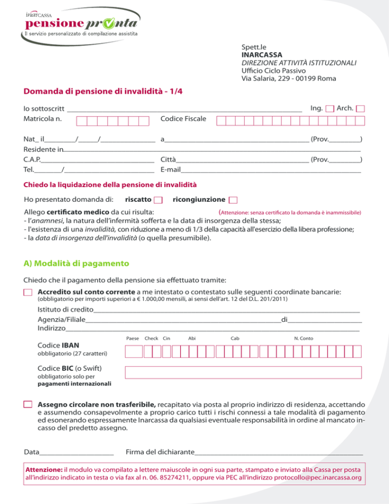 Spett.le INARCASSA DIREZIONE ATTIVITÀ ISTITUZIONALI Ufficio Ciclo Passivo Via Salaria, 229 - 00199 Roma Domanda di pensione di invalidità - 1/4 Io sottoscritt ____________________________________________________________ Matricola n. Codice Fiscale Ing. Arch. Nat_ il________/_____/______________ a_____________________________________ (Prov.________) Residente in____________________________________________________________________________ C.A.P._____________________________ Città__________________________________ (Prov.________) Tel._______/_______________________ E-mail______________________________________________ Chiedo la liquidazione della pensione di invalidità Ho presentato domanda di: riscatto ricongiunzione Allego certificato medico da cui risulta: (Attenzione: senza certificato la domanda è inammissibile) - l’anamnesi, la natura dell’infermità sofferta e la data di insorgenza della stessa; - l'esistenza di una invalidità, con riduzione a meno di 1/3 della capacità all'esercizio della libera professione; - la data di insorgenza dell'invalidità (o quella presumibile). A) Modalità di pagamento Chiedo che il pagamento della pensione sia effettuato tramite: Accredito sul conto corrente a me intestato o contestato sulle seguenti coordinate bancarie: (obbligatorio per importi superiori a € 1.000,00 mensili, ai sensi dell’art. 12 del D.L. 201/2011) Istituto di credito____________________________________________________________________ Agenzia/Filiale__________________________________________________di___________________ Indirizzo___________________________________________________________________________ Paese Check Cin Abi Cab N. Conto Codice IBAN obbligatorio (27 caratteri) Codice BIC (o Swift) obbligatorio solo per pagamenti internazionali Assegno circolare non trasferibile, recapitato via posta al proprio indirizzo di residenza, accettando e assumendo consapevolmente a proprio carico tutti i rischi connessi a tale modalità di pagamento ed esonerando espressamente Inarcassa da qualsiasi eventuale responsabilità in ordine al mancato incasso del predetto assegno. Data___________________ Firma del dichiarante___________________________________________ Attenzione: il modulo va compilato a lettere maiuscole in ogni sua parte, stampato e inviato alla Cassa per posta all’indirizzo indicato in testa o via fax al n. 06. 85274211, oppure via PEC all’indirizzo [email protected] Domanda di pensione di invalidità - 2/4 B) Dichiarazione relativa alla posizione lavorativa e assicurativa Cosciente della responsabilità penale cui posso andare incontro in caso di dichiarazioni mendaci o di esibizione di atto falso o contenente dati non più rispondenti a verità, a norma dell'art. 76 del D.P.R. 445 del 28.12.2000, ai fini del calcolo della pensione, dichiaro: di non essere titolare di pensione a carico di altro ente di essere pensionato da__________________ tipologia pensione_____________________________ ente erogatore_______________________________________________________________________ la media dei redditi non professionali conseguiti nel triennio precedente la domanda di pensione, siano essi imponibili o esenti da imposte è pari a €__________________________________________ Dati reddituali presuntivi per l’anno precedente la domanda di pensione: Reddito professionale €____________________ Volume di affari IVA €____________________ In caso di mancata indicazione sarà assunto come valore quello dichiarato l’anno precedente. N.B. La dichiarazione presuntiva non esime l’obbligo di presentare la dichiarazione completa alla scadenza ordinaria. Sono consapevole che eventuali variazioni attinenti ai requisiti di iscrizione ad Inarcassa (variazioni di partita IVA, Albo professionale, assoggettamento ad altra forma di previdenza obbligatoria) incidono sul diritto e/o sulla misura della pensione e pertanto devono essere tempestivamente comunicate prima della definizione dell’istanza di pensionamento (utilizzare lo spazio sottostante). Altre eventuali dichiarazioni _______________________________________________________________________________________ _______________________________________________________________________________________ _______________________________________________________________________________________ C) Integrazione della pensione di importo inferiore al minimo Se l’importo della pensione da calcolo è inferiore al valore della pensione minima Inarcassa (€ 10.876 per l’anno 2017), il trattamento può essere integrato al minimo qualora il valore ISEE (Indicatore della Situazione Economica Equivalente) del nucleo familiare relativo all’anno precedente il diritto a pensione sia inferiore ad € 30.450,00. Nota bene: l’integrazione non spetta ai titolari di pensione di altro ente previdenziale Allego certificazione ISEE (rilasciata dal Comune, CAF o sedi INPS) per beneficiare dell’integrazione del trattamento Letto, firmato e sottoscritto: Data___________________ Firma del dichiarante___________________________________________ È necessario allegare copia di un valido documento di identità Attenzione: il modulo va compilato a lettere maiuscole in ogni sua parte, stampato e inviato alla Cassa per posta all’indirizzo indicato in testa o via fax al n. 06. 85274211, oppure via PEC all’indirizzo [email protected] Domanda di pensione di invalidità - 3/4 D) Dichiarazione per il diritto alle detrazioni di imposta (artt. 11, 12 e 13 D.P.R. 917/1986 e successive modifiche e integrazioni) Dichiaro di avere diritto alle seguenti detrazioni di imposta: Detrazione per reddito di pensione (art. 13 TUIR) SI NO Esenzione fiscale per pensione non superiore a € 7.500 (art. 11 TUIR) SI NO Per titolari dei soli redditi di pensione, reddito dell’abitazione principale e redditi di terreni di importo non superiore a € 185.92 annui. Detrazione per coniuge o primo figlio senza coniuge (art. 12 TUIR) (*) SI SI Per il coniuge a carico non legalmente ed ef