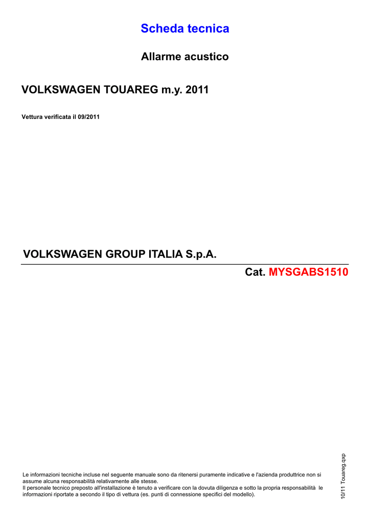 Scheda tecnica Allarme acustico VOLKSWAGEN TOUAREG m.y. 2011 Vettura verificata il 09/2011 Cat. MYSGABS1510 Le informazioni tecniche incluse nel seguente manuale sono da ritenersi puramente indicative e l'azienda produttrice non si assume alcuna responsabilità relativamente alle stesse. Il personale tecnico preposto all'installazione è tenuto a verificare con la dovuta diligenza e sotto la propria responsabilità le informazioni riportate a secondo il tipo di vettura (es. punti di connessione specifici del modello). 10/11 Touareg.qxp VOLKSWAGEN GROUP ITALIA S.p.A. NORME D’INSTALLAZIONE - Prima di eseguire qualsiasi operazione STACCARE IL MORSETTO NEGATIVO DELLA BATTERIA. - L’allarme deve essere installato esclusivamente all’interno dell’abitacolo vettura, mentre la sirena in un punto protetto all’interno del vano motore o nei passaruota. - Per il fissaggio delle parti, è consigliato utilizzare del velcro. - Per i collegamenti è buona norma fare riferimento a quanto indicato sulla scheda tecnica della specifica vettura. - Evitare nel modo più assoluto connessioni elettriche di tipo rapido. - Per i collegamenti effettuare la crimpatura del filo utilizzando gli splice forniti nel kit, isolando la giuntura con nastro isolante e fasciando i cablaggi con nastro in tessuto. PROGRAMMAZIONI necessarie per il funzionamento dell’allarme Prima dell’installazione, tramite il programmatore, selezionare : Il passo 10 (COMANDO FRECCE) e selezionare BLINKER. Il passo 11 (COMANDO PULS BLINKER) e selezionare IMPULSO. Il passo 25 (SETUP MODULO) e selezionare COMMAND 57(Volkswagen 9) e TRASPONDER ON. PUNTI D’INSTALLAZIONE SULLA VETTURA Posizionamento sirena Fissare la sirena nel vano motore lato guida. Per il fissaggio della staffa sirena utilizzare il foro esistente del supporto plastico dietro al fanale lato guida. Collegamento positivo fisso e negativo sirena Tramite un faston a occhiello 6mm collegare il filo ROSSO del cablaggio sirena nella predisposizione libera nel vano motore lato guida.Foto A. Tramite un faston a occhiello 6mm collegare il filo NERO del cablaggio sirena al filetto situato sul supporto ammortizzatore lato guida.Foto B. N.B.: Per il collegamento positivo fisso si consiglia di proteggere la linea interponendo un fusibile da minimo 5A. B A -2- Posizionamento centralina allarme Con il velcro in dotazione, fissare la centralina allarme sulla parte piana della staffa plastica dietro al cruscotto lato guida. Collegamento positivo fisso +30 Tramite un faston originale collegare il filo ROSSO del cablaggio allarme nella pos.N.11 libera inserendo un fusibile da 10 Amp. oppure al filo ROSSO/VERDE dietro al fusibile N.10 della scatola fusibili fissata a fianco del cruscotto lato guida. Collegamento negativo GND Tramite un faston ad occhiello diametro 6 mm, collegare il filo MARRONE del cablaggio allarme al bullone che fissa la staffa metallica dietro la copertura cruscotto lato guida. -3- Collegamento indicatori di direzione Collegare il filo AZZURRO/VERDE del cablaggio allarme al filo GRIGIO/BLU pos.4 (foto A) e il filo AZZURRO del cablaggio allarme al filo VIOLA pos.3 (Foto B) nel connettore blu a 6 poli dell pulsante blinker posizionato sulla cornice autoradio.(Foto C). A B C Collegamento Can- Bus Collegare il filo ARANCIO/VERDE del cablaggio allarme al filo ARANCIO/VERDE pos.19 e il filo ARANCIO/MARRONE del cablaggio allarme al filo ARANCIO/MARRONE pos.20 nel connettore nero a 32 poli della centralina body sotto al piantone dello sterzo. -4- Posizionamento led Posizionare il led sulla cornice autoradio. Praticare un foro di 6mm. Inserire il led nel supporto solo dopo aver posizionato lo stesso nel foro precedentemente realizzato. Posizionamento capsule ultrasuoni Installare il supporto capsule sulla copertura montante centrale lato guida. N.B. In questa vettura seguire le indicazioni riportate sul manuale installatore “INSTALLAZIONE SU COPRIMONTANTE VETTURA”. N.B. Prestare particolare attenzione che i cavi non interferiscano con l’eventuale apertura di un cuscino AirBag. SOLO DOPO TERMINATA L’INSTALLAZIONE ELETTRICA COLLEGARE IL MORSETTO NEGATIVO DELLA BATTERIA, abbinare la sirena wireless (vedi pag.11 del manuale installatore) ed eseguire tutti i test funzionali del sistema prima di consegnare la vettura.