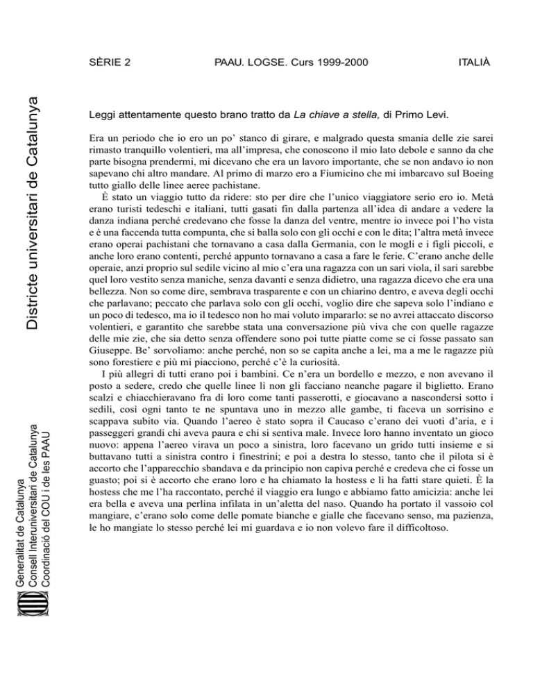 Generalitat de Catalunya Consell Interuniversitari de Catalunya Coordinació del COU i de les PAAU Districte universitari de Catalunya SÈRIE 2 PAAU. LOGSE. Curs 1999-2000 ITALIÀ Leggi attentamente questo brano tratto da La chiave a stella, di Primo Levi. Era un periodo che io ero un po’ stanco di girare, e malgrado questa smania delle zie sarei rimasto tranquillo volentieri, ma all’impresa, che conoscono il mio lato debole e sanno da che parte bisogna prendermi, mi dicevano che era un lavoro importante, che se non andavo io non sapevano chi altro mandare. Al primo di marzo ero a Fiumicino che mi imbarcavo sul Boeing tutto giallo delle linee aeree pachistane. È stato un viaggio tutto da ridere: sto per dire che l’unico viaggiatore serio ero io. Metà erano turisti tedeschi e italiani, tutti gasati fin dalla partenza all’idea di andare a vedere la danza indiana perché credevano che fosse la danza del ventre, mentre io invece poi l’ho vista e è una faccenda tutta compunta, che si balla solo con gli occhi e con le dita; l’altra metà invece erano operai pachistani che tornavano a casa dalla Germania, con le mogli e i figli piccoli, e anche loro erano contenti, perché appunto tornavano a casa a fare le ferie. C’erano anche delle operaie, anzi proprio sul sedile vicino al mio c’era una ragazza con un sari viola, il sari sarebbe quel loro vestito senza maniche, senza davanti e senza didietro, una ragazza dicevo che era una bellezza. Non so come dire, sembrava trasparente e con un chiarino dentro, e aveva degli occhi che parlavano; peccato che parlava solo con gli occhi, voglio dire che sapeva solo l’indiano e un poco di tedesco, ma io il tedesco non ho mai voluto impararlo: se no avrei attaccato discorso volentieri, e garantito che sarebbe stata una conversazione più viva che con quelle ragazze delle mie zie, che sia detto senza offendere sono poi tutte piatte come se ci fosse passato san Giuseppe. Be’ sorvoliamo: anche perché, non so se capita anche a lei, ma a me le ragazze più sono forestiere e più mi piacciono, perché c’è la curiosità. I più allegri di tutti erano poi i bambini. Ce n’era un bordello e mezzo, e non avevano il posto a sedere, credo che quelle linee lì non gli facciano neanche pagare il biglietto. Erano scalzi e chiacchieravano fra di loro come tanti passerotti, e giocavano a nascondersi sotto i sedili, così ogni tanto te ne spuntava uno in mezzo alle gambe, ti faceva un sorrisino e scappava subito via. Quando l’aereo è stato sopra il Caucaso c’erano dei vuoti d’aria, e i passeggeri grandi chi aveva paura e chi si sentiva male. Invece loro hanno inventato un gioco nuovo: appena l’aereo virava un poco a sinistra, loro facevano un grido tutti insieme e si buttavano tutti a sinistra contro i finestrini; e poi a destra lo stesso, tanto che il pilota si è accorto che l’apparecchio sbandava e da principio non capiva perché e credeva che ci fosse un guasto; poi si è accorto che erano loro e ha chiamato la hostess e li ha fatti stare quieti. È la hostess che me l’ha raccontato, perché il viaggio era lungo e abbiamo fatto amicizia: anche lei era bella e aveva una perlina infilata in un’aletta del naso. Quando ha portato il vassoio col mangiare, c’erano solo come delle pomate bianche e gialle che facevano senso, ma pazienza, le ho mangiate lo stesso perché lei mi guardava e io non volevo fare il difficoltoso. SEZIONE PRIMA: COMPRENSIONE SCRITTA [6 punti] Rispondi alle seguenti domande con un minimo di 25 parole: a) Perché i compagni di viaggio del narratore sono tutti allegri? b) Perché il narratore non può conversare con la sua vicina di sedile? c) Com’erano i bambini dei passeggeri? d) Cosa facevano i bambini quando c’erano i vuoti d’aria? e) Cosa fa il pilota quando si accorge che l’aereo sbanda? f) Cosa fa il narratore per riguardo alla hostess? SEZIONE SECONDA: ESPRESSIONE SCRITTA [4 punti] Scrivi una redazione di almeno 150 parole su uno dei due temi qui proposti: 1. Descrivi un viaggio in treno, in aereo o in nave che ricordi particolarmente per i passeggeri con cui ti è toccato trascorrere il tempo che è durato il tragitto. 2. Scrivi una lettera in cui il protagonista della narrazione si lamenta con la compagnia aerea per il servizio. Generalitat de Catalunya Consell Interuniversitari de Catalunya Coordinació del COU i de les PAAU Districte universitari de Catalunya SÈRIE 6 PAAU. LOGSE. Curs 1999-2000 ITALIÀ Leggi attentamente questo articolo tratto dalla rivista l’Espresso. “Questo è vino dell’altro mondo”, di Gideon Rachman. Fare vino è un mestiere molto semplice, ama ripetere la baronessa Philippine de Rothschild ai visitatori del suo castello nei pressi di Bordeaux:1 “Solo nei primi 200 anni s’incontra qualche difficoltà”. Certo, le parole della baronessa mostrano più grandeur2 che candore. Ma quello che conta è che tanto gli enologi quanto i consumatori sono sempre più convinti che non occorra una lunga tradizione per ottenere del buon vino. La Nuova Zelanda ha cominciato a produrre vino solo negli anni ‘70. Ma secondo Oz Clarke, famoso esperto inglese, il sauvignon* bianco di questo paese è oggi “probabilmente il migliore del mondo”. E a detta di Robert Parker, il più autorevole enologo internazionale, che pure ama molto i Bordeaux,* il Grange,* il più famoso vino australiano (prodotto a partire dagli anni ‘50), “ha preso il posto del Pétrus* bordolese come vino più esotico e intenso del mondo”. L’idea che i migliori vini d’Oltre Atlantico, il cosiddetto Nuovo Mondo, possano eguagliare se non superare quelli più pregiati del Vecchio Continente è stata affacciata per la prima volta nel 1976, in occasione di un evento che è passato alla storia come “il giudizio di Parigi”. Steven Spurrier, un commerciante inglese di vini con sede nella capitale francese, riunì 15 dei più autorevoli esperti francesi per assaggiare alla cieca i migliori vini di Franc