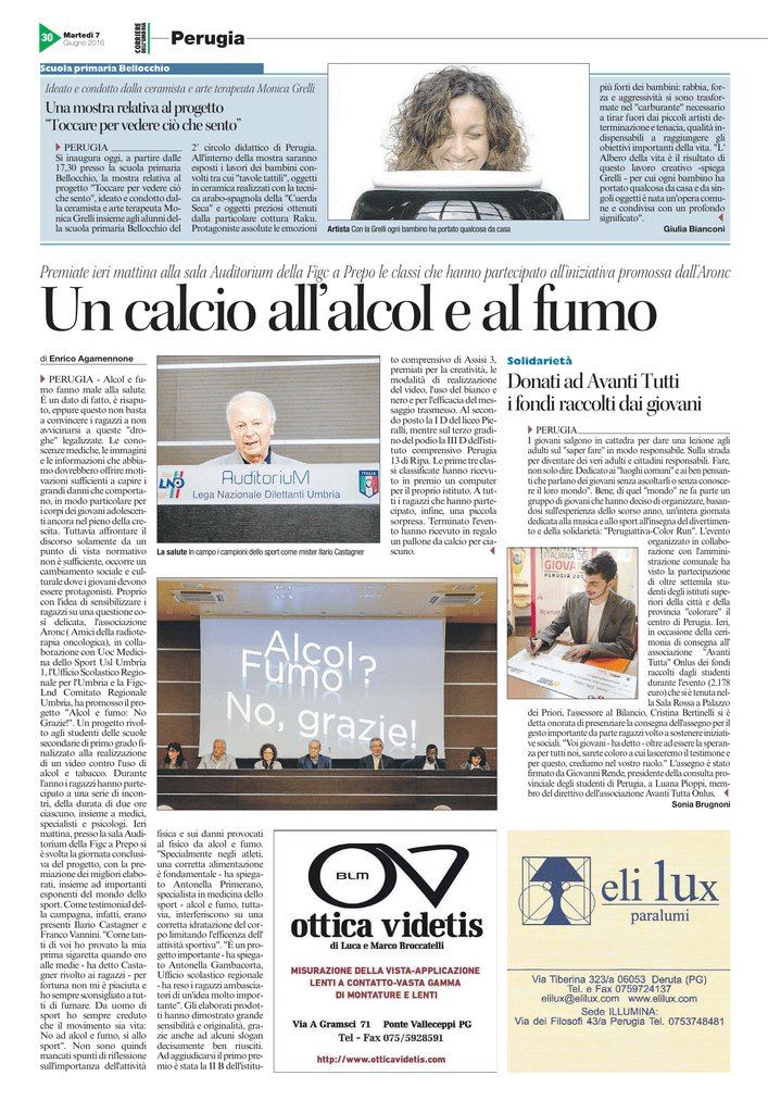 Martedì 7 Giugno 2016 DELL’UMBRIA 30 CORRIERE u Perugia Scuola primaria Bellocchio Ideato e condotto dalla ceramista e arte terapeuta Monica Grelli più forti dei bambini: rabbia, forza e aggressività si sono trasformate nel "carburante" necessario a tirar fuori dai piccoli artisti determinazione e tenacia, qualità indispensabili a raggiungere gli obiettivi importanti della vita. "L' Albero della vita è il risultato di questo lavoro creativo -spiega Grelli - per cui ogni bambino ha portato qualcosa da casa e da singoli oggetti è nata un'opera comune e condivisa con un profondo significato". B Una mostra relativa al progetto “Toccare per vedere ciò che sento” A PERUGIA Si inaugura oggi, a partire dalle 17,30 presso la scuola primaria Bellocchio, la mostra relativa al progetto "Toccare per vedere ciò che sento", ideato e condotto dalla ceramista e arte terapeuta Monica Grelli insieme agli alunni della scuola primaria Bellocchio del 2˚ circolo didattico di Perugia. All'interno della mostra saranno esposti i lavori dei bambini convolti tra cui "tavole tattili", oggetti in ceramica realizzati con la tecnica arabo-spagnola della "Cuerda Seca" e oggetti preziosi ottenuti dalla particolare cottura Raku. Protagoniste assolute le emozioni Artista Con la Grelli ogni bambino ha portato qualcosa da casa Giulia Bianconi Premiate ieri mattina alla sala Auditorium della Figc a Prepo le classi che hanno partecipato all’iniziativa promossa dall’Aronc Un calcio all’alcol e al fumo di Enrico Agamennone A PERUGIA - Alcol e fumo fanno male alla salute. È un dato di fatto, è risaputo, eppure questo non basta a convincere i ragazzi a non avvicinarsi a queste "droghe" legalizzate. Le conoscenze mediche, le immagini e le informazioni che abbiamo dovrebbero offrire motivazioni sufficienti a capire i grandi danni che comportano, in modo particolare per i corpi dei giovani adolescenti ancora nel pieno della crescita. Tuttavia affrontare il discorso solamente da un punto di vista normativo non è sufficiente, occorre un cambiamento sociale e culturale dove i giovani devono essere protagonisti. Proprio con l'idea di sensibilizzare i ragazzi su una questione così delicata, l'associazione Aronc ( Amici della radioterapia oncologica), in collaborazione con Uoc Medicina dello Sport Usl Umbria 1, l'Ufficio Scolastico Regionale per l'Umbria e la FigcLnd Comitato Regionale Umbria, ha promosso il progetto "Alcol e fumo: No Grazie!". Un progetto rivolto agli studenti delle scuole secondarie di primo grado finalizzato alla realizzazione di un video contro l'uso di alcol e tabacco. Durante l'anno i ragazzi hanno partecipato a una serie di incontri, della durata di due ore ciascuno, insieme a medici, specialisti e psicologi. Ieri mattina, presso la sala Auditorium della Figc a Prepo si è svolta la giornata conclusiva del progetto, con la premiazione dei migliori elaborati, insieme ad importanti esponenti del mondo dello sport. Come testimonial della campagna, infatti, erano presenti Ilario Castagner e Franco Vannini. "Come tanti di voi ho provato la mia prima sigaretta quando ero alle medie - ha detto Castagner rivolto ai ragazzi - per fortuna non mi è piaciuta e ho sempre sconsigliato a tutti di fumare. Da uomo di sport ho sempre creduto che il movimento sia vita: No ad alcol e fumo, sì allo sport". Non sono quindi mancati spunti di riflessione sull'importanza dell'attività La salute In campo i campioni dello sport come mister Ilario Castagner to comprensivo di Assisi 3, premiati per la creatività, le modalità di realizzazione del video, l'uso del bianco e nero e per l'efficacia del messaggio trasmesso. Al secondo posto la I D del liceo Pieralli, mentre sul terzo gradino del podio la III D dell'istituto comprensivo Perugia 13 di Ripa. Le prime tre classi classificate hanno ricevuto in premio un computer per il proprio istituto. A tutti i ragazzi che hanno partecipato, infine, una piccola sorpresa. Terminato l'evento hanno ricevuto in regalo un pallone da calcio per ciascuno. B Solidarietà Donati ad Avanti Tutti i fondi raccolti dai giovani A PERUGIA I giovani salgono in cattedra per dare una lezione agli adulti sul "saper fare" in modo responsabile. Sulla strada per diventare dei veri adulti e cittadini responsabili. Fare, non solo dire. Dedicato ai "luoghi comuni" e ai ben pensanti che parlano dei giovani senza ascoltarli o senza conoscere il loro mondo". Bene, di quel "mondo" ne fa parte un gruppo di giovani che hanno deciso di organizzare, basandosi sull'esperienza dello scorso anno, un'intera giornata dedicata alla musica e allo sport all'insegna del divertimento e della solidarietà: "Perugiattiva-Color Run". L'evento organizzato in collaborazione con l'amministrazione comunale ha visto la partecipazione di oltre settemila studenti degli istituti superiori della città e della provincia "colorare" il centro di Perugia. Ieri, in occasione della cerimonia di consegna all' associazione "Avanti Tutta" Onlus dei fondi raccolti dagli studenti durante l'evento (2.178 euro) che si è tenuta nella Sala Rossa a Palazzo dei Priori, l'assessore al Bilancio, Cristina Bertinelli si è detta onorata di presenziare la consegna dell'assegno per il gesto importante da parte ragazzi volto a sostenere iniziative sociali. "Voi giovani - ha detto - oltre ad essere la speranza per tutti noi, sarete coloro a cui lasceremo il testimone e per questo, crediamo nel vostro ruolo." L'assegno è stato firmato da Giovanni Rende, presidente della consulta provinciale degli studenti di Perugia, a Luana Pioppi, membro del direttivo dell'associazione Avanti Tutta Onlus. B Sonia Brugnoni fisica e sui danni provocati al fisico da alcol e fumo. "Specialmente negli atleti, una corretta alimentazione è fondamentale - ha spiegato Antonella Primerano, specialista in medicina dello sport - alcol e fumo, tuttavia, interferiscono su una corretta idratazione del corpo limitando l'efficenza dell' attività sportiva". "È un progetto importa