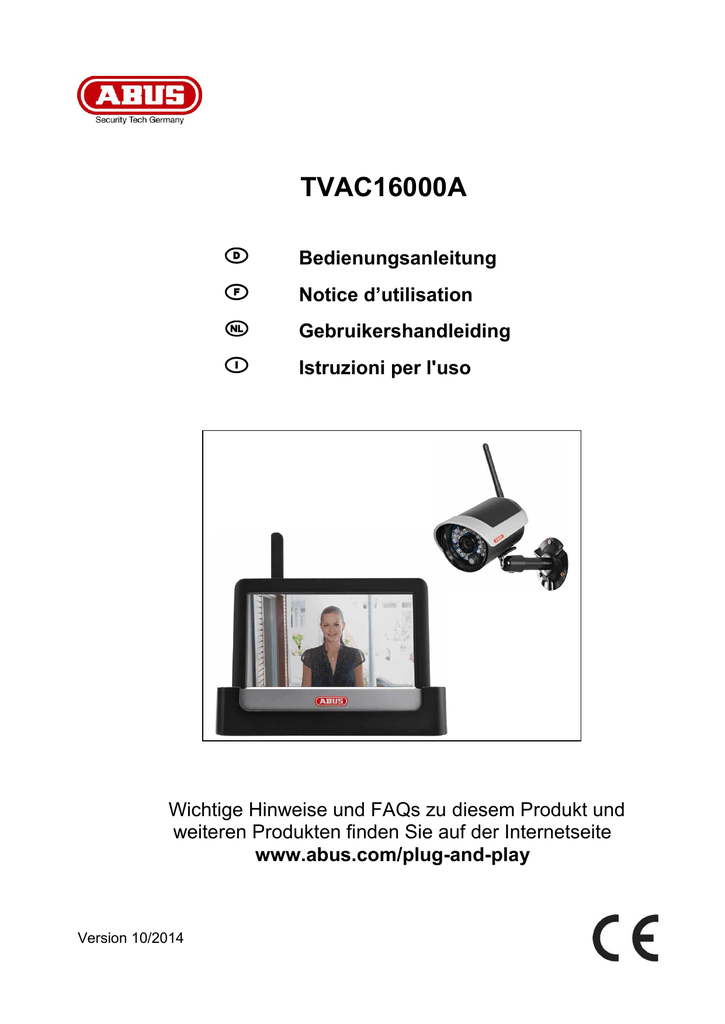 TVAC16000A D F Bedienungsanleitung Notice d’utilisation Gebruikershandleiding I Istruzioni per l'uso Wichtige Hinweise und FAQs zu diesem Produkt und weiteren Produkten finden Sie auf der Internetseite www.abus.com/plug-and-play Version 10/2014 Diese Bedienungsanleitung enthält wichtige Hinweise zur Inbetriebnahme und Handhabung. Achten Sie hierauf, auch wenn Sie dieses Produkt an Dritte weitergeben. Heben Sie deshalb diese Bedienungsanleitung zum Nachlesen auf! Eine Auflistung der Inhalte finden Sie im Inhaltsverzeichnis mit Angabe der entsprechenden Seitenzahlen auf Seite 5. Les recommandations contenues dans cette notice d'utilisation sont importantes pour la mise en service et l'utilisation du produit. Nous vous prions de bien vouloir les respecter. Si vous étiez amené à revendre le produit, nous vous prions de bien vouloir transmettre cette notice au nouvel acquéreur. Nous vous recommandons également de conserver cette notice d'utilisation afin de pouvoir la consulter à tout moment. Le sommaire disponible en page 38 fournit un aperçu du contenu avec le n° des pages correspondantes. Deze gebruikershandleiding bevat belangrijke opmerkingen over de ingebruikneming en bediening. Houd hier rekening mee, ook als u dit product aan derden doorgeeft. Bewaar daarom de gebruikershandleiding om deze na te kunnen lezen! U vindt een opsomming van de inhoud in de inhoudsopgave met vermelding van de betreffende paginanummers op pagina 71. Le presenti istruzioni per l'uso contengono note importanti sulla messa in funzione e sull’utilizzo. Vanno osservate anche in caso di cessione del prodotto a terzi. La preghiamo pertanto di conservare le presenti istruzioni per l'uso in vista di una consultazione futura. Un elenco dei contenuti con l'indicazione delle pagine corrispondenti è riportato nell'indice a pagina 104. 2 Deutsch Français Nederlands Italiano TVAC16000A Bedienungsanleitung Version 10/2014 Originalbedienungsanleitung in deutscher Sprache. Für künftige Verwendung aufbewahren! Deutsch Einführung Sehr geehrte Kundin, sehr geehrter Kunde, wir bedanken uns für den Kauf dieses Produkts. Dieses Gerät erfüllt die Anforderungen gültiger EU-Richtlinien. Die Konformitätserklärung ist zu beziehen unter: ABUS Security-Center GmbH & Co. KG Linker Kreuthweg 5 86444 Affing GERMANY Um diesen Zustand zu erhalten und einen gefahrenlosen Betrieb sicherzustellen, müssen Sie als Anwender diese Bedienungsanleitung beachten! Lesen Sie sich vor Inbetriebnahme des Produkts die komplette Bedienungsanleitung durch, beachten Sie alle Bedienungs- und Sicherheitshinweise! Alle enthaltenen Firmennamen und Produktbezeichnungen sind Warenzeichen der jeweiligen Inhaber. Alle Rechte vorbehalten. Bei Fragen wenden Sie sich an ihren Facherrichter oder Fachhandelspartner! Die Datenspeicherung unterliegt länderspezifischen Datenschutzrichtlinien. Warnhinweis im Sinne des § 201 StGB: Wer unbefugt das nichtöffentlich gesprochene Wort eines anderen auf einen Tonträger aufnimmt oder eine so hergestellte Aufnahme gebraucht oder einem Dritten zugänglich macht kann mit Freiheitsstrafe oder Geldstrafe bestraft werden! Ebenso kann bestraft werden, wer unbefugt das nicht zu seiner Kenntnis bestimmte nichtöffentlich gesprochene Wort eines anderen mit einem Abhörgerät abhört oder das nach aufgenommene oder abgehörte nichtöffentlich gesprochene Wort eines anderen im Wortlaut oder seinem wesentlichen Inhalt nach öffentlich mitteilt. Haftungsausschluss Diese Bedienungsanleitung wurde mit größter Sorgfalt erstellt. Sollten Ihnen dennoch Auslassungen oder Ungenauigkeiten auffallen, so teilen Sie uns diese bitte schriftlich unter der auf der Rückseite des Handbuchs angegebener Adresse mit. Die ABUS Security-Center GmbH übernimmt keinerlei Haftung für technische und typographische Fehler und behält sich das Recht vor, jederzeit ohne vorherige Ankündigung Änderungen am Produkt und an den Bedienungsanleitungen vorzunehmen. ABUS Security-Center ist nicht für direkte und indirekte Folgeschäden haftbar oder verantwortlich, die in Verbindung mit der Ausstattung, der Leistung und dem Einsatz dieses Produkts entstehen. Es wird keinerlei Garantie für den Inhalt dieses Dokuments übernommen. 2 Deutsch Symbolerklärung Das Symbol mit dem Blitz im Dreieck wird verwendet, wenn Gefahr für die Gesundheit besteht, z.B. durch elektrischen Schlag. Ein im Dreieck befindliches Ausrufezeichen weist auf wichtige Hinweise in dieser Bedienungsanleitung hin, die unbedingt zu beachten sind. Dieses Symbol ist zu finden, wenn Ihnen besondere Tipps und Hinweise zur Bedienung gegeben werden sollen. Wichtige Sicherheitshinweise Bei Schäden die durch Nichtbeachten dieser Bedienungsanleitung verursacht werden, erlischt der Garantieanspruch. Für Folgeschäden übernehmen wir keine Haftung! Bei Sach- oder Personenschäden, die durch unsachgemäße Handhabung oder Nichtbeachten der Sicherheitshinweise verursacht werden, übernehmen wir keine Haftung. In solchen Fällen erlischt jeder Garantieanspruch! Dieses Gerät wurde unter Einhaltung internationaler Sicherheitsstandards gefertigt. Bitte lesen Sie die folgenden Sicherheitshinweise aufmerksam durch. Sicherheitshinweise 1. Stromversorgung 100-240 VAC Wechselspannung, 50 – 60 Hz (über Steckernetzteil an 5 VDC) Betreiben Sie dieses Gerät nur an einer Stromquelle, welche die auf dem Typenschild angegebene Netzspannung liefert. Falls Sie nicht sicher sind, welche Stromversorgung bei Ihnen vorliegt, wenden Sie sich an Ihr Energieversorgungsunternehmen. Trennen Sie das Gerät von der Netzstromversorgung, bevor Sie Wartungs- oder Installationsarbeiten durchführen. 2. Überlastung Vermeiden Sie die Überlastung von Netzsteckdosen, Verlängerungskabeln und Adaptern, da dies zu einem Brand oder einem Stromschlag führen kann. 3. Flüssigkeiten Schützen Sie das Gerät vor dem Eindringen von Flüssigkeiten aller Art. 4. Reinigung Reinigen Sie das Gerät nur mit einem feuchten Tuch ohne scha