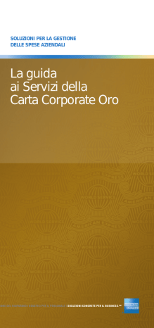 SOLUZIONI PER LA GESTIONE DELLE SPESE AZIENDALI La guida ai Servizi della Carta Corporate Oro IONE DEL RISPARMIO I BENEFICI PER IL PERSONALE I SOLUZIONI CONCRETE PER IL BUSINESS.SM Indice Come funziona la Carta Corporate Oro 1 Privilegi e servizi della Carta Corporate Oro 2 I servizi opzionali della Carta Corporate Oro 4 Assicurazioni e Assistenza automatiche 5 Estratto delle polizze assicurative 7 25 American Express Numeri di telefono utili Lista dei Taxi CITTÀ Bologna Firenze Milano Milano- aeroporto Napoli Palermo Roma Roma - Aeroporto Torino TELEFONO 051-702727 051-519090 051-372727 055-4242 02-8585 800-911333 081-5606666 081-5707070 091-682544 091-225455 06-3570 06-5551 06-4984/94 800-017387 06.55282892 011-3399 011-5730 NOME Linea Blu Cosepuri NCC Co.Ta.Bo. So.Co.Ta. Autoradiotaxi Taxi Malpensa Radio Taxi Partenope Radio Taxi Co.Ta.Na. Taxi Trinacria Taxi Trinacria Coop. Radio Taxi Coop. Samarcanda Co. Radio Taxi La Capitale Co. Airport Fiumicino Samarcanda preferenziale dall’aeroporto Coop. Centrale Taxi Coop. Radio Taxi N.B. Quando telefonate richiedete un taxi abilitato ad accettare la Carta American Express American Express Servizio Clienti • Servizio Clienti Carta Corporate Carte smarrite, rubate o danneggiate (24 ore su 24) • Informazioni sull’estratto conto-cambio di indirizzo (24 ore su 24) • Club Membership Rewards (lun.-ven., 9.00-17.00) • ACE Insurance S.A.-N.V. • Servizio Global Assist (24 ore su 24) • Crawford & Company Italia Srì 06-72900347 06-72280980 06-72900769 02-27095552 06-42115569 02-48100423 Parcheggi che accettano la Carta Corporate in Italia: Presso gli aeroporti di: • ROMA Fiumicino e Ciampino • MILANO Malpensa e Linate • BOLOGNA Marconi • VENEZIA Marco Polo • OLBIA Costa Smeralda • TORINO Caselle ✂ ROMA Italimpa – PARKSI – Villa Borghese Benvenuto! Abbiamo il piacere di accoglierla tra i Titolari di Carta Corporate Oro American Express. Potrà usufruire di numerose facilitazioni di pagamento che semplificheranno le sue spese di viaggio. Inoltre potrà contare, per ogni evenienza, sui numerosi servizi disponibili attraverso gli uffici viaggi American Express presenti in oltre 120 paesi del mondo. Porti sempre con lei questa guida, avrà la certezza di entrare nel modo più vantaggioso nel mondo dei privilegi American Express. Per maggiori informazioni sui vantaggi e i servizi della Carta Corporate Oro e per consultare online il suo conto Carta, la invitiamo a navigare sul nostro sito. www.americanexpress.it American Express Services Europe Limited Largo Caduti di El Alamein, 9 – 00173 Roma Telegrammi: AMEXCARD – Roma Tel. (06) 722801 – Telefax 7222300 ROLLO I INCENTIVAZIONE DEL RISPARMIO I BENEFICI PER IL PERSONALE I OTTIMIZZAZIONE DEL CONTROLLO I INCENTIVAZI CAM3852 Come funziona la Carta Corporate Oro? Le spieghiamo qui di seguito il ciclo di fatturazione delle spese effettuate con la Carta Corporate Oro. 1. Lei effettua l’acquisto (biglietto aereo o ferroviario, autonoleggio, hotel, ristorante o altro) con la Carta Corporate Oro American Express. 2. Alla data di chiusura mensile, riceverà l’estratto conto dettagliato delle spese effettuate con la Carta Corporate Oro. Questo le permetterà di riconciliare più facilmente la sua nota spese. 3. Potrà inoltrare la sua nota spese, completa dei giustificativi di spesa allegati, alla sua azienda per il rimborso. 4. Se ha una Carta con Pagamento Individuale, l’azienda le rimborserà le spese secondo le normali procedure aziendali e American Express addebiterà sul suo conto corrente bancario l’importo dell’estratto conto. Se ha una Carta con Pagamento Centralizzato, la sua Azienda pagherà direttamente ad American Express. 1 Privilegi e Servizi della Carta Corporate Oro Limiti di spesa In Italia o all’estero, American Express non le impone limiti di spesa prefissati. American Express autorizzerà le sue spese valutando, di volta in volta, l’ammontare delle spese precedenti e la sua puntualità nei pagamenti. Dove è possibile utilizzare la Carta Corporate Oro? Grazie alla Carta Corporate Oro American Express, potrà contare su una totale disponibilità finanziaria. Infatti, circa il 90% delle spese di viaggio e rappresentanza sono sostenibili con la Carta Corporate Oro. Potrà utilizzare la Carta per fare rifornimento di carburante presso le stazioni di servizio convenzionate Agip, Api, Esso, Erg, Fina, Ip, Q8 e Shell; pagare il pedaggio autostradale alle porte d’uscita Fast-pay o Viacard che espongono il logo American Express; acquistare biglietteria aerea e ferroviaria presso agenzie di viaggio o presso gli uffici viaggi American Express; saldare il conto presso la maggior parte degli alberghi di categoria dalle tre stelle in su; pagare gli spostamenti in taxi; avere accesso ai parcheggi presso i principali aeroporti italiani; usufruire degli innumerevoli ristoranti convenzionati con American Express. Smarrimento o furto della Carta In caso di smarrimento o furto della Carta, le assicuriamo la sua sostituzione – in 130 paesi del mondo – generalmente entro le 24 ore. Se non è in grado di recarsi presso una delle nostre agenzie, provvederemo noi a farle recapitare la Carta all’indirizzo che ci segnalerà. Il servizio Carte smarrite, rubate o danneggiate è a sua disposizione 24 ore su 24, 365 giorni all’anno, al numero 06-72900347. 2 I principali servizi presso gli uffici viaggi Oltre 1.700 uffici viaggi e Rappresentanti American Express* in 130 paesi del mondo per offrire i seguenti servizi: • Organizzazione viaggi • Sostituzione della Carta, generalmente entro le 24 ore • Check cashing: cambio di un assegno di conto corrente presso gli uffici viaggi American Express, su presentazione della Carta Corporate Oro • Acquisto o cambio di Traveler’s Cheques • Ufficio cambi presso quasi tutte le agenzie. *Inclusi gli uffici viaggi dell’American Express Travel Related Services Company Inc. e le sue affiliate ed i Rappresentanti. Il Ser