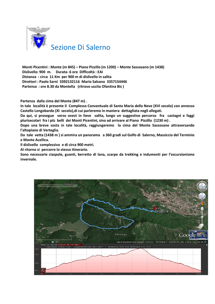 Sezione Di Salerno Monti Picentini : Monte (m 845) – Piano Pizzillo (m 1200) – Monte Sassosano (m 1438) Dislivello: 900 m. Durata- 6 ore Difficoltà : EAI Distanza : circa 11 Km per 900 m di dislivello in salita Direttori : Paolo Sarni 3392132116 Mario Salsano 3357154446 Partenza : ore 8.30 da Montella (ritrovo uscita Ofantina Bis ) Partenza dalla cima del Monte (847 m) . In tale località è presente il Complesso Conventuale di Santa Maria della Neve (XVI secolo) con annesso Castello Longobardo (XI secolo),di cui parleremo in maniera dettagliata negli allegati. Da qui, si prosegue verso ovest in lieve salita, lungo un suggestivo percorso fra castagni e faggi plurisecolari fra i più belli dei Monti Picentini, sino ad arrivare al Piano Pizzillo (1230 m) . Dopo una breve sosta in tale località, raggiungeremo la cima del Monte Sassosano attraversando l’altopiano di Verteglia. Da tale vetta (1438 m ) si ammira un panorama a 360 gradi sul Golfo di Salerno, Massiccio del Terminio e Monte Acellica. Il dislivello complessivo e di circa 900 metri. Al ritorno si percorre lo stesso itinerario. Sono necessarie ciaspole, guanti, berretto di lana, scarpe da trekking e indumenti per l’escursionismo invernale. Brevi Cenni Storici relativamente al Castello del Monte e Complesso Conventuale di Santa Maria della Neve. ---------------------------------------- Il castello del Monte L'abitato di Montella è sovrastato dai resti del castello longobardo. Fortilizio romano e poi castello longobardo, la struttura si erge su di un monte (da qui il nome "Castello del Monte") che domina la cittadina di Montella, la quale è situata nella valle ai piedi delle montagne. All'interno della cinta muraria gli scavi archeologici, diretti dal prof. Rotili, hanno rinvenuto anche una necropoli i cui arredi funerari sono oggi conservati nel Museo Irpino di Avellino. Visitare il castello del Monte Impossibile, in quanto l’accesso al pubblico non è consentito. Approfondimenti a cura del prof. Marcello Rotili: Storia e caratteristiche del castello del Monte. L'abitato di Montella è sovrastato dai resti del castello del Monte, eretto sulla cima dell'omonimo colle. Le ricerche archeologiche, condotte dal Dipartimento di Discipline Storiche dell'Università di Napoli Federico II dal 1985 al '92, sotto la direzione di chi scrive, hanno chiarito che si tratta di un complesso pluristratificato, con fasi d'impiego dal VI-VII secolo al XX, nelle quali s'identifica gran parte della storia del centro altoirpino. Ciò vale in particolare per il periodo fra VI -VII e XIII -XIV, allorché l'insediamento montellese si sviluppò essenzialmente entro l'area murata del «Monte», ove la popolazione aveva trovato riparo nei frangenti dell'occupazione longobarda del territorio meridionale. La fase di VI -VII, cui si riferiscono le case rinvenute nella rasola 1 e nell'ambiente P del palatium, si caratterizza per l'uso agricolo dell'area da parte di quanti avevano preferito l'insediamento accentrato su un'altura all'insicurezza del fondovalle. Attuata l'integrazione fra longobardi e romani, la funzione produttiva viene confermata nell'agosto 762 dal giudizio relativo al servi di Prata pronunciato da Arechi II a favore dell'abate di S. Sofia di Benevento, Maurizio «in curte n(os)tra que vocatur montella», ovvero «in nominata curte nostra montellari». Il giudicato costituisce la prima menzione dell'insediamento, che avrebbe assunto connotati di centro amministrativo e militare entro la metà del IX, in rapporto all'istituzione del gastaldato e alla posizione di confine fra i domini di Radelchi e Siconolfo in cui la località venne a trovarsi dopo l'849, a seguito della divisione dello stato beneventano nei principati di Benevento e Salerno. Il caso di Montella conferma il frequente passaggio dalla curtis al castello, da intendere nella circostanza come un centro fortificato in cui una situazione di urbanesimo di villaggio integra le strutture della residenza signorile e l'impianto militare del sito; del resto questo lascia intendere il documento del 1001, riguardante Orso, figlio di Guiselperto «de civitate montella». La fase di IX -XII secolo si caratterizza dunque per la recinzione dell'area strutturata lungo le pendici del Monte, per gli impianti sia difensivi che residenziali che inducono a riconoscere nel castello (più volte rinnovato) la sede del gastaldo testimoniato dal trattato di divisione fra Salerno e Benevento e, nella sottostante area murata (circa 3 ha), il villaggio fortificato sorto sulle strutture del precedente insediamento di VI-VIII. 1,0 scavo ha evidenziato i resti di abitazioni e la necropoli impiantata tra fine X e XI in una zona (caratterizzata già nel VI-VII dall'impiego sepolcrale), che viene abbandonata a seguito dei danni provocati dal terremoto del 25 ottobre 989. Le distruzioni testimoniate dai rinvenimento provocarono il restringimento dell'abitato alla parte alta del sito, le cui funzioni di centro della distrettuazione amministrativa del principato longobardo di Salerno in alta Irpinia, sul confine con il territorio beneventano, appaiono in declino alla fine del X secolo per l'intervenuta trasformazione del gastaldato in comitato che una cartula del 999 attesta nel menzionare Landolfo «de comitato Montellense». Nella Longobardia minore la formazione di una nuova signoria territoriale, quale il comitato, segna in quel periodo, in senso autonomistico, la sorte degli oltre quaranta gastaldati meridionali, il cui frazionamento contribuisce alla dispersione del potere statale nelle mani di un ceto nobiliare in parte nuovo, che trae dai patrimoni fondiari di recente acquisizione il sostegno economico e politico. La costituzione del comitato, nel rispondere ad un fenomeno di ordine generale, contribuì verosimilmente alla ripresa dell'insediamento montellese dopo il sisma del 989, per il dinamismo economico che è proprio delle nuove formazioni politico-sociali e per un riscontro che il nuovo ceto diri