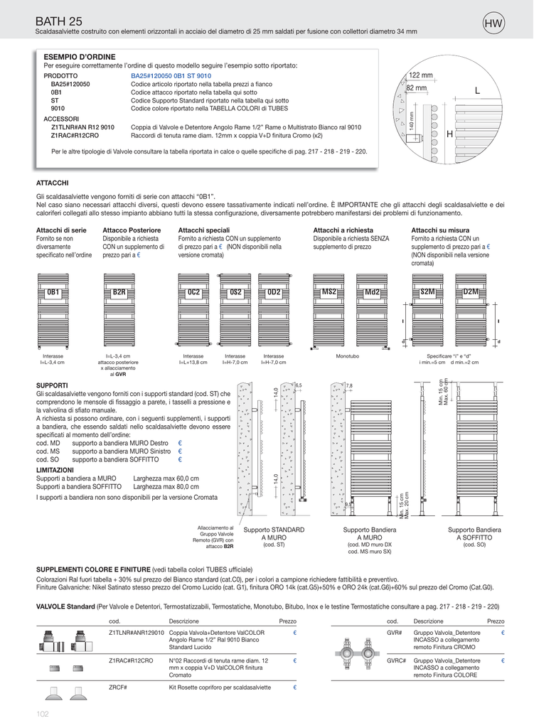 BATH 25 HW Scaldasalviette costruito con elementi orizzontali in acciaio del diametro di 25 mm saldati per fusione con collettori diametro 34 mm ESEMPIO D’ORDINE Per eseguire correttamente l’ordine di questo modello seguire l’esempio sotto riportato: 122 mm PRODOTTO BA25#120050 0B1 ST 9010 BA25#120050 0B1 ST 9010 Codice articolo riportato nella tabella prezzi a fianco Codice attacco riportato nella tabella qui sotto Codice Supporto Standard riportato nella tabella qui sotto Codice colore riportato nella TABELLA COLORI di TUBES ACCESSORI Z1TLNR#AN R12 9010 Z1RAC#R12CRO Coppia di Valvole e Detentore Angolo Rame 1/2” Rame o Multistrato Bianco ral 9010 Raccordi di tenuta rame diam. 12mm x coppia V+D finitura Cromo (x2) 82 mm 140 mm L H Per le altre tipologie di Valvole consultare la tabella riportata in calce o quelle specifiche di pag. 217 - 218 - 219 - 220. ATTACCHI Gli scaldasalviette vengono forniti di serie con attacchi “0B1”. Nel caso siano necessari attacchi diversi, questi devono essere tassativamente indicati nell’ordine. È IMPORTANTE che gli attacchi degli scaldasalviette e dei caloriferi collegati allo stesso impianto abbiano tutti la stessa configurazione, diversamente potrebbero manifestarsi dei problemi di funzionamento. Interasse I=L-3,4 cm Attacchi speciali Fornito a richiesta CON un supplemento di prezzo pari a € (NON disponibili nella versione cromata) 0C2 B2R I=L-3,4 cm attacco posteriore x allacciamento al GVR Interasse I=L+13,8 cm 0S2 MS2 0D2 Interasse I=H-7,0 cm Interasse I=H-7,0 cm S2M Md2 D2M i i d d Specificare “i” e “d” i min.=5 cm d min.=2 cm 7,8 14,0 Larghezza max 60,0 cm Larghezza max 80,0 cm I supporti a bandiera non sono disponibili per la versione Cromata 9,5 Allacciamento al Gruppo Valvole Remoto (GVR) con attacco B2R Attacchi su misura Fornito a richiesta CON un supplemento di prezzo pari a € (NON disponibili nella versione cromata) Monotubo 6,5 14,0 SUPPORTI Gli scaldasalviette vengono forniti con i supporti standard (cod. ST) che comprendono le mensole di fissaggio a parete, i tasselli a pressione e la valvolina di sfiato manuale. A richiesta si possono ordinare, con i seguenti supplementi, i supporti a bandiera, che essendo saldati nello scaldasalviette devono essere specificati al momento dell’ordine: cod. MD supporto a bandiera MURO Destro € cod. MS supporto a bandiera MURO Sinistro € cod. SO supporto a bandiera SOFFITTO € LIMITAZIONI Supporti a bandiera a MURO Supporti a bandiera SOFFITTO Attacchi a richiesta Disponibile a richiesta SENZA supplemento di prezzo Min. 15 cm Max. 60 cm 0B1 Attacco Posteriore Disponibile a richiesta CON un supplemento di prezzo pari a € Min. 15 cm Max. 20 cm Attacchi di serie Fornito se non diversamente specificato nell’ordine Supporto STANDARD A MURO (cod. ST) Supporto Bandiera A MURO Supporto Bandiera A SOFFITTO (cod. MD muro DX cod. MS muro SX) (cod. SO) SUPPLEMENTI COLORE E FINITURE (vedi tabella colori TUBES ufficiale) Colorazioni Ral fuori tabella + 30% sul prezzo del Bianco standard (cat.C0), per i colori a campione richiedere fattibilità e preventivo. Finiture Galvaniche: Nikel Satinato stesso prezzo del Cromo Lucido (cat. G1), finitura ORO 14k (cat.G5)+50% e ORO 24k (cat.G6)+60% sul prezzo del Cromo (Cat.G0). VALVOLE Standard (Per Valvole e Detentori, Termostatizzabili, Termostatiche, Monotubo, Bitubo, Inox e le testine Termostatiche consultare a pag. 217 - 218 - 219 - 220) cod. 102 cod. Descrizione Z1TLNR#ANR129010 Coppia Valvola+Detentore ValCOLOR Angolo Rame 1/2” Ral 9010 Bianco Standard Lucido Descrizione Prezzo € GVR# Gruppo Valvola_Detentore INCASSO a collegamento remoto Finitura CROMO Prezzo € Z1RAC#R12CRO N°02 Raccordi di tenuta rame diam. 12 mm x coppia V+D ValCOLOR finitura Cromato € GVRC# Gruppo Valvola_Detentore INCASSO a collegamento remoto Finitura COLORE € ZRCF# Kit Rosette copriforo per scaldasalviette € BATH 25 HW 70,5 119,5 144,5 193,5 Prezzo per calorifero in finitura Bianco ral 9010 e attacchi di serie - IVA e trasporto esclusi Codice BA25#070040 BA25#070050 BA25#070060 BA25#070070 BA25#070080 BA25#070090 BA25#070100 BA25#120040 BA25#120050 BA25#120060 BA25#120070 BA25#120080 BA25#120090 BA25#120100 BA25#150040 BA25#150050 BA25#150060 BA25#150070 BA25#150080 BA25#150090 BA25#150100 BA25#190040 BA25#190050 BA25#190060 BA25#190070 BA25#190080 BA25#190090 BA25#190100 H (cm) L (cm) 70,5 40,0 50,0 60,0 70,0 80,0 90,0 100,0 40,0 50,0 60,0 70,0 80,0 90,0 100,0 40,0 50,0 60,0 70,0 80,0 90,0 100,0 40,0 50,0 60,0 70,0 80,0 90,0 100,0 119,5 144,5 193,5 Interasse Contenuto (cm) acqua (lt.) 36,6 46,6 56,6 66,6 76,6 86,6 96,6 36,6 46,6 56,6 66,6 76,6 86,6 96,6 36,6 46,6 56,6 66,6 76,6 86,6 96,6 36,6 46,6 56,6 66,6 76,6 86,6 96,6 3,93 4,65 5,36 6,08 6,79 7,51 8,23 6,26 7,37 8,49 9,60 10,71 11,83 12,94 7,43 8,74 10,05 11,36 12,67 13,98 15,30 9,76 11,65 13,17 14,88 16,59 18,30 20,01 Versione Colorata Watt ∆T 50°C 352 441 529 617 705 793 881 536 670 803 937 1071 1205 1339 614 768 922 1075 1229 1382 1536 792 990 1188 1386 1584 1782 1980 Watt ∆T 30°C Categoria C0 Bianco std. (€) Categoria C1/C2 (€) Categoria C3 (€) 189 238 287 336 386 436 487 284 357 431 506 583 661 739 328 412 497 582 666 754 842 423 530 636 743 851 958 1066 Nella versione CROMATA (galvanica) il codice BA25 diventa BA25G Fattori di correzione diversi da ∆T50°C consultare pag. 230 103 BATH 25 DOPPIO HW Scaldasalviette costruito con elementi orizzontali in acciaio del diametro di 25 mm saldati per fusione con collettori diametro 34 mm ESEMPIO D’ORDINE Per eseguire correttamente l’ordine di questo modello seguire l’esempio sotto riportato: 143 mm PRODOTTO BA25D#120050 0B1 ST 9010 BA25D#120050 0B1 ST 9010 Codice articolo riportato nella tabella prezzi a fianco Codice attacco riportato nella tabella qui sotto Codice Supporto Standard riportato nella tabella qui sotto Codice colore riportato nella TABELLA COLORI di TUBES ACCESSORI Z1TLNR#AN R12 9010 Z1RAC#R12CRO Coppia di Valvole 