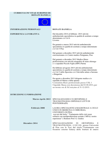 CURRICULUM VITAE EUROPEO DI DONATI DANIELA INFORMAZIONI PERSONALI DONATI DANIELA ESPERIENZA LAVORATIVA Dal dicembre 2014 al febbraio 2015 attività ambulatoriale specialistica in qualità di sostituto a tempo determinato c/o Usl 6 Livorno Da gennaio a marzo 2015 attività ambulatoriale specialistica in qualità di sostituto a tempo determinato c/o Usl 5 Pisa Dal gennaio a dicembre 2015 attività ambulatoriale convenzionata c/o Centro medico Putignano, Pisa Dal gennaio a dicembre 2015 Medico libero professionista con attività ortopedica di aiuto chirurgo c/ o ospedale Piccole Figlie (HPF) Parma Da febbraio ad agosto 2015 attività ambulatoriale specialistica in qualità di sostituto a tempo determinato c/o Usl 5 dello Spezzino c/o Città della salute a Sarzana e Bragarina Da agosto a dicembre 2015 dirigente medico c/o ospedale di Massa e delle apuane Contrattista libero professionale presso USL 1 Ospedale Massa con decorrenza dal 03-08-2015, per un monte ore di 36/sett,sino al 31-12-2015. ISTRUZIONE E FORMAZIONE Marzo-Aprile 2013 Febbraio 2008 Dicembre 2014 SPECIALIZZANDO C/O ORTOPEDIA E TRAUMATOLOGIA OSPEDALE LOTTI DI PONTEDERA(PI) LAUREA SPECIALISTICA/MAGISTRALE A CICLO UNICO IN MEDICINA E CHIRURGIA. UNIVERSITÀ DI PISA con tesi dal titolo “ Trattamento delle cisti ossee solitarie con metilprednisolone acetato ( MPA): nostra esperienza” ( Relatore Prof. G. Guido) SPECIALIZZAZIONE IN ORTOPEDIA E TRAUMATOLOGIA (110/110) presso Università di Pisa con la Tesi dal titolo:”Trattamento con fissatore esterno Galaxy delle fratture di omero prossimale nei pazienti anziani:studio preliminare”(Relatore Prof. G. Guido) ATTUALE POSIZIONE MEDICO SPECIALISTA TRAUMATOLOGIA IN ORTOPEDIA E ABILITAZIONE PROFESSIONALE ABILITAZIONE ALLA PROFESSIONE DI MEDICO CHIRURGO II/ 2008. ISCRITTA ALL’ORDINE DEI MEDICI DI PISA da Luglio 2008 CASISTICA OPERATORIA HA PARTECIPATO AD OLTRE 1000 INTERVENTI CHIRURGICI, DI CUI 150 ESEGUITI IN QUALITA’ DI PRIMO OPERATORE TITOLI VARI - AUTORE DI 1 PUBBLICAZIONE SU RIVISTE CON ISSN: Clin Interv Aging. 2012;7:575- 83Incidence and costs of hip fractures vs strokes and acute myocardial infarction in Italy: comparative analysis based on national hospitalization 1 records.(Piscitelli P , Iolascon G, Argentiero A, Chitano G, Neglia C, Marcucci G, Pulimeno M, Benvenuto M, Mundi S, Marzo V, Donati D, Baggiani A, Migliore A,Granata M, Gimigliano F, Di Blasio R, Gimigliano A, Renzulli L, Brandi ML, Distante A, Gimigliano R) - AUTORE DI 1 ABSTRACT PUBBLICATI SU RIVISTE CON ISSN -HA PARTECIPATO ALL’ATLS STUDENT COURSE nell’aprile 2008 in qualità di auditor -HA PARTECIPATO AL CORSO DI BLS-D febbraio2013 PROVA DI SPECIALIZZANDI, Giugno2014 ESAME NAZIONALE OSPEDALE C.T.O., 26 HA PARTECIPATO AL CORSO BLS novembre 2015 RELATORE A CONGRESSI Congresso: “ Il trattamento delle lesioni della cartilagine articolare del ginocchio” 19 Dicembre 2008 Congresso:”Tendinopatie: clinica, terapia e riabilitazione” Casciana Terme (PI) 9 ottobre 2010 PARTECIPAZIONE A CONGRESSI E CORSI Simposio “ La gestione del artroprotesi dall’intervento alla paziente con riabilitazione” Lucca 2004 Simposio” Nuovi orizzonti nel dell’artrite reumatoide” Lucca 2004 trattamento 1°Convegno Internazionale “ Grandi articolazioni:l’anca novità, sviluppi protesici e non” Sarzana ( SP) 6-7 giugno 2008 Corso “ Le fratture di omero” Viareggio ( LU) 21 marzo 2009 1° Convegno “ Memorial Mauro Baccelli” Pisa, 2 maggio 2009 ISBEM SUMMER SCHOOL di Medical Writing 2010 Mesagne (BR) 2-7Agosto 2010 Corso” il trattamento dell’osteoporosi severa in Toscana” Pisa 17 Settembre 2010 2° congresso di traumatologia Pediatrica Torino 28-29-30 gennaio 2010 41° Simposio “ Oscar Scaglietti” Pisa, 16,17,18 Settembre 2011 IV convegno Memorial Mauro Baccelli Pisa 28-29 settembre 2012 Corso “ la sindrome del tunnel carpale fra trattamento conservativo, chirurgico e riabilitativo” Viareggio (LU) 16 Maggio 2014. “Giornata Versiliese sulla fissazione Esterna” ospedale della Versila 27/11/2015 CAPACITÀ E COMPETENZE PERSONALI Competenze Linguistiche Conoscenze informatiche (Informatica di base) Data, 31/12/2015 Lingua : Inglese Scritto : Intermedio Comprensione : Intermedio Parlato : Intermedio Browser per navigazione in Internet:buona. Fogli elettronici:buona. Programmi per predisporre presentazioni:buona. Uso della posta elettronica : buona. Word-processor (elaborazione testi):buona. In Fede Dott.ssa Donati Daniela
