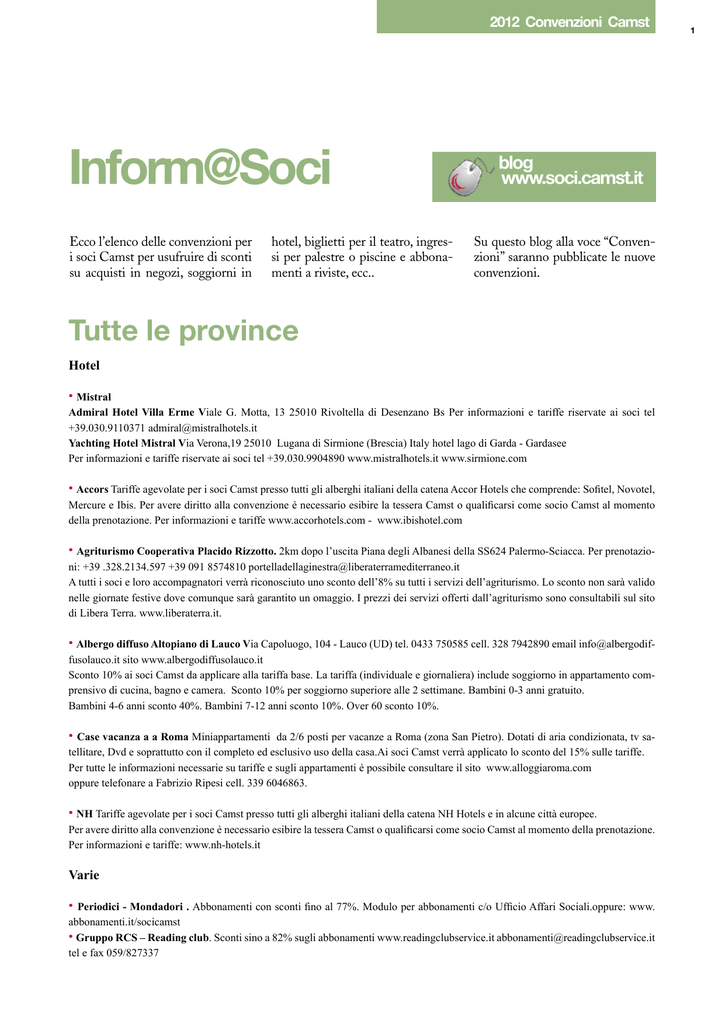 2012 Convenzioni Camst Inform@Soci Ecco l’elenco delle convenzioni per i soci Camst per usufruire di sconti su acquisti in negozi, soggiorni in hotel, biglietti per il teatro, ingressi per palestre o piscine e abbonamenti a riviste, ecc.. blog www.soci.camst.it Su questo blog alla voce “Convenzioni” saranno pubblicate le nuove convenzioni. Tutte le province Hotel • Mistral Admiral Hotel Villa Erme Viale G. Motta, 13 25010 Rivoltella di Desenzano Bs Per informazioni e tariffe riservate ai soci tel +39.030.9110371 [email protected] Yachting Hotel Mistral Via Verona,19 25010 Lugana di Sirmione (Brescia) Italy hotel lago di Garda - Gardasee Per informazioni e tariffe riservate ai soci tel +39.030.9904890 www.mistralhotels.it www.sirmione.com • Accors Tariffe agevolate per i soci Camst presso tutti gli alberghi italiani della catena Accor Hotels che comprende: Sofitel, Novotel, Mercure e Ibis. Per avere diritto alla convenzione è necessario esibire la tessera Camst o qualificarsi come socio Camst al momento della prenotazione. Per informazioni e tariffe www.accorhotels.com - www.ibishotel.com • Agriturismo Cooperativa Placido Rizzotto. 2km dopo l’uscita Piana degli Albanesi della SS624 Palermo-Sciacca. Per prenotazioni: +39 .328.2134.597 +39 091 8574810 [email protected] A tutti i soci e loro accompagnatori verrà riconosciuto uno sconto dell’8% su tutti i servizi dell’agriturismo. Lo sconto non sarà valido nelle giornate festive dove comunque sarà garantito un omaggio. I prezzi dei servizi offerti dall’agriturismo sono consultabili sul sito di Libera Terra. www.liberaterra.it. • Albergo diffuso Altopiano di Lauco Via Capoluogo, 104 - Lauco (UD) tel. 0433 750585 cell. 328 7942890 email [email protected] sito www.albergodiffusolauco.it Sconto 10% ai soci Camst da applicare alla tariffa base. La tariffa (individuale e giornaliera) include soggiorno in appartamento comprensivo di cucina, bagno e camera. Sconto 10% per soggiorno superiore alle 2 settimane. Bambini 0-3 anni gratuito. Bambini 4-6 anni sconto 40%. Bambini 7-12 anni sconto 10%. Over 60 sconto 10%. • Case vacanza a a Roma Miniappartamenti da 2/6 posti per vacanze a Roma (zona San Pietro). Dotati di aria condizionata, tv satellitare, Dvd e soprattutto con il completo ed esclusivo uso della casa.Ai soci Camst verrà applicato lo sconto del 15% sulle tariffe. Per tutte le informazioni necessarie su tariffe e sugli appartamenti è possibile consultare il sito www.alloggiaroma.com oppure telefonare a Fabrizio Ripesi cell. 339 6046863. • NH Tariffe agevolate per i soci Camst presso tutti gli alberghi italiani della catena NH Hotels e in alcune città europee. Per avere diritto alla convenzione è necessario esibire la tessera Camst o qualificarsi come socio Camst al momento della prenotazione. Per informazioni e tariffe: www.nh-hotels.it Varie • Periodici - Mondadori . Abbonamenti con sconti fino al 77%. Modulo per abbonamenti c/o Ufficio Affari Sociali.oppure: www. abbonamenti.it/socicamst • Gruppo RCS – Reading club. Sconti sino a 82% sugli abbonamenti www.readingclubservice.it [email protected] tel e fax 059/827337 1 2 2012 Convenzioni Camst • Assicurazioni - Unipol Agenzie Assicoop I soci Camst potranno usufruire della Convenzione Nazionale che Unipol applica ai Soci Lega Coop. Hanno diritto alle stesse condizioni agevolate anche i familiari conviventi.. www.ugfassicurazioni.it • Fondazione Arena di Verona Festival del centenario. Sarà possibile per il socio Camst e un accompagnatore l’acquisto del bilgietto a prezzo Ridotto per gli spettacoli del 91° Festival Lirico dell’Arena di Verona 14 giugno - 8 settembre 2013 e gli spettacoli programmati al Teatro Filarmonico. Potranno inoltre essere acquistati gli articoli di merchandising in vendita presso l’Anfiteatro Arena con uno sconto del 20% • Sport e tempo libero - Virgin club Villaggi Fitness. Per informazioni e tariffe consultare il sito www.virginactive.it Bologna Abbigliamento • Cinti calzature Via Marconi, 45 tel. 051 260834 - Via Indipendenza, 12 tel 051 232697 - Centro commerciale La Meridiana P.zza Etruschi, 2 Casalecchio di Reno (BO) tel 051 5875736. Sconto 10% per i soci. • Insolito s.n.c. di Minelli Giampiero e C.Via San Vitale 4D/E tel 051 4129824 - Piazza della Mercanzia 6/D tel 051 9914096 [email protected] - www.insolito.bo.it. Abbigliamento, bigiotteria, gioielli in argento, borse e calzature, mobili e oggetti di arredo. Sconto del 5% su tutti i prodotti. • La banda bassotti abbigliamento Via Tosarelli, 32/2 Castenaso (BO) tel. 051-788952 per informazioni Daniela Sabattini [email protected]. Abbigliamento per bambini da 0 a14 anni, sconto del 10% su qualsiasi acquisto, ad esclusione dei periodi di saldi. Articoli regalo/cartoleria • F.lli Biagini Cartoleria Via Oberdan, 9/e. Sconto del 20% su tutti gli articoli di cancelleria varia, sconto del 10% sulla regalistica. • Tabaccheria Leoncino C/o Centro Commerciale Centroborgo tel. 051 406951. Articoli da regalo marche prestigiose sconto del 10%. Auto/moto • Audi Zentrum Bologna Concessionaria Audi, Via dell’Industria, 36 tel. 051 5068820 - Via Agucchi, 121/4 tel. 051 6428311 - via Pola, 13 tel. 0542 628457. Sconti dal 9% al 12% a seconda del tipo di auto. • Autocommerciale Concessionaria Volkswagen Via Agucchi, 80/3-4-5 tel. 051 6428611 fax 051 6428655. Per qualsiasi necessità o chiarimenti vi preghiamo di rivolgervi a Massimo Mantovani al numero telefonico 051 6428636 oppure all’indirizzo e-mail: [email protected]. Sconti dal 10% al 12% a seconda dei tipi di auto. • Maresca e Fiorentino Concessionaria Fiat Via M.E. Lepido, 6 tel. 051 6419811 fax 051 404326 Sito www.marescafiorentino. com e-mail [email protected]. Sconto base 9%* su tutte le autovetture e ritiro dell’usato per soci Camst, I dipendenti del Gruppo e loro familiari. • Car Srl di Bologna Concessionaria Alfa Romeo-Lancia Viale Pietramellara,4 tel. 051 553.146, fax 051 521212 e-mail mailto. 