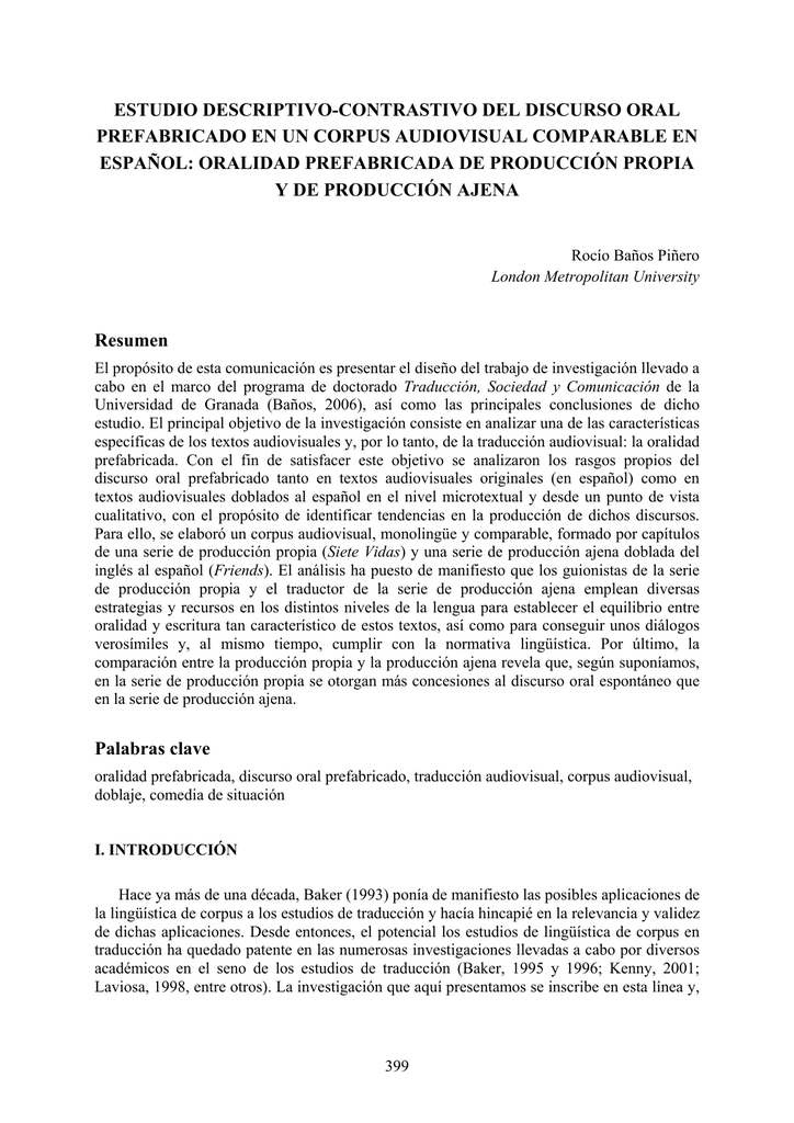 ESTUDIO DESCRIPTIVO-CONTRASTIVO DEL DISCURSO ORAL PREFABRICADO EN UN CORPUS AUDIOVISUAL COMPARABLE EN ESPAÑOL: ORALIDAD PREFABRICADA DE PRODUCCIÓN PROPIA Y DE PRODUCCIÓN AJENA Rocío Baños Piñero London Metropolitan University Resumen El propósito de esta comunicación es presentar el diseño del trabajo de investigación llevado a cabo en el marco del programa de doctorado Traducción, Sociedad y Comunicación de la Universidad de Granada (Baños, 2006), así como las principales conclusiones de dicho estudio. El principal objetivo de la investigación consiste en analizar una de las características específicas de los textos audiovisuales y, por lo tanto, de la traducción audiovisual: la oralidad prefabricada. Con el fin de satisfacer este objetivo se analizaron los rasgos propios del discurso oral prefabricado tanto en textos audiovisuales originales (en español) como en textos audiovisuales doblados al español en el nivel microtextual y desde un punto de vista cualitativo, con el propósito de identificar tendencias en la producción de dichos discursos. Para ello, se elaboró un corpus audiovisual, monolingüe y comparable, formado por capítulos de una serie de producción propia (Siete Vidas) y una serie de producción ajena doblada del inglés al español (Friends). El análisis ha puesto de manifiesto que los guionistas de la serie de producción propia y el traductor de la serie de producción ajena emplean diversas estrategias y recursos en los distintos niveles de la lengua para establecer el equilibrio entre oralidad y escritura tan característico de estos textos, así como para conseguir unos diálogos verosímiles y, al mismo tiempo, cumplir con la normativa lingüística. Por último, la comparación entre la producción propia y la producción ajena revela que, según suponíamos, en la serie de producción propia se otorgan más concesiones al discurso oral espontáneo que en la serie de producción ajena. Palabras clave oralidad prefabricada, discurso oral prefabricado, traducción audiovisual, corpus audiovisual, doblaje, comedia de situación I. INTRODUCCIÓN Hace ya más de una década, Baker (1993) ponía de manifiesto las posibles aplicaciones de la lingüística de corpus a los estudios de traducción y hacía hincapié en la relevancia y validez de dichas aplicaciones. Desde entonces, el potencial los estudios de lingüística de corpus en traducción ha quedado patente en las numerosas investigaciones llevadas a cabo por diversos académicos en el seno de los estudios de traducción (Baker, 1995 y 1996; Kenny, 2001; Laviosa, 1998, entre otros). La investigación que aquí presentamos se inscribe en esta línea y, 399 a nuestro entender, muestra las ventajas de la aplicación de la lingüística de corpus a la traducción audiovisual en particular. El propósito de esta comunicación es presentar el diseño y los principales resultados del trabajo de investigación llevado a cabo en el marco del programa de doctorado Traducción, Sociedad y Comunicación de la Universidad de Granada (Baños, 2006), que consiste en el análisis descriptivo y contrastivo de un corpus audiovisual, monolingüe y comparable. A diferencia de otras investigaciones basadas en el análisis de corpus comparables, nuestro objetivo no consiste en evaluar o criticar el producto traducido, sino en analizar los recursos con los que cuentan tanto los guionistas como los traductores a la hora de recrear la conversación oral espontánea en los diálogos de telecomedias producidas en español (en nuestro caso, Siete Vidas) y en telecomedias dobladas del inglés al español (Friends). En este sentido, adoptamos un enfoque descriptivo y sistémico, claramente orientado hacia el polo meta y centrado tanto en la traducción como en otras formas de producción textual (textos nativos), con el fin de detectar una serie de tendencias a partir de las estrategias observadas por lo que al empleo de marcas de oralidad respecta. Esto supone admitir que tanto la producción de textos audiovisuales nativos (producción propia) como la traducción de dichos textos en el sistema meta (producción ajena) están regidas por una serie de normas lingüístico-textuales y que éstas, a pesar de estar activas en el mismo sistema meta (el polisistema audiovisual español), no tienen por qué coincidir. El estudio de corpus que aquí presentamos nos permitirá identificar y contrastar dichas tendencias. Si bien nos centraremos en los aspectos metodológicos de la investigación y prestaremos especial atención a los criterios de selección del corpus audiovisual y a su composición, así como al modelo empleado para el análisis del discurso oral prefabricado, en primer lugar será preciso contextualizar la investigación y definir el concepto de oralidad prefabricada. II. LA ORALIDAD PREFABRICADA: UNA CARACTERÍSTICA ESPECÍFICA DE LOS TEXTOS AUDIOVISUALES El conjunto de textos audiovisuales al que puede acceder el espectador a diario se caracteriza por su diversidad. Estos textos pueden presentarse en distintos soportes (cinta de vídeo, CD-ROM, DVD, película de 35 mm, disco Blu-ray etc.) y proyectarse en distintos medios (pantalla de televisión, de cine, de ordenador, etc.). Asimismo, desde el punto de vista de la situación comunicativa, los textos audiovisuales pueden englobar todos los niveles del lenguaje e incluir todos los temas imaginables: desde una apasionante carrera de Fórmula 1, o los consejos para combatir el dolor de espalda, hasta los pormenores de la vida de un grupo de individuos encerrados en una casa durante meses para hacerse con un suculento premio. Nos enfrentamos, por tanto, a un conjunto heterogéneo de textos, capaces de adoptar diferentes formas, tratar innumerables temas, desempeñar numerosas funciones, y ser interpretados de maneras muy distintas por un abanico de espectadores igualmente amplio y variado. Ante tanta disparidad, cabe preguntarse qué es lo que une a los texto