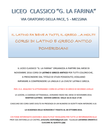 ILLICEOCLASSICO“G.LAFARINA”ORGANIZZAAPARTIREDALMESEDI NOVEMBRE2016CORSIDILATINOEGRECOANTICOPERTUTTICOLOROCHE, APRESCINDEREDALTITOLODISTUDIPOSSEDUTO,VOGLIANO IMPARAREACOMPRENDERELALINGUAELACIVILTA’LATINAEGRECA. PERL’A.S.2016/2017SIATTIVERANNOICORSIDILATINOEDIGRECODISECONDOLIVELLO LELEZIONI,ACADENZASETTIMANALE,AVRANNOINIZIONELMESEDINOVEMBRE2016. MARTEDì(LATINO)-GIOVEDì(GRECO)DALLE16:15ALLE17:45 CIASCUNODEICORSISARÀSVOLTOINPRESENZADIUNNUMERODIISCRITTINONINFERIOREA10. LASCADENZADELLEISCRIZIONIE’FISSATAAL28OTTOBRE2016. CHIFOSSEINTERESSATO(GIOVANIEADULTI)PUO’RIVOLGERSIPERTUTTELEINFORMAZIONIALLA PROF.SSAANTONELLALOCASTRO,[email protected] CLICCAREALQUESTOLINK CORSI DI LATINO E GRECO PER ADULTI LIVELLO INTERMEDIO Il LICEO CLASSICO G. LA FARINA di Messina istituisce i corsi pomeridiani di latino e greco per adulti. I corsi sono tenuti sulla base del metodo natura ideato da Hans Henning Ørberg ed introdotto in Italia dal Prof. Luigi Miraglia. I corsi partiranno nel mese di Novembre 2016 e le lezioni saranno tenute nella sede della scuola in via Oratorio della Pace, 5 a Messina Docenti dei corsi sono Antonella Lo Castro (Latino) e Lorenzo Sciajno (Greco), professori dello stesso Liceo. OBIETTIVI DEI CORSI I corsi offrono la possibilità di apprendere il latino ed il greco secondo un metodo che prevede un forte coinvolgimento attivo del discente, tramite la lettura, l’ascolto, gli esercizi di comprensione e produzione. I manuali utilizzati sono interamente scritti in latino e in greco, permettendo così di accedere direttamente alla lingua sin dai primissimi passi e facilitando l’apprendimento delle parole e dei costrutti attraverso l’elevata frequenza con cui si incontrano e si utilizzano. Imparare le lingue classiche diviene così un processo naturale e piacevole e le nozioni grammaticali indispensabili non rimangono formule astratte da imparare a memoria, ma sono parte di un processo di riflessione che serve ad organizzare quanto appreso prima induttivamente. Non sarà necessario decifrare brani decontestualizzati, compitandoli parola per parola, attraverso l’inevitabile ricorso al vocabolario, ma coltivare la lettura, l’ascolto e la comprensione. I risultati di queste tecniche, già in uso presso gli umanisti, sono garantite dalle moderne ricerche scientifiche nel campo dell’insegnamento delle lingue. I corsi previsti per l’anno scolastico 2016-2017 sono i seguenti: ▪ Latino II: dedicato a chi ha conoscenza anche minima pregressa della lingua latina o ha frequentato già il corso di Latino I Il corso si terrà il martedì dalle 16:15 alle 17:45 a partire dal mese di Novembre 2016 ▪ Greco antico II: dedicato a chi ha una anche minima conoscenza pregressa della lingua greca o ha frequentato il corso di Greco I. Il corso si terrà il giovedì dalle 16:15 alle 17:45 a partire dal mese di Novembre 2016 DESTINATARI DEI CORSI I corsi sono rivolti ad appassionati e curiosi, ad amanti del mondo antico e tutti coloro che, a prescindere dal titolo di studi posseduto, vogliono imparare il latino e il greco; quindi, non solo a chi studia lettere classiche, ma anche a chi si dedica alla storia medievale e moderna, alla storia letteraria europea, al diritto, alla filosofia, alla storia della scienza, alla teologia, alla liturgia. FREQUENZA I corsi prevedono 20 lezioni con cadenza settimanale di 1h 30’ ciascuna, per un totale di 30 ore. Alla fine del corso verrà rilasciato un attestato di frequenza. COSTI:L’iscrizione a ogni corso comporta il pagamento di € 80 (OTTANTAEURO) – sono esclusi i libri di testo - mediante bonifico intestato a I.I.S. "LA FARINA-BASILE" C/C BANCARIO: BANCA UNICREDIT - SEDE DI MESSINA ABI: 02008 CAB: 16511 NUMERO CONTO: 000102819513 CODICE IBAN: IT77W0200816511000102819513. Il corso è a numero chiuso (max. 15 studenti). ISCRIZIONE AI CORSI Gli interessati sono tenuti a compilare l’apposito modulo di iscrizione (da scaricare a questo link) e a consegnarlo alla segreteria del Liceo Classico G. La Farina (via Oratorio della pace, 5 Messina), corredato dall’attestazione dell’avvenuto pagamento previsto, oppure inviare il tutto a [email protected] Per tutte le informazioni relative rivolgersi alla prof.ssa Antonella Lo Castro, [email protected] TESTI: Lingua latina per se illustrata. Familia romana. Con espansione online Editore: Accademia Vivarium Novum 978-8895611464 Latine disco - Ørberg - Miraglia Editore accademia vivarium novum 978-8895611471 Athenaze - introduzione al greco antico - vol.1 Edizione accademia vivarium novum 978-88-95611-07-5 AlDIRIGENTESCOLASTICOI.I.S.“LAFARINA–BASILE” Il/laso9._____________________________________Nato/aa_________________il____________ Indirizzodipostaele9ronica_______________________ Recapitotelefonico__________________________ Chiede □ l'iscrizionealCorsopomeridianodi__________________________ Autorizza il tra9amento dei daI personali ai soli fini richiesI dall’iniziaIva e all’eventuale invio di comunicazionidapartedelLiceo. Allegaallapresentea9estazionedell’avvenutopagamentodellaquotarelaIvaa__corso/i. Messina, Firma