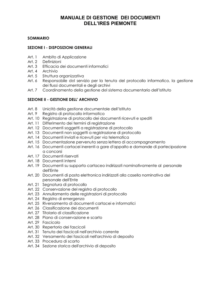 MANUALE DI GESTIONE DEI DOCUMENTI DELL’IRES PIEMONTE SOMMARIO SEZIONE I - DISPOSIZIONI GENERALI Art. 1 Art. 2 Art. 3 Art. 4 Art. 5 Art. 6 Art. 7 Ambito di Applicazione Definizioni Efficacia dei documenti informatici Archivio Struttura organizzativa Responsabile del servizio per la tenuta del protocollo informatico, la gestione dei flussi documentali e degli archivi Coordinamento della gestione del sistema documentario dell’Istituto SEZIONE II - GESTIONE DELL' ARCHIVIO Art. 8 Art. 9 Art. 10 Art. 11 Art. 12 Art. 13 Art. 14 Art. 15 Art. 16 Art. 17 Art. 18 Art. 19 Art. 20 Art. 21 Art. 22 Art. 23 Art. 24 Art. 25 Art. 26 Art. 27 Art. 28 Art. 29 Art. 30 Art. 31 Art. 32 Art. 33 Art. 34 Unicità della gestione documentale dell’Istituto Registro di protocollo informatico Registrazione di protocollo dei documenti ricevuti e spediti Differimento dei termini di registrazione Documenti soggetti a registrazione di protocollo Documenti non soggetti a registrazione di protocollo Documenti inviati e ricevuti per via telematica Documentazione pervenuta senza lettera di accompagnamento Documenti cartacei inerenti a gare d'appalto e domande di partecipazione a concorsi Documenti riservati Documenti interni Documenti su supporto cartaceo indirizzati nominativamente al personale dell'Ente Documenti di posta elettronica indirizzati alla casella nominativa del personale dell'Ente Segnatura di protocollo Conservazione del registro di protocollo Annullamento delle registrazioni di protocollo Registro di emergenza Riversamento di documenti cartacei e informatici Classificazione dei documenti Titolario di classificazione Piano di conservazione e scarto Fascicolo Repertorio dei fascicoli Tenuta dei fascicoli nell'archivio corrente Versamento dei fascicoli nell'archivio di deposito Procedura di scarto Sezione storica dell'archivio di deposito SEZIONE III - ACCESSO E CONSULTABILITÀ Art. 35 Accesso alla documentazione dell’Istituto SEZIONE IV - NORME TRANSITORIE E FINALI Art. 36 Norme transitorie e finali Art. 37 Entrata in vigore Art. 38 Sezione storica dell'archivio di deposito SEZIONE I DISPOSIZIONI GENERALI Art. 1. Ambito di applicazione 1. Il presente regolamento disciplina la formazione, la gestione, la conservazione e la fruizione dei documenti amministrativi dell’istituto, in conformità al disposto del decreto del Presidente della Repubblica 28 dicembre 2000, n. 445. (Testo unico delle disposizioni legislative e regolamentari in materia di documentazione amministrativa) e s.m.i, del decreto legislativo 7 marzo 2005, n. 82 (Codice dell'amministrazione digitale) e s.m.i. e del decreto legislativo 22 gennaio 2004, n. 42 (Codice dei beni cultuali e del paesaggio). Art. 2. Definizioni 1. Ai fini del presente regolamento si intende per: a) Documento amministrativo: ogni rappresentazione, comunque formata, del contenuto di atti, anche interni, dell’Istituto o, comunque, utilizzati ai fini dell'attività amministrativa; b) Documento interno: il documento il cui mittente e destinatario fanno riferimento alla stessa Direzione; c) Documento informatico: la rappresentazione informatica di atti, fatti o dati giuridicamente rilevanti; d) Documento riservato: il documento che contiene "dati sensibili" ai sensi del decreto legislativo 30 giugno 2003, n. 196 (Codice in materia di protezione dei dati personali) e s.m.i. ed i documenti dalla cui pubblicità possa derivare pregiudizio a terzi o al buon andamento dell'azione amministrativa. Art. 3. Efficacia dei documenti informatici 1. Documento informatico sottoscritto con firma elettronica. 1.1. il documento informatico, sottoscritto con firma elettronica, soddisfa il requisito legale della forma scritta. Sul piano probatorio il documento stesso è liberamente valutabile, tenuto conto delle sue caratteristiche oggettive di qualità e sicurezza. Esso, inoltre, soddisfa l'obbligo previsto dagli articoli 2214 e seguenti del codice civile e da ogni altra analoga disposizione legislativa o regolamentare. 2. Documento informatico sottoscritto con firma elettronica avanzata o con firma digitale. 2.1. Il documento informatico sottoscritto con firma digitale o con altra firma elettronica avanzata, basata su di un certificato qualificato e generata mediante un dispositivo per la creazione di una firma sicura, fa piena prova, fino a querela di falso da parte di chi l'ha sottoscritto, della provenienza delle dichiarazioni. 3. Istanze e dichiarazioni trasmesse per via telematica. 3.1. L'istanza e la dichiarazione trasmessa per via telematica sono valide se sottoscritte mediante firma digitale basata su di un certificato qualificato, rilasciato da un certificatore accreditato, e generata mediante un dispositivo per la creazione di una firma sicura ovvero quando l'autore è identificato dal sistema informatico con l'uso della carta d'identità elettronica o della carta nazionale dei servizi, o con strumenti diversi che comunque consentano di accertare l'identità del soggetto. 4. Documento trasmesso da una pubblica amministrazione tramite fax. 4.1. Il documento trasmesso da una pubblica amministrazione tramite fax soddisfa il requisito della forma scritta e la sua trasmissione non deve essere seguita da quella del documento originale. 5. Istanza e dichiarazione trasmessa da un privato tramite fax. 5.1. L'istanza e dichiarazione o altro documento trasmessi via fax da un privato soddisfano il requisito della forma scritta e la loro trasmissione non deve essere seguita da quella dell'originale se le modalità adottate sono idonee ad accertarne la fonte di provenienza. Art. 4. Archivio 1. L'archivio dell’Istituto è costituito dal complesso dei documenti prodotti e acquisiti nello svolgimento delle attività e nell'esercizio delle funzioni proprie dell’Istituto. 2. L'archivio e i singoli documenti che lo compongono sono beni inalienabili. 3. L'archivio è funzionalmente suddiviso in corrente, di deposito e storico. La documentazione viene tenuta in locali idonei, nel rispetto dell