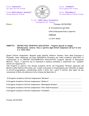 I.C.S. “BARSANTI” Via delle Torri 94, Firenze I.C.S. “GHIBERTI” Via di Legnaia,6/8 Firenze I.C.S.“MONTAGNOLA-GRAMSCI” Via del Sansovino, Firenze I.C.S. “PIRANDELLO” Via Santa Maria a Cintola, Firenze I. C.S. “PIERO DELLA FRANCESCA” Via Bugiardini 25 – Firenze Prot.n. Firenze, 02/10/2012 Al Provveditorato agli Studi Ufficio Educazione Fisica e Sportiva FIRENZE c.a. Dott. Guasti OGGETTO : CENTRO POLI-SPORTIVO SCOLASTICO - Progetto speciale di sviluppo dell’educazione motoria, fisica e sportiva degli Istituti Comprensivi del Q.4 in rete A.S. 2012-2013. Questi Istituti Comprensivi, Barsanti quale Capofila, Ghiberti, Gramsci, Piero della Francesca e Pirandello, hanno deliberato nel Piano dell’Offerta Formativa per l’anno scolastico 2012-2013, la realizzazione di un CENTRO POLISPORTIVO SCOLASTICO, progetto speciale di Educazione Motoria , Fisica e Sportiva che si realizzerà in maniera autonoma e consorziato con i suddetti istituti ed il Quartiere 4. Tale Progetto si inseriva, fino all’anno scolastico 01-02, nel Programma “Perseus” approvato dal Ministro della Pubblica Istruzione, per il quale ricevevamo un finanziamento per realizzare al meglio le attività programmate, considerando anche il fatto che i nostri 5 Istituti sono legati da una convenzione di Rete che abbraccia tutta l’utenza del Quartiere 4. Il Dirigente Scolastico Istituto Comprensivo “Barsanti” ………………………………………………….……………………… Il Dirigente Scolastico Istituto Comprensivo “Ghiberti”………………….…………………………………………………………. Il Dirigente Scolastico Istituto Comprensivo “Montagnola-Gramsci” ……………………………………………………… Il Dirigente Scolastico Istituto Comprensivo “Piero della Francesca”……………………………………………………… Il Dirigente Scolastico Istituto Comprensivo “Pirandello” …………………………………………………………………………. Firenze, 02/10/2012 CENTRO POLI-SPORTIVO SCOLASTICO”sport in rete” PROGETTO SPECIALE DI SVILUPPO DELL’EDUCAZIONE MOTORIA, FISICA E SPORTIVA DELLE SCUOLE MEDIE DEL Q.4 IN RETE XIII° edizione Anno scolastico 2012 – 2013 EX PROGRAMMA PERSEUS SOTTOPROGRAMMA DANAE CENTRO POLISPORTIVO SCOLASTICO”sport in rete” SCUOLE MEDIE Q.4 IN RETE Dopo l’esperienza positiva degli anni scolastici precedenti dal 2000-2001 al 2011-2012, anche per il corrente anno scolastico si vuol riproporre il Progetto Sportivo delle Scuole Medie Q.4 in Rete, fino all’anno precedente alla prima edizione era legato al programma “PERSEUS” che ci consentiva di accedere ai fondi del Ministero della Pubblica Istruzione indispensabili per lo svolgimento dell’attività. Premessa Questo progetto scaturisce dall’esigenza di definire il nuovo profilo dell’educazione motoria, fisica e sportiva, nello scenario della scuola dell’autonomia. L’iniziativa mira a consolidare la connessione e l'unità di strategie tra gli interventi di educazione motoria, fisica e sportiva nelle scuole del Quartiere 4, fornendo agli alunni un curricolo locale uniforme per tutti, in collegamento e integrazione con altre discipline, linguaggi e educazioni nella prospettiva di una continuità formativa. Ogni Istituto Comprensivo, in piena autonomia, cercherà di sviluppare dei curricoli per gli alunni delle scuole primarie di propria competenza, creando così, quella continuità del “piacere di fare attività sportiva” . L’intervento mira inoltre ad ottimizzare sia l’uso degli spazi delle scuole del Q.4, sia le competenze professionali, in funzione delle attività proposte. In sintesi: SE LA SCUOLA NON PUO’ PRESCINDERE DALLA LETTURA DEL TERRITORIO E DALLA RICHIESTA DELL’UTENZA FINALITA’ PERCORSI PER UNIFORMARE L’OFFERTA SPORTIVA SCOLASTICA DEL TERRITORIO Sperimentare una nuova organizzazione di scuole in rete per un PROGETTO SPORTIVO COMUNE approvato dagli O.O.C.C. ed inserito nei P.O.F. dei singoli Istituti ( in quanto operanti sullo stesso territorio), al fine di ottimizzare le risorse, migliorare l’Offerta Formativa e valorizzare le competenze individuali. PROGETTUALITA’ IN VERTICALE DALLE ELEMENTARI ALLE SUPERIORI OTTIMIZZAZIONE DELLE COMPETENZE PROFESSIONALI E DELLE RISORSE DEL Q.4 PROMOZIONE DI UNA CULTURA DELL’ACCOGLIENZA E DELLA COLLABORAZIONE RECIPROCA OTTIMIZZAZIONE DEGLI SPAZI A DISPOSIZIONE DELLE SCUOLE RECUPERO DEI VALORI SPORTIVI RESTITUZIONE DEL VALORE EDUCATIVO FORMATIVO SOCIALIZZANTE LOTTA AL TECNICISMO ESASPERATO E ALLE SELEZIONI PRECOCI STRUTTURA ORGANIZZATIVA USP Firenze ENTI COMPARTECIPANTI SCUOLA CAPOFILA QUARTIERE 4 ISTITUTO COMPRENSIVO “BARSANTI” (REFERENTE AMMINISTRATIVO) DIRIGENTE SCOLASTICO RESPONSABILE: Prof. Marco Menicatti SCUOLE COINVOLTE ISTITUTO COMPRENSIVO “BARSANTI” ISTITUTO COMPRENSIVO “ GHIBERTI” ISTITUTO COMPRENSIVO “MONTAGNOLA-GRAMSCI” ISTITUTO COMPRENSIVO “PIERO DELLA FRANCESCA” ISTITUTO COMPRENSIVO “PIRANDELLO” DOCENTI PRESENTATORI: prof. ABATE MARIA TERESA prof. BAGGIANI STEFANIA prof. BELLOCCI ENZO prof. FATTORINI PAOLO prof. GIANCOLA MICHELE prof. LINARI FRANCESCA prof. MINNITI ORESTE prof. ROSIELLO FRANCO PROGETTAZIONE E COORDINAMENTO: Prof. Linari Francesca DESTINATARI/E: Gli alunni iscritti per l’a.s. 2012-13 alle classi delle scuole secondarie di 1° grado degli Istituti Comprensivi aderenti al Progetto Considerazioni di carattere generale per l’attuazione del Progetto L’attuazione del progetto renderà necessario il lavoro di un insegnante di Sc.Motorie referente per ogni attività, il quale farà capo ad un Coordinatore del progetto. La notevole quantità di problematiche legata alla progettazione, all’organizzazione e al coordinamento delle numerose attività proposte, potranno prevedere un compenso forfettario per 30 ore, il cui onere è da ripartirsi equamente a carico dei cinque comprensivi. Per