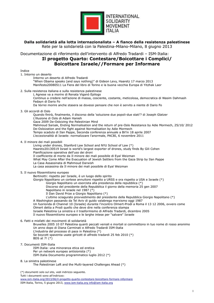 Dalla solidarietà alla lotta internazionalista – A fianco della resistenza palestinese Rete per la solidarietà con la Palestina-Milano-Milano, 8 giugno 2013 Documentazione di riferimento dell'intervento di Alfredo Tradardi – ISM-Italia: Il progetto Quarto: Contestare/Boicottare i Complici/ Boicottare Israele//Formare per Informare Indice 1. Intorno un deserto Intorno un deserto di Alfredo Tradardi “When Obama speaks (and says nothing)” di Gideon Levy, Haaretz 17 marzo 2013 Manifesto20080511 La Fiera del libro di Torino e la buona vecchia Europa di Yitzhak Laor 2. Sulla resistenza italiana e sulla resistenza palestinese L Agnese va a morire di Renata Viganò Epilogo Continuo a credere nell'azione di massa, cosciente, costante, meticolosa, democratica di Wasim Dahmash Fedayn di Dario Fo Da Vorrei morire anche stasera se dovessi pensare che non è servito a niente di Dario Fo 3. Gli accordi di Oslo Quando finirà, finalmente, il discorso della 'soluzione due popoli-due stati'? di Joseph Glatzer L'illusione di Oslo di Adam Hanieh Gaza 2009 De-Osloizing the Palestinian Mind Mahmoud Sarsak, Ending Normalisation and the return of pre-Oslo Resistance by Adie Mormech, 25/10/ 2012 De-Osloization and the fight against Normalisation by Adie Mormech Tempo scaduto di Ilan Pappe, Seconda conferenza annuale a Bil’in 18 aprile 2007 L'eccezionalità di Israele: normalizzare l'anormale, PACBI, 6 novembre 2011 4. Il minore dei mali possibili Living under drones, Stanford Law School and NYU School of Law (*) Haaretz20130519 Israel is world's largest exporter of drones, study finds By Gili Cohen Pianificazione operativa dell'uso dei droni Il coefficiente di morte da Il minore dei mali possibile di Eyal Weizman What May Come After the Evacuation of Jewish Settlers from the Gaza Strip by Ilan Pappe La Casa Assassinata di Mahmoud Darwish La casa assassina da Il minore dei mali possibile di Eyal Weizman 5. Il nuovo filosemitismo europeo Bertinotti: rispetto per Israele, è un luogo dello spirito Giorgio Napolitano un cortese annuitore rispetto a URSS e ora rispetto a USA e Israele (*) Giorgio Napolitano un esorcista alla presidenza della repubblica (*) Discorso del presidente della Repubblica il giorno della memoria 25 gen 2007 Napolitano in israele nel 1987 (*) Il Dan David Prize a Giorgio Napolitano (*) L'ultimo sciagurato provvedimento del presidente della Repubblica Giorgio Napolitano (*) A Washington passando da Tel Aviv di guido valabrega marxismo oggi 1987 Un fuorionda di Channel 10 (Israele) durante l'incontro Olmert-Prodi a Roma il 13 12 2006, ovvero come Olmert detta a Prodi quello che deve dire nella conferenza stampa Israele Palestina La sinistra e il trasformismo di Alfredo Tradardi, dicembre 2005 Il nuovo filosemitismo europeo e le larghe intese per "salvare" Israele 6. Fatti e misfatti dei movimenti di solidarietà Bruxelles 2005 10 07 Palestina quanti peccati veniali e mortali si commettono in tuo nome di rosso anonimo Un anno dopo di Diana Carminati e Alfredo Tradardi ISM-Italia L'industria del processo di pace in Palestina (*) Se boycott spaventa usate girlcott di alfredo tradardi 25 feb 2010 (*) BDS at 7! (*) 7. Documenti ISM-Italia ISM-Italia: una minoranza etica ed eretica Per un network europeo antisionista (*) ISM-Italia Documento programmatico luglio 2012 (*) 8. La sinistra palestinese The Palestinian Left and the Multi-layered Challenges Ahead (*) (*) documenti solo sul sito, vedi indirizzo seguente. Tutti i documenti sono all'indirizzo: www.ism-italia.org/2013/06/il-progetto-quarto-contestare-boicottare-formare-informare ISM-Italia, Torino, 5 giugno 2013, www.ism-italia.org [email protected] 1 1. Intorno un deserto Intorno un deserto di Alfredo Tradardi “When Obama speaks (and says nothing)” di Gideon Levy, Haaretz 17 marzo 2013 Manifesto20080511 La Fiera del libro di Torino e la buona vecchia Europa di Yitzhak Laor 2 Intorno un deserto Sono Sono Sono Sono Sono Sono Sono passati passati passati passati passati passati passati 66 65 65 49 46 40 31 anni anni anni anni anni anni anni dalla risoluzione di partizione della Palestina! dall'inizio della pulizia etnica della Palestina! dalla costituzione dello Stato di Israele! dalla costituzione dell'OLP (l'Organizzazione per la Liberazione della Palestina) dalla occupazione della Cisgiordania e della Striscia di Gaza! dalla guerra del Kippur! dal massacro di Sabra e Chatila! Intorno un deserto Sono Sono Sono Sono Sono passati passati passati passati passati 22 20 15 11 11 anni anni anni anni anni dagli incontri di Madrid! dalla firma degli accordi di Oslo! dalla firma del patto di Wye Plantation! dalla Operazione Defensive Shield! dall'inizio della costruzione del Muro! Intorno un deserto Sono passati 26 anni dall'inizio della prima Intifada! Sono passati 13 anni dall'inizio della seconda Intifada! Intorno un deserto Sono anni che si parla di una soluzione due popoli – due stati! Sono anni che il cinismo dell'Occidente avvelena la questione palestinese! Sono anni che l'ipocrisia dell'Occidente sostiene un regime coloniale di insediamento! Sono anni che le menzogne dell'Occidente sostengono ogni barbarie di uno Stato razzista! Sono anni che si continua nella farsa del processo di pace! Sono anni di una sistematica complicità amorale con il sionismo, un movimento coloniale di insediamento che continua a perseguire l'obiettivo della pulizia etnica della Palestina! Intorno un deserto: Un deserto morale, culturale e politico! Ciniche, ipocrite e assordanti le voci del deserto! Etiche ed eretiche le esili voci dal deserto, le voci della non-menzogna e della non collaborazione, le voci che cercano di dare voce alla resistenza palestinese! Intorno un deserto Alfredo Tradardi ISM-Italia, Torino, 4 aprile 2013 3 Haaretz20130317 When Obama speaks (and says nothing) By Gideon Levy Il 18 marzo 2013 si è insediato in Israele quello che è stato definito il governo dei coloni. Ha ricevuto l'immediata benedizione del Presidente degli Stati