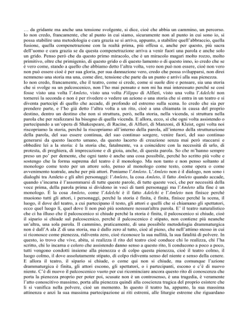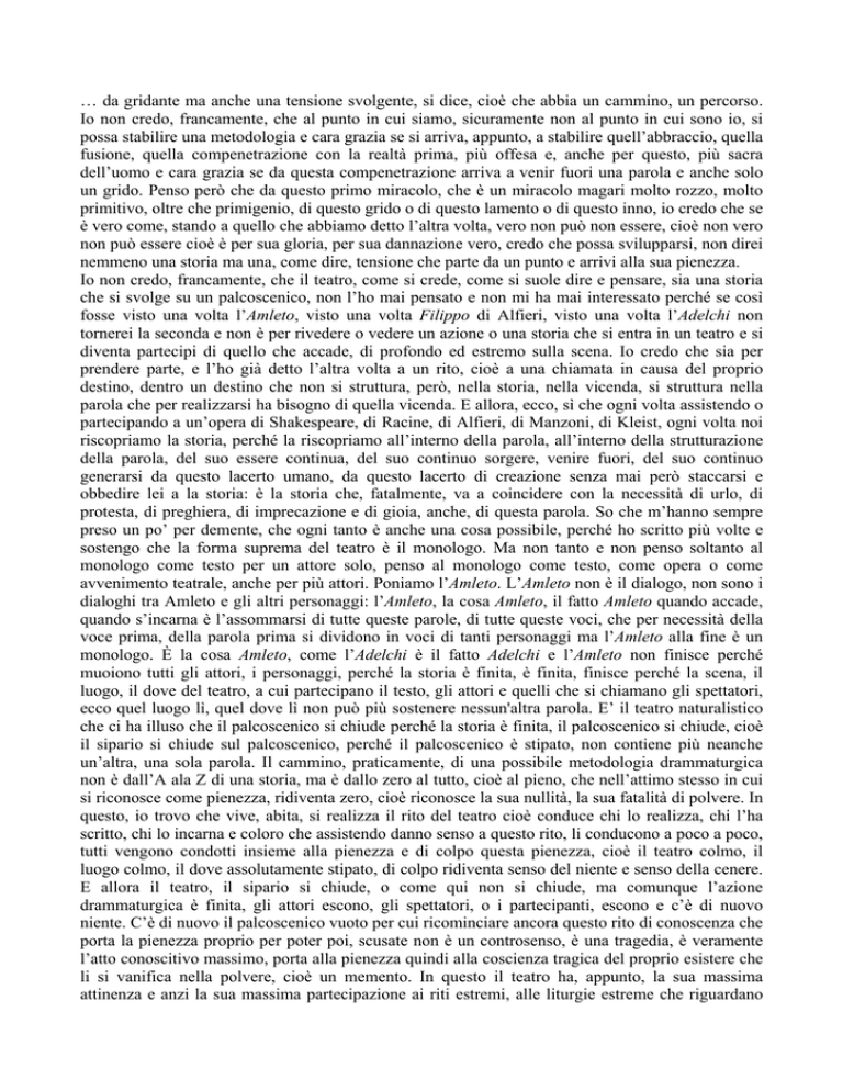 … da gridante ma anche una tensione svolgente, si dice, cioè che abbia un cammino, un percorso. Io non credo, francamente, che al punto in cui siamo, sicuramente non al punto in cui sono io, si possa stabilire una metodologia e cara grazia se si arriva, appunto, a stabilire quell’abbraccio, quella fusione, quella compenetrazione con la realtà prima, più offesa e, anche per questo, più sacra dell’uomo e cara grazia se da questa compenetrazione arriva a venir fuori una parola e anche solo un grido. Penso però che da questo primo miracolo, che è un miracolo magari molto rozzo, molto primitivo, oltre che primigenio, di questo grido o di questo lamento o di questo inno, io credo che se è vero come, stando a quello che abbiamo detto l’altra volta, vero non può non essere, cioè non vero non può essere cioè è per sua gloria, per sua dannazione vero, credo che possa svilupparsi, non direi nemmeno una storia ma una, come dire, tensione che parte da un punto e arrivi alla sua pienezza. Io non credo, francamente, che il teatro, come si crede, come si suole dire e pensare, sia una storia che si svolge su un palcoscenico, non l’ho mai pensato e non mi ha mai interessato perché se così fosse visto una volta l’Amleto, visto una volta Filippo di Alfieri, visto una volta l’Adelchi non tornerei la seconda e non è per rivedere o vedere un azione o una storia che si entra in un teatro e si diventa partecipi di quello che accade, di profondo ed estremo sulla scena. Io credo che sia per prendere parte, e l’ho già detto l’altra volta a un rito, cioè a una chiamata in causa del proprio destino, dentro un destino che non si struttura, però, nella storia, nella vicenda, si struttura nella parola che per realizzarsi ha bisogno di quella vicenda. E allora, ecco, sì che ogni volta assistendo o partecipando a un’opera di Shakespeare, di Racine, di Alfieri, di Manzoni, di Kleist, ogni volta noi riscopriamo la storia, perché la riscopriamo all’interno della parola, all’interno della strutturazione della parola, del suo essere continua, del suo continuo sorgere, venire fuori, del suo continuo generarsi da questo lacerto umano, da questo lacerto di creazione senza mai però staccarsi e obbedire lei a la storia: è la storia che, fatalmente, va a coincidere con la necessità di urlo, di protesta, di preghiera, di imprecazione e di gioia, anche, di questa parola. So che m’hanno sempre preso un po’ per demente, che ogni tanto è anche una cosa possibile, perché ho scritto più volte e sostengo che la forma suprema del teatro è il monologo. Ma non tanto e non penso soltanto al monologo come testo per un attore solo, penso al monologo come testo, come opera o come avvenimento teatrale, anche per più attori. Poniamo l’Amleto. L’Amleto non è il dialogo, non sono i dialoghi tra Amleto e gli altri personaggi: l’Amleto, la cosa Amleto, il fatto Amleto quando accade, quando s’incarna è l’assommarsi di tutte queste parole, di tutte queste voci, che per necessità della voce prima, della parola prima si dividono in voci di tanti personaggi ma l’Amleto alla fine è un monologo. È la cosa Amleto, come l’Adelchi è il fatto Adelchi e l’Amleto non finisce perché muoiono tutti gli attori, i personaggi, perché la storia è finita, è finita, finisce perché la scena, il luogo, il dove del teatro, a cui partecipano il testo, gli attori e quelli che si chiamano gli spettatori, ecco quel luogo lì, quel dove lì non può più sostenere nessun'altra parola. E’ il teatro naturalistico che ci ha illuso che il palcoscenico si chiude perché la storia è finita, il palcoscenico si chiude, cioè il sipario si chiude sul palcoscenico, perché il palcoscenico è stipato, non contiene più neanche un’altra, una sola parola. Il cammino, praticamente, di una possibile metodologia drammaturgica non è dall’A ala Z di una storia, ma è dallo zero al tutto, cioè al pieno, che nell’attimo stesso in cui si riconosce come pienezza, ridiventa zero, cioè riconosce la sua nullità, la sua fatalità di polvere. In questo, io trovo che vive, abita, si realizza il rito del teatro cioè conduce chi lo realizza, chi l’ha scritto, chi lo incarna e coloro che assistendo danno senso a questo rito, li conducono a poco a poco, tutti vengono condotti insieme alla pienezza e di colpo questa pienezza, cioè il teatro colmo, il luogo colmo, il dove assolutamente stipato, di colpo ridiventa senso del niente e senso della cenere. E allora il teatro, il sipario si chiude, o come qui non si chiude, ma comunque l’azione drammaturgica è finita, gli attori escono, gli spettatori, o i partecipanti, escono e c’è di nuovo niente. C’è di nuovo il palcoscenico vuoto per cui ricominciare ancora questo rito di conoscenza che porta la pienezza proprio per poter poi, scusate non è un controsenso, è una tragedia, è veramente l’atto conoscitivo massimo, porta alla pienezza quindi alla coscienza tragica del proprio esistere che li si vanifica nella polvere, cioè un memento. In questo il teatro ha, appunto, la sua massima attinenza e anzi la sua massima partecipazione ai riti estremi, alle liturgie estreme che riguardano l’esistenza dell’uomo. È chiaro che una parola come quella di cui sto parlando che è quella a cui, oscenamente, con tutte le mie inabilità (che l’abilità non m’interessa), con tutte le mie povertà è quella a cui tendo è una parola che arrischia continuamente di non poter essere detta io non credo che esista un vero linguaggio teatrale tragico che si possa dire senza rischiare di distruggersi e di distruggerlo. E’ una esecuzione, l’hanno chiamata, direi all’atto esecutivo estremo, direi al rischio estremo che la vera parola del teatro compie. Se una parola la si può dire senza che l’essere incarnata determini, per chi l’ha scritta e per chi la incarna e per chi la partecipa, il rischio della sua stessa propria tranquillità fisica, mentale, psichica e sentim