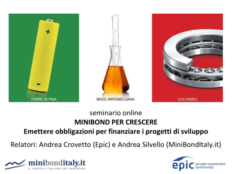 seminario online MINIBOND PER CRESCERE Emettere obbligazioni per finanziare i progetti di sviluppo Relatori: Andrea Crovetto (Epic) e Andrea Silvello (MiniBondItaly.it) Agenda 1 Un nuovo modello di finanziamento per le PMI 2 Il business plan per accedere al mercato dei capitali 3 L‘emissione di minibond 4 Il ruolo dell'advisor e gli altri professionisti coinvolti Imprese e canali di finanziamento strutturali. PMI BANCHE INVESTITORI Fonte: elaborazione Epic su dati Banca d’Italia (per Italia e USA), stime Epic per PMI Mercato dei capitali. Italia, PMI e canali di finanziamento. Composizione delle imprese* per classe di fatturato, 2013 Migliaia di aziende Fatturato (EUR M) Fatturato cumulato (EUR Mld) Accesso al canale bancario Accesso al canale mercato dei capitali *Settori inclusi: industria, costruzioni, servizi Fonte: AIDA 417 485 642 847 Impatto della crisi economica sulle imprese italiane. Variazione fatturato per dimensione di impresa (2013/2007) 2% (3%) (9%) Piccole Medie Grandi La stagnazione della domanda conseguente alla crisi iniziata nel 2007 ha avuto pesanti effetti sul volume d'affari delle imprese italiane, in particolare sulle PMI. Fonte: Rapporto Cerved PMI 2014 Variazione margine operativo lordo per dimensione di impresa (2013/2007) (27%) (23%) (38%) Piccole Medie Fonte: Rapporto Cerved PMI 2014 Grandi A fronte di una riduzione del valore aggiunto e della produttività anche il MOL delle imprese Italiane ha subito un calo consistente, in particolare le PMI hanno registrato le flessioni più importanti. Credit crunch. II credito bancario a favore delle imprese italiane (variazione dello stock disponibile). Variazione su base annuale Variazione su base trimestrale Il flusso di credito dal sistema bancario verso le imprese si è tutto arrestato a seguito della crisi finanziaria sia per la contrazione della domanda di credito a lungo termine (minore propensione delle imprese ad investire) sia per la minore offerta di credito. (Fonte: Banca d'Italia, Politecnico di Milano) Quota percentuale di imprese che hanno richiesto finanziamenti ricevendo rifiuti % su campione selezionato da Banca d'Italia 1-49 addetti 50-249 addetti +13% 7,8 2011 Almeno 250 addetti +33% 14,2 16,0 2012 2013 6,3 9,1 2011 2012 +25% 12,1 3,3 2013 2011 6,8 8,5 2012 2013 L'incidenza dei rifiuti tra le imprese con meno di 50 addetti supera il 18% ma anche tra le imprese maggiori non scende sotto il 12% (Fonte: Consorzio Camerale per il credito e la finanza). Agenda 1 Un nuovo modello di finanziamento per le PMI 2 Il business plan per accedere al mercato dei capitali 3 L‘emissione di minibond 4 Il ruolo dell'advisor e gli altri professionisti coinvolti Il business plan come vestito per accedere al mercato dei capitali. La preparazione del business plan è un momento fondamentale per lo sviluppo e la crescita dell’impresa. Il business plan è un documento articolato e complesso che descrive (sia in termini quantitativi che qualitativi) chi è l’impresa, in che arena competitiva opera, cosa ha fatto nel passato, cosa pensa di fare nel futuro e con che risultati attesi. I destinatari del business plan possono essere la proprietà, gli amministratori, i controllori, i finanziatori e i partner. A seconda del destinatario il business plan ha un diverso obiettivo e una diversa chiave di lettura Sostenibilità finanziaria, attendibilità e coerenza delle ipotesi sono i “requisiti di base”. Il business plan non è semplicemente un insieme di “calcoli matematici”; è un documento strutturato e completo di informazioni sia storiche che prospettiche, di illustrazioni qualitative e di proiezioni economico-finanziarie. I principali capitoli del business plan sono: l’Executive Summary, il profilo della società, il mercato di riferimento, risultati storici e posizionamento competitivo, la strategia e il piano d’azione, proiezioni economico-finanziarie-patrimoniali. Il business plan come vestito per accedere al mercato dei capitali. Il piano deve essere “finanziariamente sostenibile”; in altri termini, le previsioni economico-finanziarie del piano devono mostrare che i fabbisogni finanziari previsti sono correttamente “coperti” da fonti finanziarie ragionevolmente ipotizzabili nelle forme tecniche e nei tempi necessari. Il piano deve essere formulato sulla base di ipotesi realistiche e giustificabili e i risultati attesi devono apparire “ragionevolmente conseguibili” (sulla base dell’andamento storico e dell’evoluzione attesa del mercato e dei concorrenti). Sostenibilità finanziaria I “requisiti di base” che devono essere rispettati Confrontabilità con i risultati storici: quanto più i risultati prospettici differiscono da quelli passati e quanto più sono ambiziosi gli obiettivi di piano, tanto più sarà necessario proporre elementi a sostegno della loro credibilità. Compatibilità con le dinamiche del contesto competitivo Visibilità dei dati previsionali: possibilità di intravedere il formarsi dei dati preventivati (ad esempio, proiezioni sui primi dati consuntivi dell’esercizio in corso, su ordini già in portafoglio, su vendite da effettuare a clienti con cui esistono relazioni, ...). Attendibilità/ Fondatezza delle ipotesi Coerenza tra le diverse ipotesi e il contesto di riferimento Il piano può definirsi coerente se esistono i nessi causali tra le intenzioni strategiche, il piano d’azioni operative e le ipotesi poste a fondamento delle proiezioni economico-finanziarie. Un’altra dimensione del requisito della coerenza riguarda la realizzabilità del piano d’azioni operative attuali e prospettiche di cui l’azienda dispone e si doterà. Il business plan come vestito per accedere al mercato dei capitali. I “principali capitoli” del business plan Elementi essenziali e qualificanti Il business plan si basa su elementi sia qualitativi sia quantitativi che non possono essere separati senza pregiudicarne la fondatezza. Senza un’adeguata presentazione della societ