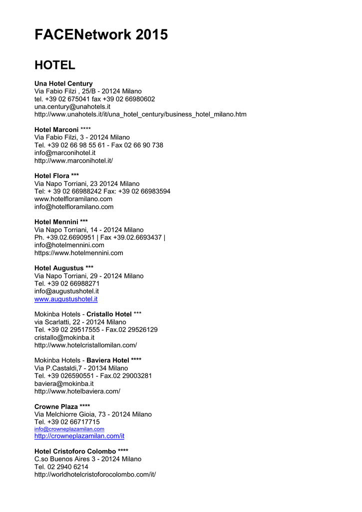 FACENetwork 2015 HOTEL Una Hotel Century Via Fabio Filzi , 25/B - 20124 Milano tel. +39 02 675041 fax +39 02 66980602 [email protected] http://www.unahotels.it/it/una_hotel_century/business_hotel_milano.htm Hotel Marconi **** Via Fabio Filzi, 3 - 20124 Milano Tel. +39 02 66 98 55 61 - Fax 02 66 90 738 [email protected] http://www.marconihotel.it/ Hotel Flora *** Via Napo Torriani, 23 20124 Milano Tel: + 39 02 66988242 Fax: +39 02 66983594 www.hotelfloramilano.com [email protected] Hotel Mennini *** Via Napo Torriani, 14 - 20124 Milano Ph. +39.02.6690951 | Fax +39.02.6693437 | [email protected] https://www.hotelmennini.com Hotel Augustus *** Via Napo Torriani, 29 - 20124 Milano Tel. +39 02 66988271 [email protected] www.augustushotel.it Mokinba Hotels - Cristallo Hotel *** via Scarlatti, 22 - 20124 Milano Tel. +39 02 29517555 - Fax.02 29526129 [email protected] http://www.hotelcristallomilan.com/ Mokinba Hotels - Baviera Hotel **** Via P.Castaldi,7 - 20134 Milano Tel. +39 026590551 - Fax.02 29003281 [email protected] http://www.hotelbaviera.com/ Crowne Plaza **** Via Melchiorre Gioia, 73 - 20124 Milano Tel. +39 02 66717715 [email protected] http://crowneplazamilan.com/it Hotel Cristoforo Colombo **** C.so Buenos Aires 3 - 20124 Milano Tel. 02 2940 6214 http://worldhotelcristoforocolombo.com/it/ Hotel Felice Casati **** Via Felice Casati, 18 - 2100 Milano Tel +39 02 29404208 Fax: +39 02 29404618 E-mail: [email protected] http://www.hotelfelicecasati.com/ Andreola Central Hotel Via Domenico Scarlatti, 24 - 20100 Milano Tel. +39026709141 Fax +390266713198 [email protected] http://www.andreolahotel.it/it/ Hotel Club Milano *** Via Copernico, 18 - 20125 Milano Tel. +39.02.67072221 Fax +39.02.67072050 [email protected] http://www.hotelclubmilano.com/it/index.asp Best Western Hotel Madison **** Via Leopoldo Gasparotto 8 – 20100 Milano Tel: +39 0267074150 Fax: +39 0267075059 [email protected] http://www.madisonhotelmilano.com/ Hotel New York *** Via Giovanni Battista Pirelli 5 - 20124 Milano tel. +39-02-66985551 fax. +39-02-6697267 e-mail [email protected] http://www.hotelnewyorkspa.com/ Hotel Monopole *** Via Fabio Filzi, 43 - 20124 Milano Tel.+39 0266984972 Fax +39 02 67073297 [email protected] www.hotelmonopole.com Hotel Serena Milan *** Via Boscovich, 59 (Angolo Corso BuenosAires) - 20124 Milano Tel. +39 02 29404483 Fax +39 0229404958 [email protected] www.hotelserenamilan.com Atlantic hotel **** via Napo Torriani 24 - 20124 Milano Tel. +39 02 6691941Fax: +39 02 6706533 [email protected] www.atlantichotel.it Hotel Charly Milano ** Via Settala, 76 -20100 Milano Tel. & Fax +39.02.20.47.190 [email protected] www.hotelcharly.com/ HOSTEL Ostello Bello Via Medici 4 – 20100 Milano Tel +39 0236582720 Cel +39 3342610356 Fax +39 0236582721 [email protected] www.ostellobello.com Ostello della gioventù – Youth Hostel Via Salmoiraghi angolo via Calliano – 20100 Milano Tel. +39 02 39267095 Fax. +39 02 33000191 [email protected] www.hostelmilan.org Zebra hostel Viale Regina Margherita, 9 - 20122 Milano Tel +390236705185 [email protected] http://www.zebrahostel.it BED&BREAKFAST www.bed-and-breakfast.it