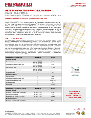 SCHEDA TECNICA FBMESH 66x66/33T96N doc. FB TEC 0107 - rev. 1.0 - 06/2015 RETE IN GFRP ANTISFONDELLAMENTO FBMESH 66x66/33T96N maglia principale 66x66 mm, maglia secondaria 33x66 mm per la messa in sicurezza dallo sfondellamento dei solai FBMESH 66x66/33T96N Rete preformata in GFRP (Glass Fiber Reinforced Polymer) TM di Fibre Net prodotta con tecnologia Textrusion , da utilizzare nel sistema FIBREBUILD LIFE+ di Fibre Net, maglia principale 66x66 mm, con barre costituite da fibre di vetro lunghe alcalino-resistenti impregnate con resina termoindurente di tipo epossidicovinilestere. La maglia secondaria ha dimensioni 33x66mm, costituita da barre in fibra di vetro poste a distanza 33 mm dalle barre principali, parallelamente alle barre di fibre intrecciate. Nella formazione della rete le fibre nelle due direzioni sono intrecciate ortogonalmente in modo da creare una maglia monolitica. VOCE DI CAPITOLATO Rete preformata in materiale composito fibrorinforzato G.F.R.P. (Glass Fiber reinforced Polymer), FBMESH 66x66/33T96N di Fibre Net, da utilizzarsi nel sistema FIBREBUILD LIFE+ di Fibre Net, per la messa in sicurezza dei solai misti, prodotta con tecnologia TextrusionTM, a maglia principale quadra monolitica dimensione 66x66 mm, costituita da fibra di vetro AR (Alcalino Resistente) con contenuto di zirconio pari o superiore al 16%, e resina termoindurente di tipo vinilestere-epossidico, tessitura con ordito a torcitura multipla e trama piatta inserita fra le fibre di ordito, spessore medio 3 mm, avente n. 15 barre/metro/lato, rigidezza assiale a trazione EA 230 kN, sezione nominale della singola barra 10 mm2, modulo elastico a trazione equivalente 23000 N/mm2, resistenza a trazione della singola barra 3,5 kN, allungamento a rottura 1,5%. Maglia secondaria di dimensione 33x66mm, per interposizione di una barra in fibra di vetro tra le barre a trama piatta, a distanza 33mm, costituita da fibra di vetro AR come sopra, spessore medio 1 mm, con disposizione di n. 15 fili/metro/lato, resistenza a trazione della singola barra 0,2 kN. Caratteristiche geometriche Normativa Valore Maglia principale Spessore medio Sezione nominale della singola barra Area nominale fibre Dimensione della maglia (AxB) Barre/metro/lato CNR-DT 200/2004 CNR-DT 203/2006 CNR-DT 200/2004 CNR-DT 203/2006 CNR-DT 200/2004 CNR-DT 203/2006 CNR-DT 200/2004 CNR-DT 203/2006 --- 3 mm 10 mm2 3,8 mm2 66x66 mm 15 Maglia secondaria Spessore medio --- 1 mm Sezione nominale della singola barra --- 3 mm2 Dimensione della maglia (AxB) --- 33x66 mm Barre/metro/lato --- 15 Peso totale --- 520 g/m2 Normativa Valore Resistenza a trazione della singola barra ISO 527-4,5:1997 3,5 kN Allungamento a rottura ISO 527-4,5:1997 1,5 % Rigidezza assiale media a trazione EA ISO 527-4,5:1997 230 kN --- 0,2 kN Caratteristiche meccaniche maglia Maglia principale Maglia secondaria Resistenza a trazione della singola barra CONFORME A LINEE GUIDA CNR-DT 200 R1/2013 CNR-DT 203/2006 SCHEDA TECNICA FBMESH 66x66/33T96N doc. FB TEC 0107 - rev. 1.0 - 06/2015 RETE IN GFRP ANTISFONDELLAMENTO FBMESH 66x66/33T96N maglia principale 66x66 mm, maglia secondaria 33x66 mm Caratteristiche chimico-fisiche Normativa Valore Maglia principale Fibra di vetro ASTM C1666M-07 vetro AR - ZrO2 ≥ 16 % ISO 1889:1986 19-24 μm Resina termoindurente --- epossidico-vinilestere Densità resina --- 1,1 g/cm3 DIN 53445 120 °C Coefficiente di dilatazione termica --- 6-7x10-6 cm/cm°C Conduttività termica --- 0,25 kcal/mh°C Rapporto in peso fibra/resina --- 65/35 % Sezione della fibra Temperatura di distorsione termica Tg Radiotrasparenza a 1 GHz MIL-STD-285 max 1 ΔdB Comportamento a esposizione a raggi UV ASTM G154-2006 nessun difetto (scala grigi 5) Comportamento a calore, freddo, umidità ISO 9142:04 nessun difetto (n. cicli 21) Riciclabilità Colore Comportamento al fuoco* Protocollo CSI cert. n. 140001 --- verde 6018 (RAL) EN 13501 - 1: 2009 A2 VANTAGGI - ottime caratteristiche meccaniche - durabilità - riciclabilità - resistenza agli agenti atmosferici - leggerezza e maneggevolezza - rapidità e facilità di applicazione - compatibilità con il supporto murario e con malte a base calce o cemento - reversibilità - spessore sottile * Valutato considerando rete FBMESH 66x66T96AR interposta in uno spessore da 30 mm di malta premiscelata FIBREBUILD NHL 8MPa classificata A1. MODALITÀ DI IMPIEGO Messa in sicurezza di solai (antisfondellamento): La rete FBMESH 66X66/33T96N è utilizzabile, in abbinamento a connettori in acciaio galvanizzato/cementato o inox, per la realizzazione di interventi di messa in sicurezza di solai misti soggetti a distacco delle cartelle inferiori degli elementi in laterizio, ovvero a sfondellamento. L’applicazione può essere a vista o con controsoffitto, oppure sotto intonaco. Per impieghi diversi da quelli indicati contattare l’Ufficio Tecnico Fibre Net. INDICAZIONI DI POSA Dopo aver ripristinato i travetti degradati e aver rimosso eventuale materiale di distacco, posizionare la rete srotolando il rotolo ortogonalmente ai travetti e fissarla con le apposite connessioni. Il taglio della rete viene realizzato per mezzo di cesoie e/o tronchesi da cantiere o con smerigliatrice angolare. Completare con intonaco di finitura, qualora previsto. Fare riferimento alle schede tecniche del sistema FIBREBUILD LIFE+ e ai quaderni tecnici Fibre Net specifici per i dettagli sull'applicazione del sistema antisfondellamento. RICICLABILITA’ Fibre Net è la prima azienda italiana ad aver ottenuto la certificazione “CSI RECYCLABLE COMPOSITES” per i suoi prodotti in FRP. La rete in GFRP FBMESH rientra tra i prodotti certificati dall’ente CSICERT ed è pertanto completamente riciclabile. CONFEZIONI Rotoli: altezza 2 m Superficie rotolo peso Superficie rotolo 40 m 2 20,8 kg 80 m 60 m 2 31,2 kg 100 m 2 2 peso 41,6 kg 52 kg INDICAZIONI DI SICUREZZA La movimentazione, il trasporto e lo stoccaggio del materiale devono essere eseguiti con dovute precauzioni al fine di evitare danneg