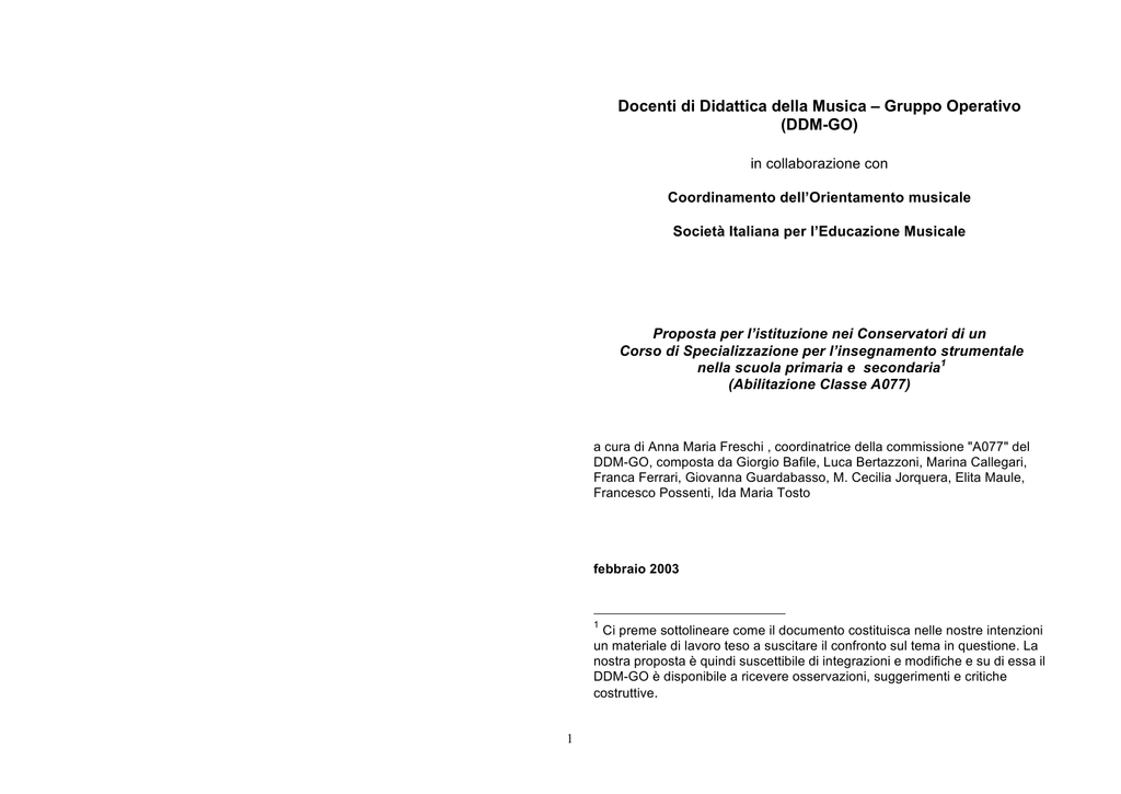 Docenti di Didattica della Musica – Gruppo Operativo (DDM-GO) in collaborazione con Coordinamento dell’Orientamento musicale Società Italiana per l’Educazione Musicale Proposta per l’istituzione nei Conservatori di un Corso di Specializzazione per l’insegnamento strumentale nella scuola primaria e secondaria1 (Abilitazione Classe A077) a cura di Anna Maria Freschi , coordinatrice della commissione "A077" del DDM-GO, composta da Giorgio Bafile, Luca Bertazzoni, Marina Callegari, Franca Ferrari, Giovanna Guardabasso, M. Cecilia Jorquera, Elita Maule, Francesco Possenti, Ida Maria Tosto febbraio 2003 1 Ci preme sottolineare come il documento costituisca nelle nostre intenzioni un materiale di lavoro teso a suscitare il confronto sul tema in questione. La nostra proposta è quindi suscettibile di integrazioni e modifiche e su di essa il DDM-GO è disponibile a ricevere osservazioni, suggerimenti e critiche costruttive. 1 INDICE Situazione normativa e motivazioni della proposta La professionalità dell’insegnante di strumento nella secondaria Quale percorso formativo? Quadro degli obiettivi formativi Ipotesi di ordinamenti didattici Quadro delle attività formative 2 SITUAZIONE NORMATIVA E MOTIVAZIONI DELLA PROPOSTA Negli ultimi anni sono stati emanati diversi provvedimenti legislativi di notevole rilevanza, che hanno mutato sensibilmente il quadro normativo nel campo dell’insegnamento dello strumento nella scuola secondaria e più in generale in quello della formazione degli insegnanti: • il DM n.201/99 ha sancito la messa a ordinamento delle Scuole Medie a indirizzo musicale (d’ora in poi SMIM), fino a quel momento sperimentali, e ne ha indicato ordinamenti e contenuti, rimandando ad un successivo Decreto (mai emanato) la definizione delle modalità di reclutamento dei docenti e istituendo una nuova Classe di concorso denominata “Strumento musicale nella scuola secondaria” (A077) • la Legge n.508/99 ha inserito i Conservatori nel comparto dell’AFAM e previsto l’emanazione di nuovi Regolamenti e ordinamenti didattici • la Legge n.268/02 ha sancito l’equivalenza dei Diplomi di Conservatorio alle Lauree universitarie di I livello ed ha attribuito valore abilitante per le Classi A031 e A032 ai Diplomi conseguiti nelle Scuole quadriennali di Didattica della musica • la Legge Delega Moratti in via di approvazione alla Camera recita all’Art. 5, relativo alla formazione degli insegnanti: “Con i decreti di cui all'articolo 1 sono dettate norme anche sulla formazione iniziale svolta negli istituti di alta formazione e specializzazione artistica, musicale e coreutica di cui alla legge 21 dicembre 1999, n.508, relativamente agli insegnamenti cui danno accesso i relativi diplomi accademici.” Risulta quindi improrogabile l’esigenza di fornire una specifica formazione, tale da garantire l’acquisizione di quelle competenze (di carattere musicale, metodologico, didattico e psicopedagogico) indispensabili per affrontare con serietà e professionalità l’insegnamento di uno strumento musicale. Queste considerazioni ci sembrano sottolineare l’urgenza di un intervento del MIUR in questo settore, intervento che, a nostro parere, dovrebbe consentire alle istituzioni dell’AFAM di istituire specifici Corsi di Specializzazione abilitanti per la Classe A077 senza attendere l’emanazione dei Regolamenti attuativi della 508, i cui tempi non sono allo stato attuale prevedibili. A sostegno della nostra proposta, ci teniamo a sottolineare come l’aumento del numero delle SMIM registratosi negli ultimi anni abbia ampliato in modo consistente il numero di cattedre disponibili e quindi come il conseguimento di questa abilitazione offra nell’immediato possibilità di impiego non irrilevanti, non solo nella scuola secondaria, ma anche nelle sempre più numerose Scuole di musica pubbliche e private. Infine non dobbiamo dimenticare che l’attivazione di Licei musicali prevista dalla Legge Moratti di riforma della scuola aprirà in un prossimo futuro ulteriori prospettive professionali per gli insegnanti di strumento. Nonostante queste premesse, a più di tre anni di distanza dall’istituzione della Classe di concorso A077, ancora nessun percorso formativo abilitante è stato attivato, né nell’Università né nei Conservatori, con la conseguenza che moltissimi Diplomati in strumento che aspirerebbero ad insegnare in tale settore si trovano nell’impossibilità di ottenere una preparazione specifica per questo compito. 3 LA PROFESSIONALITA’ DELL’INSEGNANTE DI STRUMENTO NELLA SECONDARIA preparazione dei futuri insegnanti di strumento, l’esperienza compiuta in veste di allievi. Alla luce della riflessione sviluppatasi nel campo della didattica musicale, la riproposizione pura e semplice dei metodi applicati dal proprio insegnante e tramandati a propria volta senza il necessario approfondimento pedagogico, appare ormai del tutto anacronistica, come risulta anche dalle richieste di formazione specifica che sempre più spesso giungono dagli allevi delle SDM. E’ dunque necessario che i futuri insegnanti di strumento ricevano un’adeguata preparazione didattica, considerando inoltre che l’inserimento dell’insegnamento strumentale in contesti formativi assai diversi dal Conservatorio stesso (SMIM, scuole comunali di musica, ecc.) pone all’insegnante di problemi del tutto inediti (come per esempio reperire un repertorio opportunamente predisposto, impostare e guidare momenti di musica d’assieme, ecc.) per la cui soluzione sono necessari raffinati strumenti specificatamente operativi nonché di riflessione e progettazione. Quali competenze sono necessarie al futuro insegnante di strumento delle SMIM e dei Licei musicali? Utili indicazioni possono essere fornite innanzitutto dagli insegnanti che già da molti anni operano nelle SMIM e che hanno costruito “sul campo” la loro professionalità. Durante la Giornata di Studio svoltasi a Perugia il 28 settembre scors