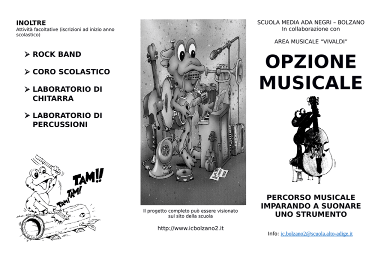 SCUOLA MEDIA ADA NEGRI – BOLZANO In collaborazione con INOLTRE Attività facoltative (iscrizioni ad inizio anno scolastico) AREA MUSICALE “VIVALDI” ROCK BAND OPZIONE MUSICALE CORO SCOLASTICO LABORATORIO DI CHITARRA LABORATORIO DI PERCUSSIONI Il progetto completo può essere visionato sul sito della scuola http://www.icbolzano2.it PERCORSO MUSICALE IMPARANDO A SUONARE UNO STRUMENTO Info: [email protected] La proposta di percorso musicale definito Opzione musicale, che si realizza per due ore oltre all'orario curricolare, nasce dalla pluriennale esperienza in ambito musicale della scuola in collaborazione con l’area musicale Vivaldi. All’Opzione musicale possono accedere tutti i ragazzi delle classi prime che ne fanno richiesta e che abbiano superato il test di ingresso fino al raggiungimento di massimo 25 iscritti. Gli studenti dell'Opzione musicale seguiranno il normale curriculum scolastico offerto dalla scuola con l’aggiunta, in orario pomeridiano, di una lezione di strumento e di una lezione di teoria o di musica di insieme. Alla fine del triennio si prevede che gli alunni possiedano una adeguata conoscenza dello strumento, delle forme e dei generi musicali, degli altri strumenti d’orchestra e delle fondamentali questioni psicosociali dell’ascolto e del fare musica insieme, condizioni di base per una educazione alla vita ma anche per eventuali scelte successive circa lo studio approfondito della musica presso l’Area Musicale, nei Licei Musicali e/o al Conservatorio. Ammissione all’ Opzione musicale Gli alunni sosterranno un test attitudinale volto a verificare l’interesse e la predisposizione allo studio di uno strumento musicale in un contesto scolastico. Verranno ammessi solo gli alunni che riporteranno una valutazione pari o superiore a sufficiente (18/30). Si possono indicare 3 strumenti in ordine di preferenza. Gli alunni che fossero già iscritti allo studio di uno strumento presso l’Area musicale potranno mantenere lo stesso strumento compatibilmente con le limitazioni previste dalla scuola. Le domande di ammissione vanno presentate in segreteria entro il 31 gennaio. GLI STRUMENTI FLAUTO TRAVERSO OBOE CLARINETTO FAGOTTO TROMBA CORNO SAXOFONO VIOLINO VIOLONCELLO CONTRABBASSO ARPA PIANOFORTE TASTIERA FISARMONICA CHITARRA BASSO ELETTRICO PERCUSSIONI Le lezioni di strumento (60’) e di musica di insieme (50’) si svolgono di norma presso la scuola media in orario pomeridiano. La scuola media A.Negri ha un orario articolato su 5 giorni settimanali. In caso di assenze ingiustificate o rendimento insufficiente l’alunno verrà ritirato dall’opzione. ATTIVITA’ CONNESSE PERCORSI DIDATTICI PER LA CONOSCENZA DEGLI STRUMENTI (in quinta elementare) USCITE DIDATTICHE PER CONOSCERE L’ORCHESTRA E I SUOI STRUMENTI PROVA STRUMENTI (con gli insegnanti dell’area) MUSICA DI INSIEME PER GRUPPI: GRUPPO OTTONI GRUPPO LEGNI GRUPPO CORDE CONCERTI NATALE, CARNEVALE E FINE ANNO PARTECIPAZIONE AGLI EVENTI DELL’AREA MUSICALE COSTI NOLEGGIO STRUMENTO: 50/100 euro all’anno Non vengono dati a noleggio i seguenti strumenti: chitarra, pianoforte, tastiera, batteria, arpa, fisarmonica CORSO STRUMENTALE: 30 euro all’anno