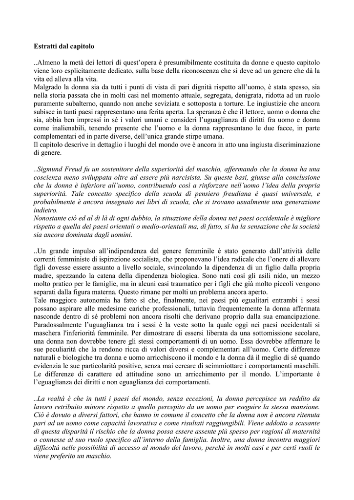 Estratti dal capitolo ..Almeno la metà dei lettori di quest’opera è presumibilmente costituita da donne e questo capitolo viene loro esplicitamente dedicato, sulla base della riconoscenza che si deve ad un genere che dà la vita ed alleva alla vita. Malgrado la donna sia da tutti i punti di vista di pari dignità rispetto all’uomo, è stata spesso, sia nella storia passata che in molti casi nel momento attuale, segregata, denigrata, ridotta ad un ruolo puramente subalterno, quando non anche seviziata e sottoposta a torture. Le ingiustizie che ancora subisce in tanti paesi rappresentano una ferita aperta. La speranza è che il lettore, uomo o donna che sia, abbia ben impressi in sé i valori umani e consideri l’uguaglianza di diritti fra uomo e donna come inalienabili, tenendo presente che l’uomo e la donna rappresentano le due facce, in parte complementari ed in parte diverse, dell’unica grande stirpe umana. Il capitolo descrive in dettaglio i luoghi del mondo ove è ancora in atto una ingiusta discriminazione di genere. ..Sigmund Freud fu un sostenitore della superiorità del maschio, affermando che la donna ha una coscienza meno sviluppata oltre ad essere più narcisista. Su queste basi, giunse alla conclusione che la donna è inferiore all’uomo, contribuendo così a rinforzare nell’uomo l’idea della propria superiorità. Tale concetto specifico della scuola di pensiero freudiana è quasi universale, e probabilmente è ancora insegnato nei libri di scuola, che si trovano usualmente una generazione indietro. Nonostante ciò ed al di là di ogni dubbio, la situazione della donna nei paesi occidentale è migliore rispetto a quella dei paesi orientali o medio-orientali ma, di fatto, si ha la sensazione che la società sia ancora dominata dagli uomini. ..Un grande impulso all’indipendenza del genere femminile è stato generato dall’attività delle correnti femministe di ispirazione socialista, che proponevano l’idea radicale che l’onere di allevare figli dovesse essere assunto a livello sociale, svincolando la dipendenza di un figlio dalla propria madre, spezzando la catena della dipendenza biologica. Sono nati così gli asili nido, un mezzo molto pratico per le famiglie, ma in alcuni casi traumatico per i figli che già molto piccoli vengono separati dalla figura materna. Questo rimane per molti un problema ancora aperto. Tale maggiore autonomia ha fatto sì che, finalmente, nei paesi più egualitari entrambi i sessi possano aspirare alle medesime cariche professionali, tuttavia frequentemente la donna affermata nasconde dentro di sé problemi non ancora risolti che derivano proprio dalla sua emancipazione. Paradossalmente l’uguaglianza tra i sessi è la veste sotto la quale oggi nei paesi occidentali si maschera l'inferiorità femminile. Per dimostrare di essersi liberata da una sottomissione secolare, una donna non dovrebbe tenere gli stessi comportamenti di un uomo. Essa dovrebbe affermare le sue peculiarità che la rendono ricca di valori diversi e complementari all’uomo. Certe differenze naturali e biologiche tra donna e uomo arricchiscono il mondo e la donna dà il meglio di sé quando evidenzia le sue particolarità positive, senza mai cercare di scimmiottare i comportamenti maschili. Le differenze di carattere ed attitudine sono un arricchimento per il mondo. L’importante è l’eguaglianza dei diritti e non eguaglianza dei comportamenti. ..La realtà è che in tutti i paesi del mondo, senza eccezioni, la donna percepisce un reddito da lavoro retribuito minore rispetto a quello percepito da un uomo per eseguire la stessa mansione. Ciò è dovuto a diversi fattori, che hanno in comune il concetto che la donna non è ancora ritenuta pari ad un uomo come capacità lavorativa e come risultati raggiungibili. Viene addotto a scusante di questa disparità il rischio che la donna possa essere assente più spesso per ragioni di maternità o connesse al suo ruolo specifico all’interno della famiglia. Inoltre, una donna incontra maggiori difficoltà nelle possibilità di accesso al mondo del lavoro, perché in molti casi e per certi ruoli le viene preferito un maschio.