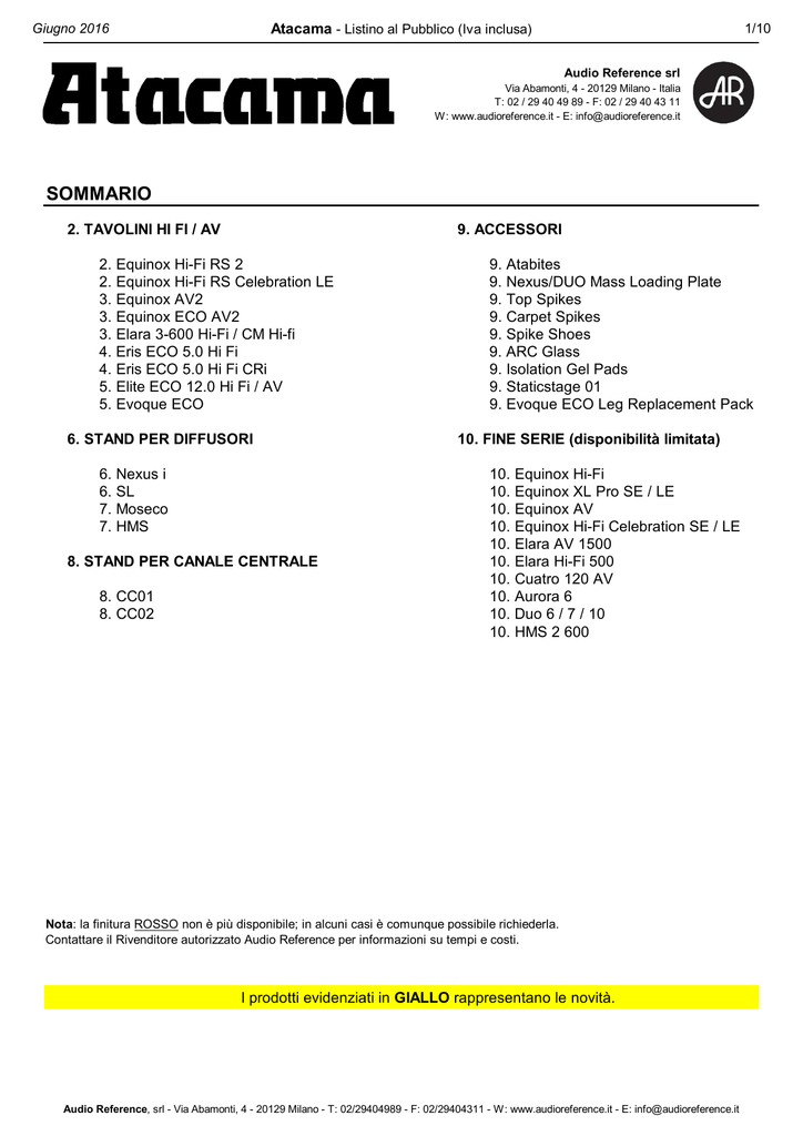 Atacama - Listino al Pubblico (Iva inclusa) Giugno 2016 1/10 Audio Reference srl Via Abamonti, 4 - 20129 Milano - Italia T: 02 / 29 40 49 89 - F: 02 / 29 40 43 11 W: www.audioreference.it - E: [email protected] SOMMARIO 2. TAVOLINI HI FI / AV 9. ACCESSORI 2. Equinox Hi-Fi RS 2 2. Equinox Hi-Fi RS Celebration LE 3. Equinox AV2 3. Equinox ECO AV2 3. Elara 3-600 Hi-Fi / CM Hi-fi 4. Eris ECO 5.0 Hi Fi 4. Eris ECO 5.0 Hi Fi CRi 5. Elite ECO 12.0 Hi Fi / AV 5. Evoque ECO 6. STAND PER DIFFUSORI 6. Nexus i 6. SL 7. Moseco 7. HMS 8. STAND PER CANALE CENTRALE 8. CC01 8. CC02 9. Atabites 9. Nexus/DUO Mass Loading Plate 9. Top Spikes 9. Carpet Spikes 9. Spike Shoes 9. ARC Glass 9. Isolation Gel Pads 9. Staticstage 01 9. Evoque ECO Leg Replacement Pack 10. FINE SERIE (disponibilità limitata) 10. Equinox Hi-Fi 10. Equinox XL Pro SE / LE 10. Equinox AV 10. Equinox Hi-Fi Celebration SE / LE 10. Elara AV 1500 10. Elara Hi-Fi 500 10. Cuatro 120 AV 10. Aurora 6 10. Duo 6 / 7 / 10 10. HMS 2 600 Nota: la finitura ROSSO non è più disponibile; in alcuni casi è comunque possibile richiederla. Contattare il Rivenditore autorizzato Audio Reference per informazioni su tempi e costi. I prodotti evidenziati in GIALLO rappresentano le novità. Audio Reference, srl - Via Abamonti, 4 - 20129 Milano - T: 02/29404989 - F: 02/29404311 - W: www.audioreference.it - E: [email protected] Atacama - Listino al Pubblico (Iva inclusa) Giugno 2016 2/10 Equinox Hi-Fi RS 2 Mobile porta elettroniche a 2 ripiani, massimo 20kg x ripiano, massimo 5 ripiani. Ripiano (LxP): 500x500mm. Distanza ripiani: 225mm. Ingombro mobile (LxAxP): 590x370x550mm. Disponibile con mobile nelle finiture Nero, Argento, Diamante, e con vetri color nero piano, color ghiaccio artico e in laminato ARC. Ripiani aggiuntivi alti 145mm o 195mm. Finitura Codice Prezzo Codice Prezzo Codice Prezzo Base a 2 ripiani, vetri nero piano Nero 00000 375 € Argento 00000 375 € Diamante 00000 375 € Ripiano altezza 145mm 00000 190 € 00000 190 € 00000 190 € Ripiano altezza 195mm 00000 190 € 00000 190 € 00000 190 € Base a 2 ripiani, vetri ghiaccio artico Nero 00000 375 € Argento 00000 375 € Diamante 00000 375 € Ripiano altezza 145mm 00000 190 € 00000 190 € 00000 190 € Ripiano altezza 195mm 00000 190 € 00000 190 € 00000 190 € Base a 2 ripiani, vetri in laminato ARC Nero 00000 500 € Argento 00000 500 € Diamante 00000 500 € Ripiano altezza 145mm 00000 260 € 00000 260 € 00000 260 € Ripiano altezza 195mm 00000 260 € 00000 260 € 00000 260 € Equinox Hi-Fi RS Celebration LE Mobile porta elettroniche fino a 4 ripiani aggiuntivi a scelta, kit di isolamento di XL Pro SE, riemp. colonne in Nomafoam, massimo 25kg x ripiano, massimo 5 ripiani. Ripiano (LxP): 500x500mm. Distanza ripiani: 220mm base, 2 ripiani aggiuntivi da 145 o 195mm. Ingombro mobile (LxxP): 590x550mm. Disponibile in Nero laccato, Nero, Argento, Diamante e Cesio (vetri neri, ghiaccio artico o ARC). Ripiano agg. 145mm o 195mm. Finitura Codice Prezzo Codice Prezzo Codice Prezzo Base con vetri neri Nero lucido 00000 Nero 00000 Argento 00000 Diamante 00000 520 520 520 520 € € € € Ripiano altezza 145mmRipiano altezza 195mm 00000 285 € 00000 285 € 00000 285 € 00000 285 € 00000 285 € 00000 285 € 00000 285 € 00000 285 € Base con vetri ghiaccio Nero lucido 00000 Nero 00000 Argento 00000 Diamante 00000 520 520 520 520 € € € € Ripiano altezza 145mmRipiano altezza 195mm 00000 285 € 00000 285 € 00000 285 € 00000 285 € 00000 285 € 00000 285 € 00000 285 € 00000 285 € Base con vetri ARC Nero lucido 00000 Nero 00000 Argento 00000 Diamante 00000 650 650 650 650 € € € € Ripiano altezza 145mmRipiano altezza 195mm 00000 350 € 00000 350 € 00000 350 € 00000 350 € 00000 350 € 00000 350 € 00000 350 € 00000 350 € Audio Reference, srl - Via Abamonti, 4 - 20129 Milano - T: 02/29404989 - F: 02/29404311 - W: www.audioreference.it - E: [email protected] Atacama - Listino al Pubblico (Iva inclusa) Giugno 2016 3/10 Equinox AV2 Mobile porta elettroniche a 2 ripiani per schermi piatti fino a 60", max 75kg per ripiano, max 100kg totale (il ripiano aggiuntivo consente di raggiungere 125kg max). Versione AV Plus senza ripiano aggiuntivo, con canalina nascondi cavi. Ripiano (LxP): 970x510mm. Dis. ripiani: 215mm. Ingombro (LxAxP): 1060x370x600mm. Disponibile in Nero, Argento, Diamante, e con vetri color nero piano, color ghiaccio artico. Finitura Codice Prezzo Codice Prezzo Vetri nero piano, base a 2 ripiani Nero 00000 555 € Argento 00000 555 € Diamante 00000 555 € Ripiano altezza 215mm 00000 340 € 00000 340 € 00000 340 € Vetri ghiaccio artico, base a 2 ripiani Nero 00000 555 € Argento 00000 555 € Diamante 00000 555 € Ripiano altezza 215mm 00000 340 € 00000 340 € 00000 340 € Equinox ECO AV2 Versioni speciali dei tavolini porta TV Equinox AV2 con ripiano top in bambù e base in vetro. Disponibile con ripiani in bambù finitura naturale, quercia chiara e quercia scura, e vetro color nero piano e ghiaccio artico. Finitura Codice Prezzo Codice Prezzo Codice Prezzo AV2, vetro nero, bambù naturale Nero 00000 700 € Argento 00000 700 € Diamante 00000 700 € Bambù quercia chiara 00000 730 € 00000 730 € 00000 730 € Bambù quercia scura 00000 730 € 00000 730 € 00000 730 € AV2, vetro ghiaccio, bambù naturale Nero 00000 700 € Argento 00000 700 € Diamante 00000 700 € Bambù quercia chiara 00000 730 € 00000 730 € 00000 730 € Bambù quercia scura 00000 730 € 00000 730 € 00000 730 € Ripiano aggiuntivo per AV2, bambù naturaleBambù quercia chiara Nero 00000 465 € 00000 500 € Argento 00000 465 € 00000 500 € Diamante 00000 465 € 00000 500 € Bambù quercia scura 00000 500 € 00000 500 € 00000 500 € Elara 3-600 Hi-Fi / CM Hi-Fi Mobile porta elettroniche a 4 ripiani, max 25kg per ripiano (30kg per la base), per max 75kg di capacità totale. Ripiani ad altezza regolabile (250/300/350/