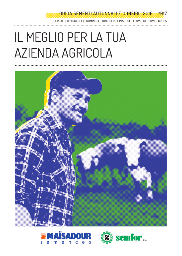 GUIDA SEMENTI AUTUNNALI E CONSIGLI 2016 – 2017 CEREALI FORAGGERI | LEGUMINOSE FORAGGERE | MISCUGLI | SOVESCI | COVER CROPS IL MEGLIO PER LA TUA AZIENDA AGRICOLA LA NOSTRA ATTIVITÀ DI RICERCA E SVILUPPO TI METTE A DISPOSIZIONE GLI ULTIMI PROGRESSI DELLA GENETICA Maïsadour Semences è una società sementiera francese specializzata nella selezione di ibridi. In Europa, investiamo ogni anno il 15% del nostro fatturato in ricerca e sviluppo (R&S) per trovare soluzioni che possano aiutarti ad aumentare la redditività della tua azienda. Grazie al nostro approccio basato sulla R&S, creiamo nuove linee e nuovi ibridi combinando genomica e agronomia. Genomica Identifichiamo le linee e gli ibridi che mostrano il più alto potenziale produttivo attraverso la genotipizzazione e l’impiego di marcatori molecolari. Agronomia Testiamo gli ibridi in condizioni reali per selezionare quelli con le migliori risposte produttive in ogni tipo di ambiente. I NUMERI DEI NOSTRI PROGRESSI GENETICI • • • • • • 150 ricercatori impegnati nei nostri laboratori 3 specie, 5 programmi di selezione 10 milioni di analisi di genotipizzazione all'anno 300.000 campi prova per testare nuovi ibridi 218 siti di sperimentazione in Europa 15% del fatturato di Maïsadour Semences investito annualmente in R&S I VANTAGGI CONCRETI PER LA TUA AZIENDA AGRICOLA Miglioramento della resa + 1% in media all'anno Miglioramento della stabilità produttiva + Tolleranza allo stress + Tolleranza alle malattie + Tolleranza all'allettamento Miglioramento della qualità + Digeribilità della fibra del mais da insilato (vedi catalogo primaverile pag. 10) + Miglioramento nella composizione e nel tenore in olio per il girasole (vedi catalogo primaverile pag. 28). 2 "CREATORE DI SOLUZIONI VEGETALI" SEMFOR srl ditta sementiera presente sul mercato italiano da più di 40 anni. Produce, lavora e commercializza sementi per l'agricoltura e la zootecnia. «Creatore di soluzioni vegetali» è lo slogan della società che esprime al meglio l’impegno e la sfida quotidiana di accompagnare agricoltori, allevatori, Viticoltori e Orticoltori verso lo scenario agricolo che si presenta in continua evoluzione. Vedi ad esempio Greening e/o misure agroambientali specifiche dei vari PSR regionali. L’attività di moltiplicazione delle sementi avviene presso aziende agricole dislocate sia Italia che in altri paesi europei su una superficie media di circa 800 ha. Il controllo qualità viene affidato a tecnici qualificati che verificano le varie fasi di moltiplicazione e lavorazione del seme per garantire uno standard certificato. Nel corso degli anni di attività si sono consolidate partnership commerciali e produttive con costitutori/società sementiere italiane ed estere leader nel breeder di cereali foraggeri che forniscono alla società varietà specifiche sempre più performanti ed adatte alle diverse condizioni pedo-climatiche. Ogni anno Semfor investe in sperimentazioni aziendali fatte attraverso prestigiose collaborazioni sia con enti pubblici che privati per testare le nuove soluzioni/prodotti e accrescere le specifiche competenze che richiede il mercato. Il gruppo Maïsadour Semences, uno dei soci storici della Semfor srl, ha potenziato la sua partecipazione acquisendo la totalità del pacchetto azionario. Attraverso questa operazione, il gruppo Maïsadour intende massimizzare le sinergie tra l'attività sementiera foraggera di Semfor srl e l'offerta di sementi ibride in Italia e in altri paesi. 3 PROGRAMMA NUTRIPLUS TI ACCOMPAGNIAMO IN ALLEVAMENTO NELLE VARIE FASI DI COLTIVAZIONE DEL FORAGGIO Il programma Nutriplus rappresenta lo strumento di gestione dei raccolti per la zootecnia. Consente di massimizzare la redditività dei raccolti di foraggio e aumentare, allo stesso tempo, l’autonomia in termini di energia e proteine. 1 SCEGLIERE IL PRODOTTO FORAGGERO PIÙ ADATTO TRA UN'AMPIA GAMMA DI COLTURE ADATTE ALLE DIVERSE CONDIZIONI PEDOCLIMATICHE E STATEGIE DI RAZIONE. • • • • • • 2 Silomais: dal ciclo precoce a quello tardivo (vedi catalogo primaverile pag. 10) Erba medica: con l'indice di dormienza più adatto alle tue esigenze Cover Crops Triticale Cereali foraggeri Miscugli per: erbaio, prato polifita, cover crops, sovescio ecc... PROTEGGERE LE VOSTRE SEMINE • PRECOSEM: strumento di supporto decisionale che consente di anticipare la data di semina per trarne il maggior profitto + 1 t SS/ha per la resa dell'insilato di mais • SAS GOLD: trattamento dei semi di erba medica che combina micronutrizione e pre-inoculo. + 6% di miglioramento della resa sul primo taglio di erba medica • PRECIDOSE: Erba medica in pratiche confezioni dal dosaggio di semina ottimale. Densità precisa ed efficiente della semina. 3 4 MIGLIORARE LA CONSERVAZIONE DEL TUO FORAGGIO • NUTRI GOAL: gamma di additivi per insilati di nuova generazione, adatta ai diversi sistemi di conservazione del foraggio. LA NOSTRA GAMMA Colza Lino Triticale ibrido Triticale convenzionale Frumento foraggero Farro spelta Segale Avena Loietto diploide Loietto tetraploide Pisello proteico Additivi per foraggio Erba medica Miscugli per erbaio – base loietto Miscugli per erbaio – base triticale Miscugli per erbaio – base cereali Miscugli per prato polifita Cover crops Trifoglio incarnato Trifoglio alessandrino Veccia comune Veccia villosa Favino Miscugli sovescio per incremento s.org. Senape bruna Senape bianca Rafano nematocida Miscuglio sovescio biocida/nematocida Facelia Colza foraggera Rafano decompattante Ravizzone Miscugli sovescio strutturante Inerbimenti permanenti pag. pag. pag. pag. pag. pag. pag. pag. pag. pag. pag. pag. pag. pag. pag. pag. pag. pag. pag. pag. pag. pag. pag. pag. pag. pag. pag. pag. pag. pag. pag. pag. pag. pag. 7 8 10 12 14 14 14 15 17 18 20 22 23 27 29 30 31 33 36 36 36 36 36 37 39 39 39 39 40 40 40 40 41 42 5 OLEAGINOSE A SEMINA AUTUNNALE 1 2 COLZA LINO OLEAGINOSO DA GRANELLA Il rinnovato interesse per il lino è relativo alle sue potenzialit