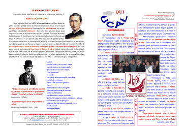 IL SANTO DEL MESE Bollettino formativo/informativo del movimento degli UNIVERSITARI CATTOLICI dell’ATENEO LUCANO Anno 12° - N° 1 (111) Gennaio 2013 Poste italiane – Sped. in A. P. – art. 2 c. 20/c Legge 662/96 – PZ Direttore responsabile: Gerardo Messina Per questo mese scegliamo un missionario veramente speciale, il Beato LUIGI VARIARA. Nato a Viarigi (Asti) nel 1875, allievo dell'Oratorio di Don Bosco vivente ancora il grande santo, divenuto chierico salesiano, a 19 anni seguì ad Agua de Dios, in Colombia, il confratello don Michele Unia, che vi aveva fondato un grande lebbrosario. Don Unia morì un anno dopo, quasi improvvisamente, e don Variara ne raccolse l'eredità. Pensando al modello dell'Oratorio di Don Bosco, che l'aveva accolto fanciullo, trasformò quel luogo di sofferenza in una piccola città della gioia, ricca di grande spiritualità. Avendo riscontrato in alcune giovani lebbrose la disposizione per la vita religiosa, e poiché nessuna Congregazione accettava una lebbrosa, o anche solo una figlia di lebbrosi, nacque in lui l'idea di giovani consacrate, anche se lebbrose, dando così origine a un nuovo Istituto religioso, che volle porre sotto la protezione dei Sacri Cuori di Gesù e di Maria. Istituto tuttora fiorente, dedito all'assistenza degli ammalati e dei minori più poveri e pericolanti. Ebbe grandi difficoltà, soffrì per molte incomprensioni, calunnie, trasferimenti immotivati e la salute cagionevole, che lo portò alla tomba a soli 48 anni di età. Giovanni Paolo II lo beatificò nel 2002. Memoria liturgica il 15 gennaio. na. Il riso fa diminuire la pressione, rilassa i muscoli, riduce lo stress" Patch Adams (°1945) Diventiamo più seri: impariamo a ridere" Giovannino Guareschi (1908 – 1968) dal fatto –in Quando ci sono nuvole nel cielo, ro- ha fatto irruzione Trinità -Padre, Figlio e Spirito Santo- equivale a credere in un solo Dio che è Amore: -il Padre, che nella pienezza del tempo ha inviato suo Figlio per la nostra salvezza; -Gesù Cristo, che nel come quel tesoro nascosto nel Se solo sorridi. resto per averli. La FEDE è una PORTA sempre aperta, che si deve varcare per entrare in Stampa Style Copy- Piazza Don Bosco, 5- Potenza - tel. 0971.51788 Professare la fede nella re e coltivare nel suo cuore; cui vale la pena vendere con gioia tutto il U.C.A.L. – UNIVERSITARI CATTOLICI dell’ATENEO LUCANO Piazza Don Bosco 11 bis, 85100 Potenza Tel. 0971 442709 - 0971 469064 - Cell. 347.8700228 - Fax 0971 445233 e-mail: [email protected] - www.ucalpz.org- facebook: ucalpz quanti credono in Lui. perché l’uomo la deve accoglie- campo, come quella pietra preziosa, per comunione con Dio. Scrive il PAPA: La “PORTA DELLA FEDE” che introduce alla vita di comunione con Dio e permette l’ingresso nella nella sua stessa gloria La FEDE è RISPOSTA, Scoprirai che vale ancora la pena di vivere (Charlie Chaplin) coinvolgere La FEDE è GRAZIA, peramore gratuito per noi. Sorridi, che senso ha piangere? Santo, ha voluto nostra vita. Per te. Questo è il tempo in cui devi continuare a tentare, dono dello Spirito nella ché è il primo regalo del suo potrebbe essere sempre così vicina re Gesù che, con il modo vedrai il sole levarsi e splendere Anche se una lacrima rezione del Signo- che spettato e libe- Nascondi ogni traccia di tristezza. frutto della risur- nasce da noi, ma Sorridi, anche se si sta spezzando Illumina il tuo volto con la gioia gio attraverso la morte alla vita eterna, La FEDE è DONO DI DIO; essa non del tutto ina- Sorridi e forse domani lascia plasmare dalla grazia che trasforma. B Attraversare quella porta comporta E ricordiamoci che è “l’anno della immettersi in un cammino che dura tutta fede”. L’abbiamo voluto evidenziare qui, U la vita. Esso inizia con il Battesimo, mestampandone il logo sotto la foto di alcuni O diante il quale possiamo chiamare Dio con il cantori: il coro UCAL è nato come atto di N nome di Padre, e si conclude con il passagfede degli universitari... Sorridi, anche se il tuo cuore soffre Attraverso la tua paura ed il tuo dolore Parola di Dio viene annunciata e il cuore si Cari amici, BUON ANNO ! Dio Se sorridi bile oltrepassare quella soglia quando la EDITORIALE Sorridi “Non ci penserai” "Il buon umore è un'ottima medici- Chiesa, è sempre aperta per noi. E' possi- 2 0 1 3 mistero della sua morte e risurrezione ha redento il mondo; -lo Spirito Santo, che conduce la Chiesa attraverso i secoli, nell'attesa del ritorno glorioso del Signore, Auguriamoci dunque che il nostro impegno spirituale in questo nuovo anno renda sempre più forte la nostra fede! Assunta e don Bruno SCRIVO DA UNA CELLA SENZA FINESTRE Se mi convertissi sarei libera - Preferisco morire cristiana Mi chiamo Asia Noreen Bibi. Scrivo agli uomini e alle donne di buona volontà dalla mia cella senza finestre, nel modulo di isolamento della prigione di Sheikhupura, in Pakistan, e non so se leggerete mai questa lettera. Sono rinchiusa qui dal giugno del 2009. Sono stata condannata a morte mediante impiccagione per blasfemia contro il profeta Maometto. Dio sa che è una sentenza ingiusta e che il mio unico delitto, in questo mio grande Paese che amo tanto, è di essere cattolica. Non so se queste parole usciranno da questa prigione. Se il Signore misericordioso vuole che ciò avvenga, chiedo agli spagnoli (il 15 dicembre, il marito di Asia ha ritirato a Madrid il premio dell’associazione HazteOir, ndr ) di pregare per me e intercedere presso il presidente del mio bellissimo Paese affinché io possa recuperare la libertà e tornare dalla mia famiglia che mi manca tanto. Sono sposata con un uomo buono che si chiama Ashiq Masih. Abbiamo cinque figli, benedizione del cielo: un maschio e quattro ragazze. Voglio soltanto tornare da loro, vedere il loro sorriso e riportare la serenità. Stanno soffrendo a causa mia, perché sanno che sono in prigione senza giustizia. E temono per la mia vita. Un giudice, l’on. Naveed Iqbal, un giorno è entrato ne