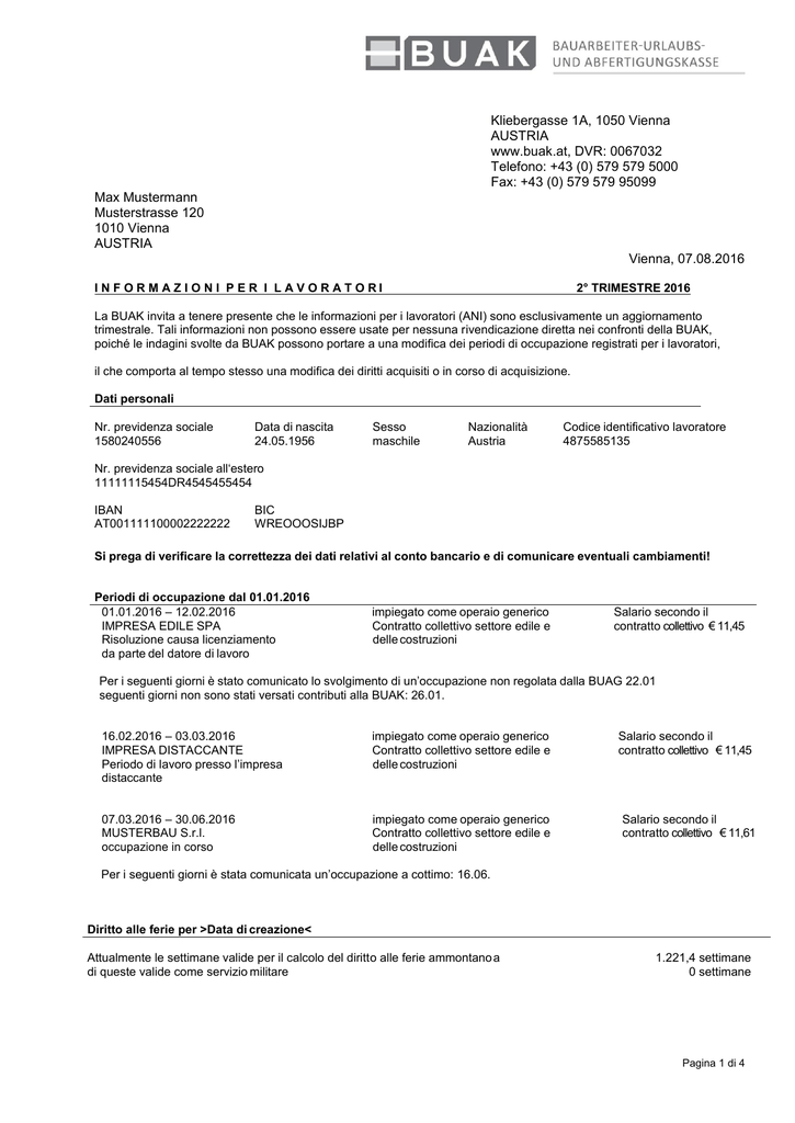 Kliebergasse 1A, 1050 Vienna AUSTRIA www.buak.at, DVR: 0067032 Telefono: +43 (0) 579 579 5000 Fax: +43 (0) 579 579 95099 Max Mustermann Musterstrasse 120 1010 Vienna AUSTRIA Vienna, 07.08.2016 I N F O R M A Z I O N I P E R I L A V O R A T O RI 2° TRIMESTRE 2016 La BUAK invita a tenere presente che le informazioni per i lavoratori (ANI) sono esclusivamente un aggiornamento trimestrale. Tali informazioni non possono essere usate per nessuna rivendicazione diretta nei confronti della BUAK, poiché le indagini svolte da BUAK possono portare a una modifica dei periodi di occupazione registrati per i lavoratori, il che comporta al tempo stesso una modifica dei diritti acquisiti o in corso di acquisizione. Dati personali Nr. previdenza sociale 1580240556 Data di nascita 24.05.1956 Sesso maschile Nazionalità Austria Codice identificativo lavoratore 4875585135 Nr. previdenza sociale all‘estero 11111115454DR4545455454 IBAN AT001111100002222222 BIC WREOOOSIJBP Si prega di verificare la correttezza dei dati relativi al conto bancario e di comunicare eventuali cambiamenti! Periodi di occupazione dal 01.01.2016 01.01.2016 – 12.02.2016 IMPRESA EDILE SPA Risoluzione causa licenziamento da parte del datore di lavoro Iiefj impiegato come operaio generico Contratto collettivo settore edile e Cont delle costruzioni Salario secondo il contratto collettivo € 11,45 Per i seguenti giorni è stato comunicato lo svolgimento di un’occupazione non regolata dalla BUAG 22.01 seguenti giorni non sono stati versati contributi alla BUAK: 26.01. 16.02.2016 – 03.03.2016 IMPRESA DISTACCANTE Periodo di lavoro presso l’impresa distaccante 07.03.2016 – 30.06.2016 MUSTERBAU S.r.l. occupazione in corso Iiefj impiegato come operaio generico Contratto collettivo settore edile e Cont delle costruzioni Iiefj im impiegato come operaio generico Contratto collettivo settore edile e Con delle costruzioni Salario secondo il contratto collettivo € 11,45 Salario secondo il contratto collettivo € 11,61 Per i seguenti giorni è stata comunicata un’occupazione a cottimo: 16.06. Diritto alle ferie per >Data di creazione< Attualmente le settimane valide per il calcolo del diritto alle ferie ammontano a di queste valide come servizio militare 1.221,4 settimane 0 settimane Pagina 1 di 4 Anni di ferie Anni di ferie precedenti (4,8 settimane) Turni di ferie (2,8) 01.01.2015 - 31.12.2015 (52,2 settimane) 01.01.2016 – 30.06.2016 (25,8 settimane) Dritti per >data di creazione<* Godute, Godute, Non godute, Non godute, non compensate non compensate compensate compensate Giorni Compenso Giorni Compenso Giorni Compenso Giorni Compenso Non vengono 2 253,22 € 5 633,05 € 8 1.594,97 € visualizzati t - - - - - - 25 5.054,26 € - - - - - - 12 2.658,92 € - - - 5 - 45 9.308,15 € 253,22 € *il pagamento avviene immediatamente solo nel caso in cui la domanda di ferie sia presentata dall’azienda e l’occupazione sia ancora in corso Elenco ai sensi di §7 par. 6 BUAG - annullamenti Diritto di ferie maturato nell’anno 2014 2015 2016 Numero Giorni* Importo** in € Annullamento in data 5 25 12 253,22 5.054,26 2.658,92 31.03.2017 31.03.2018 31.03.2019 * Si prega di considerare che il numero dei giorni indicato si riferisce anche ai giorni di ferie non goduti ma tuttavia già compensati al momento della data di creazione. **Si prega di considerare che l’importo si riferisce anche ai giorni di ferie già goduti ma non ancora compensati al momento della data di creazione. Occorre considerare che la presentazione della domanda di ferie e il godimento delle ferie devono precedere la data di annullamento. Trattamento di fine rapporto ai sensi della BUAG/ Legge federale sulla previdenza dei dipendenti aziendali e dei lavoratori autonomi (Bundesgesetz über die betriebliche Mitarbeiter- und Selbständigenvorsorge, BMSVG) I rapporti di lavoro presso le imprese edili (ad eccezione dei periodi di occupazione presso le imprese distaccanti) sono regolati dalle disposizioni delle vecchie norme sul trattamento di fine rapporto (BUAG): 803,0 settimane le settimane per il diritto al trattamento di fine rapporto sono 16,8 settimane ulteriori settimane maturate nel rapporto di lavoro in corso: Queste settimane sono incluse nel conteggio nel caso della risoluzione di un rapporto di lavoro che dà diritto all’indennità di fine rapporto. Una parte delle settimane valide per il calcolo del trattamento di fine rapporto è regolata dalla legislazione sulle imprese miste. Opzionale: In data XXXXX è stata già erogata un’indennità di fine rapporto pari a X mensilità. Attualmente le X settimane rimanenti sono memorizzate nel sistema. Opzionale: A partire dal >Data di iscrizione alla cassa previdenziale aziendale< i rapporti di lavoro presso le imprese edili (ad eccezione dei periodi di occupazione presso le imprese distaccanti) sono regolati dalle disposizioni della Legge sulla previdenza dei lavoratori aziendali e dei lavoratori autonomi – Trattamento di fine rapporto, nuovo sistema (“Betrieblichen Mitarbeiter- und Selbständigenvorsorgegesetzes” - Abfertigung Neu). La BUAK calcola l’importo previsto per legge sulla base del salario del contratto collettivo comunicato dall’impresa del lavoratore e versa tale importo con cadenza mensile alla cassa di previdenza aziendale BUAK che gestisce e amministra l’indennità di fine rapporto maturata dal lavoratore in conformità alle disposizioni di legge. L’importo complessivo viene comunicato separatamente al lavoratore al termine di ciascun rapporto di lavoro e in ogni caso almeno una volta l’anno alla data di riferimento del bilancio della BUAK Betriebliche Vorsorgekasse GesmbH. Diritto all’indennizzo delle festività invernali per >Data di creazione< Il suo diritto di rimborso dell’indennizzo per le festività invernali degli anni precedenti ammonta a: Anno 2016/2017 Giorni non compensati Dati completi disponibili soltanto in marzo Settimane computabili 25,8 Importo lordo Dati comp