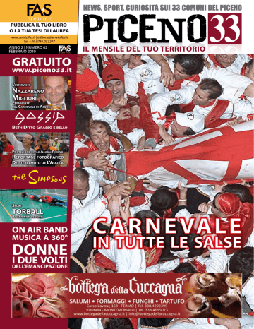 PUBBLICA IL TUO LIBRO O LA TUA TESI DI LAUREA www.servizifas.it | [email protected] Tel. +39.0736.253297 In vendita nelle attività commerciali di Force su www.piceno33.it o telefonando allo 0736.253297 Di Più a Meno! Più acquisti, Meno spendi: i conti tornano al DIS Comunanza - Grottammare - Grottazzolina a MARZO su Piceno33 L’intervista | Alessandro Nardoni: un fotografo Ascolano per Sky e il National Geographic. indice delle inserzioni Astri nascenti | Almus Band. 02 03 05 07 08 09 12 13 14 16 18 19 Due passi a... | Villa Seghetti, borgo storico a Castel di Lama. indice Spettacolo | Ribalta Picena, il teatro a San Benedetto. 05l’articolo del mese 23TQ Shopping Angels 06 l’approfondimento 24l'intervista La Vero di Ascoli | Remise en forme: propositi per il nuovo anno. Dimensione Fumetto | Animazione da Oscar: i cartoni animati conquistano Hollywood. Music-L | La Roux: We Love Electronic! Mensile di informazione sulla provincia di Ascoli Piceno. www.piceno33.it Anno 2 | Numero 02 | Febbraio 2010 Direttore responsabile: Nicoletta Tempera Le Sfojose | Eco Service DIS discount Grafica | Articoli Pubblicitari Risto music pub Pizzerie Ristoranti Agriturismi | Aziende Agricole Alimentari Per la casa Imprese edili Editoria Salute e benessere Il prezzo dell'emancipazione Sold out per Elio e le Storie Tese Casa di Giobbe: otto arresti nel "lager" La Madonna di Loreto in Diocesi 07ultime notizie News, notizie, curiosità dai 33 comuni del Piceno Sagre, tradizione e cultura Collaboratori: Albertino Federici, Alberto Premici, Alessia Rossi, Andrea Gagliardi, Daniele Rubatti, Enrico Cherri Lepri, Giuseppe Capasso, Laura Castelli, Marco Corradi, Mario Pasqualini, Maurizio Vannicola, Luciano Casali, Paolo Sciamanna, Sabrina Capponi, Silvia Forcina, Tommaso Annibali, Valerio Carradori, Veronica Antonucci. 17 speciale Copertina: Bove Finto di Offida. 20due passi a... Grafica ed impaginazione: Fas Editore Stampa: Tipografia Da.Sa. - Ascoli Piceno Amministrazione: Fas s.r.l. | V.le Marcello Federici, 143 - 63100 (AP) Tel. 0736.253297 - www.servizifas.it Pubblicazione mensile registrata presso il tribunale di Ascoli Piceno n°479 del 9/09/2009. ACQUASANTA TERME Panetteria Fratelli Cetani - Via Roma 4 Bar Sport Piazza Terme 19 Bar Terme - Piazza Terme 1 Bar B&G - Santa Maria Rist. Peperino - Frazione S. Maria 109 ACQUAVIVA PICENA Bar Belvedere - V.le G. Leopardi 5 Bar II Crepuscolo - V.le Gì. Leop. 180 Bar La Paesana - Viale G. Leopardi 31 Bar Rlst. Divei - Cont. Abbadetta 20 Bar Rlst. Da Pina - Via L. Da Vinci 6 Hotel Abbadetta - Via Abbadetta 36 APPIGNANO DEL TRONTO Bar Charly Max - Via Roma 78 Bar del Corso-Via Roma 8 ARQUATA DEL TRONTO Bar La Rocca - Piazza Umberto I” 1G Bar Petrucci - Via Salaria (Trisungo) Blue Bar - Via Salaria (Trisungo) Panetteria Cappelli - Via Salarla 2 ASCOLI PICENO Allegròs Bar - Ospedale Mazzoni ArchiCafè - Facoltà di Architettura Chiostro dell’Annunziata - Viale della Rimembranza 1 Bar Antonucci - Viale della Repubblica, 12 (di fianco alla questura) Bar Arizona-Via Napoli 18-20 Bar Aurora-Viale Federici 65 Bar Centrale - Piazza del Popolo 9 Bar Delfino - Piazza Arringo 41 Bar Delfino 2 - Via Murri 36 Bar Break - Zona Indust. Basso Marino Bar della Stazione - P. della Stazione 8 Bar delle Caldaie - Via Tranquilli 51 Bar Ferretti - Piazza del Popolo 32 Bar Fuori Porta-Viale Treviri 149 Bar Ideal - Piazza Arringo 34 Bar Lori - Corso Mazzini 153 Bar Marconi - Viale Marconi 31 Bar Michael - Corso Mazzini 225 Bar Mozzano - Via Salaria 5 (Mozzano] Bar Musical - Via Giuseppe Verdi 26 Bar Perugia - Via Perugia 29 Bar Piceno - Via Rigante 24 Bar Pretoriano - Via Pretoriana 14 Bar Stadio - Viale Costantino Rozzi Bar Tazza d’oro - Corso Mazzini 231 Brecciami Bar-(Brecciarolo) Caffè Bistrò- Via Vidacilio 12 Caffè Damata - Viale M.Federici 129 Caffè delle Rose - C. C. Oasi Caffè Meletti - Piazza del Popolo 20 Caffè Royal - Viale Benedetto Croce 1 Centro Commerciale Oasi Cherry One - Via Erasmo Mari 24 Edic. La Casetta - Via dei Frassini snc 04| Edic. Panichi Gianni - P. Arringo 36 Gelateria Monardi - Largo 440° 5 Libreria Rinascita - Piazza Roma 7 Mad Cafè-Largo 437° 5 Matrix - Via Cesare Battisti 22 Migliori - Piazza Arringo 2 Mondo Pizza - Largo 440° 10 Nicolas Caffè - Piazza del Popolo Papillon-C.C. Oasi Pasticceria Angelini - Viale B. Croce 62 Pasticceria Angelo Centro - P. Sim. 91 Pasticceria Angelo Monticelli Pasticceria Angelo Via Napoli Pasticceria M. e P. - Via Emidio Luzi 87 Pizzeria Italia - Corso Mazzini 205 Piz. Peccato di Gola - Corso V. Em. 13 Rist. Peperoncino - Via di Vesta 28 Tabaccheria Bonfini- Via Tevere 12 Tabaccheria Maestri - P. del Popolo 47 Tabac. Guerrieri Enrica - P. Arringo 44 Tabaccheria Volponi - Via Napoli 128 Tigre - Viale Indipendenza 21 Unicam - Via Pacifici Mazzoni 2 Yogurteria Yoghi - Piazza Arringo 39 CARASSAI Bar Central Cafè - Piazza Matteotti 2 Caffè XX Settembre - V.le XX Set. 37 Route66 - Via Risorgimento 4 CASTEL DI LAMA BarCaprice-Via Po 26 Bar del Cinema - C.C. Città delle Stelle Bar Sport - Via Salaria 124 Caffè Italia - Città delle Stelle - Zona Industriale Campolungosnc Caffè Sonia- Via Sdraia 21 Sister’s Cafè - Via Roma 79 Topas Y Tapas - C.C. Città delle Stelle CASTIGNANO Bar di Su - Piazza Umberto I” 14/15 Caffè del Borgo - Borgo Garibaldi 15 Hotel rist. Teta - Borgo Garibaldi 100 CASTORANO Caffè Dolce Vita - P. G. Leopardi 14 Green Bar - Via Roma 31 Tiffany Wine Bar-Via Salaria 60 COLLI DEL TRONTO Bar Colli - Piazza 25 Aprile Bar La Plaza - Piazza del Popolo 4 Bar Marcita - Piazza G. Garibaldi 6 Bar Moderno - Via Salaria 144 Caffè Dolce e Salato - Via Salaria 47 COMUNANZA BarSagi- Via Trieste 114 Bar Centrale-Via Dante 18/20 Colorado Cafè - Piazza Garibaldi 5/8 Dis - Via Pascali Nazzareno Migliori racconta il suo Carnevale 25spettacolo Peranna vive e sogna per Montemonaco 26music-l Beth Ditto... più generosa che mai 27 astri nascenti On Air Band 28dimensione fumetto The Simpson 29la vero di A